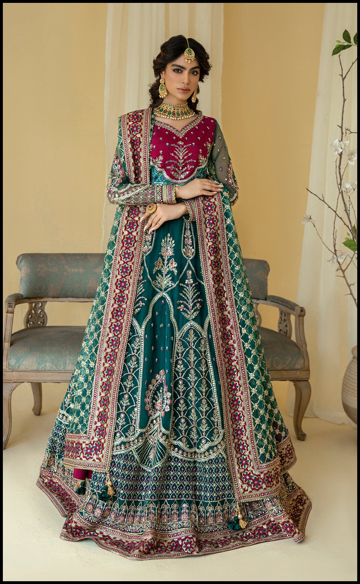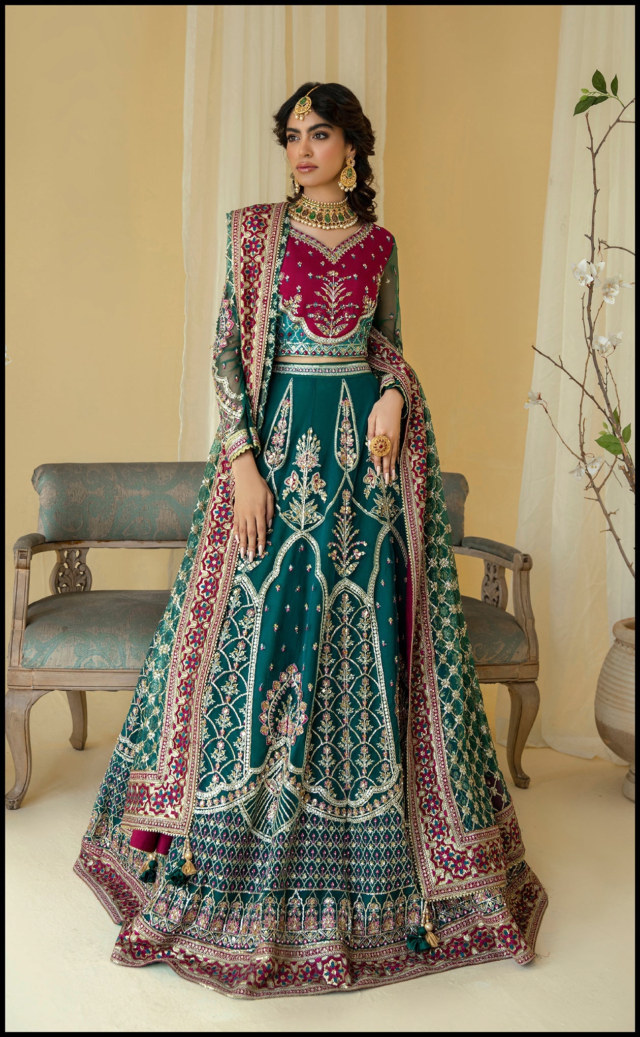 This lehenga choli is crafted with the idea of representing sheer joy and gleam dipped in emerald green hue encapsulated on the soft net canvas. A kalidar lehenga ornamented with miraculous embroidery, gota and naqshi work further glorified with contrast burgundy pink color choli. It is carried with a traditionally touched heavily embroided net dupatta finished with contrant raw silk borders making a perfect Mehndi outfit to cherish your special moments.