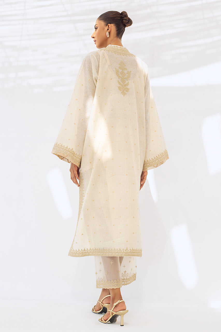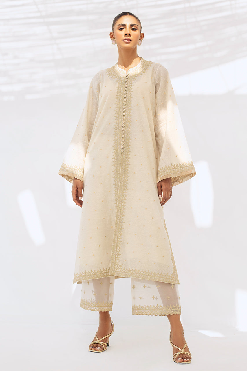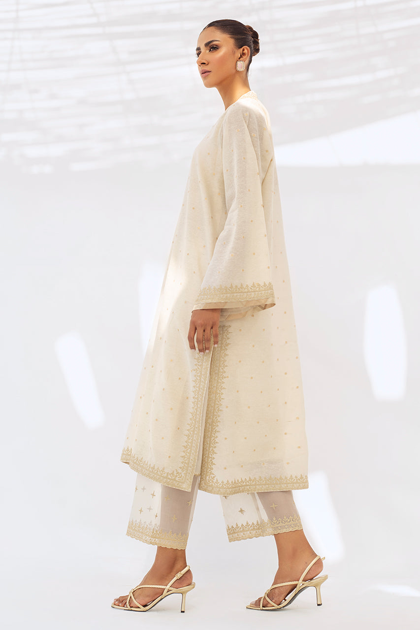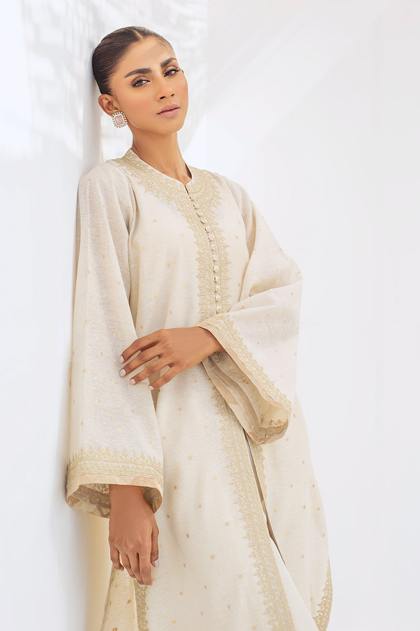 A long ivory woven karandi kurta is detailed with thread work around the neckline and sleeves that exudes classic elegance. The outfit is paired with matching karandi izaar trousers.