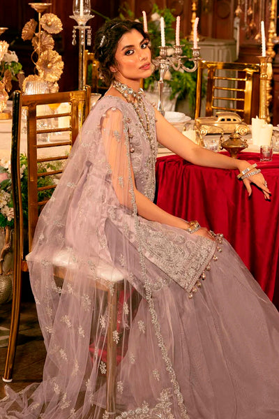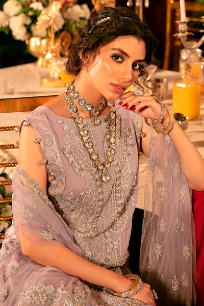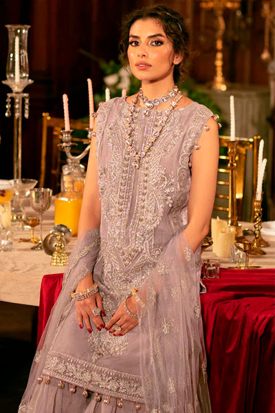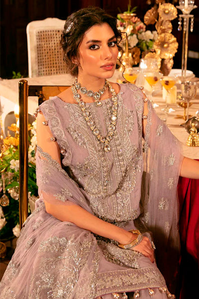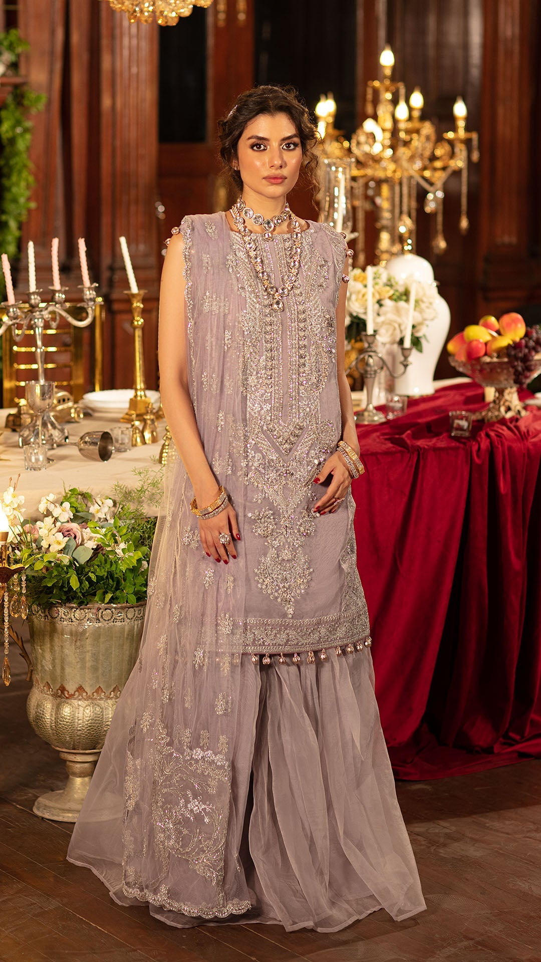 - A crepe lavender shirt that has handcrafted detail of adda work embroidery on front sleeves, and borders. It is paired with stunning embroidered dupatta and organza sharara that gives it lavishing look with embroidered borders.