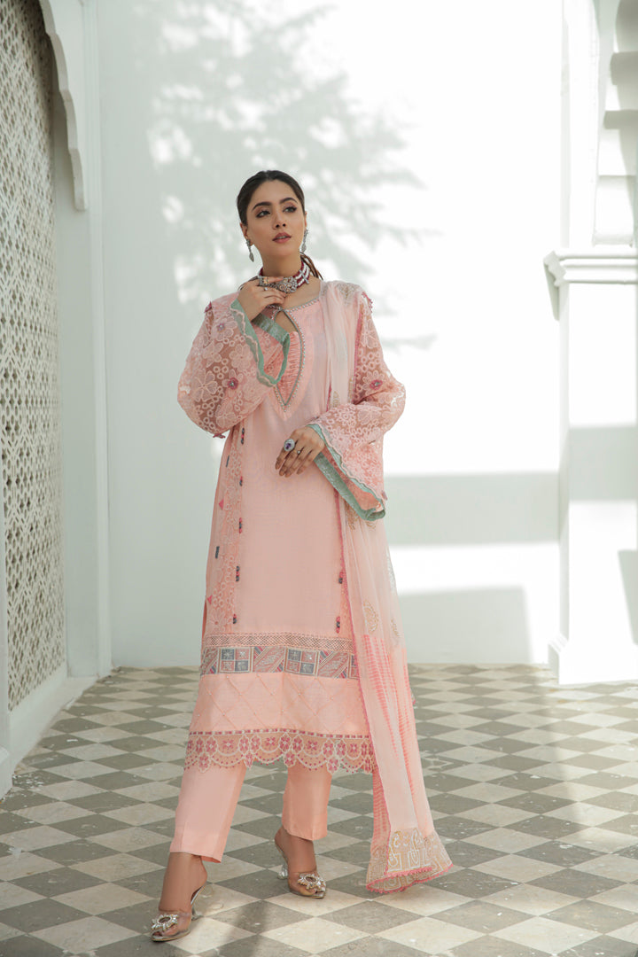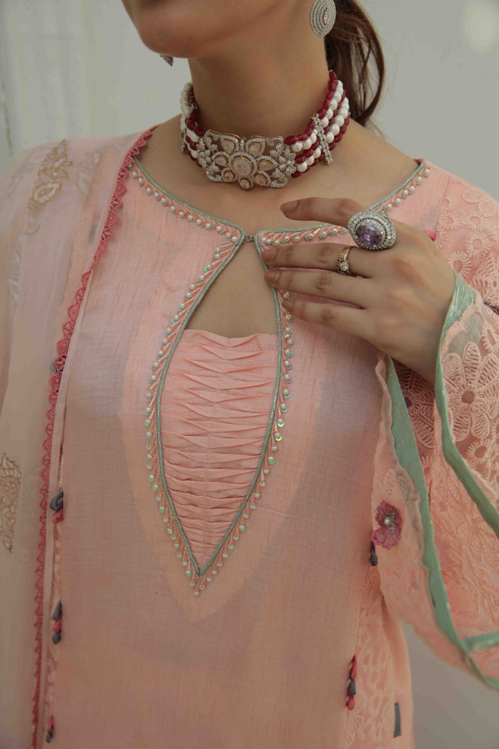 Description: Is a powder pink korean rawsilk base shirt beautifully stitched with lace details, pleatings, and embroidered borders and embroidered sleeves.. Neckline is embellished with crystals and swarovskis. Paired with chiffon block printing dupatta.
