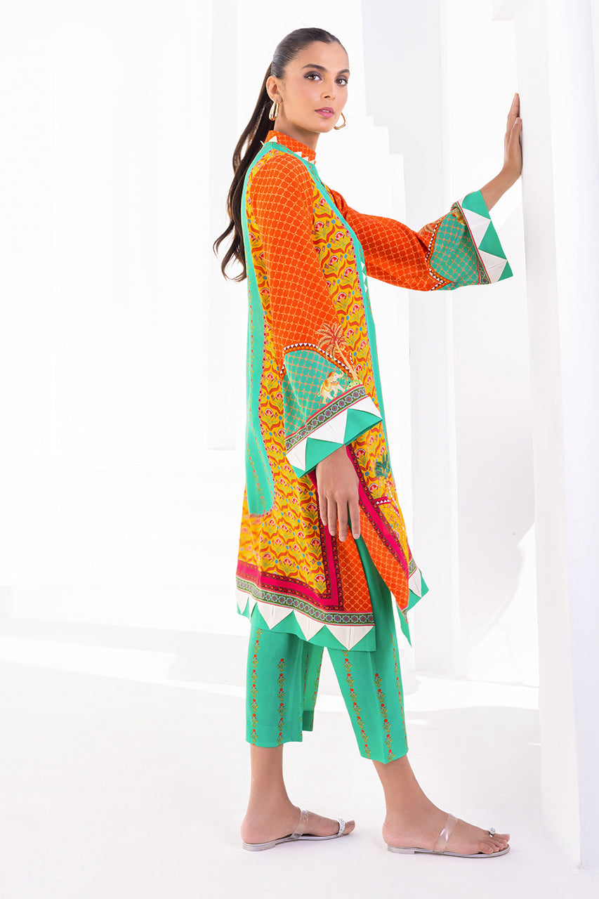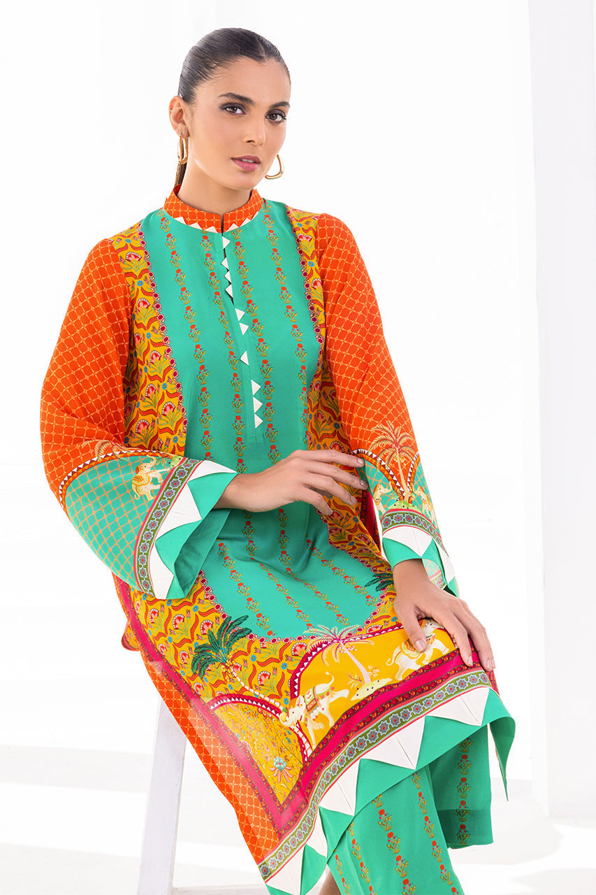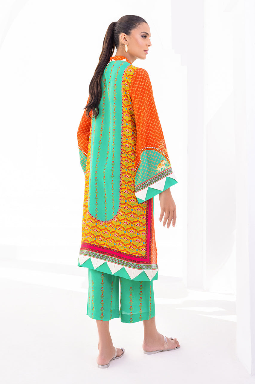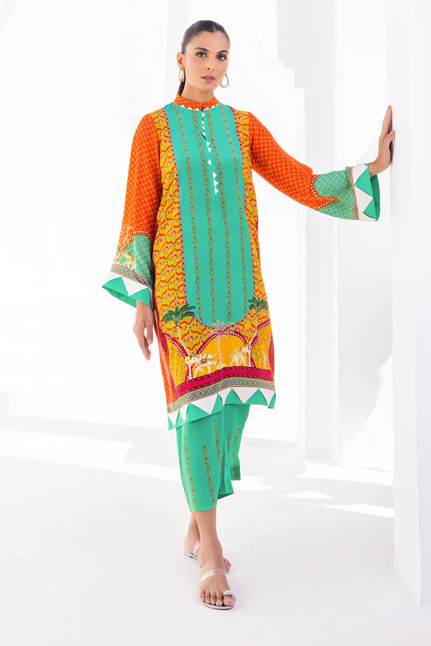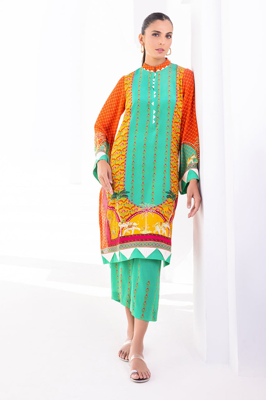 A relaxed silhouette with striking colors and a signature SM print makes for an elegant crepe kurta. Fabric manipulated boders along the sleeves and hem finishes the piece. This kurta can be paired with our signature printed crepe culottes.
