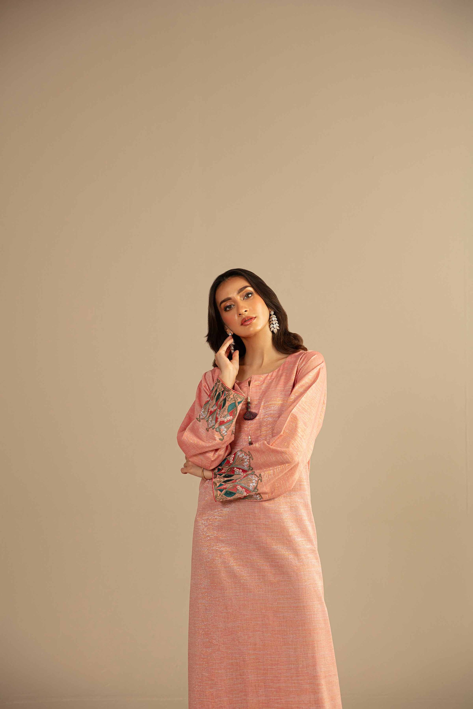 Round Neckline With Piping, Slit & Tassels Detail, Embroidered Bell Shape Sleeves