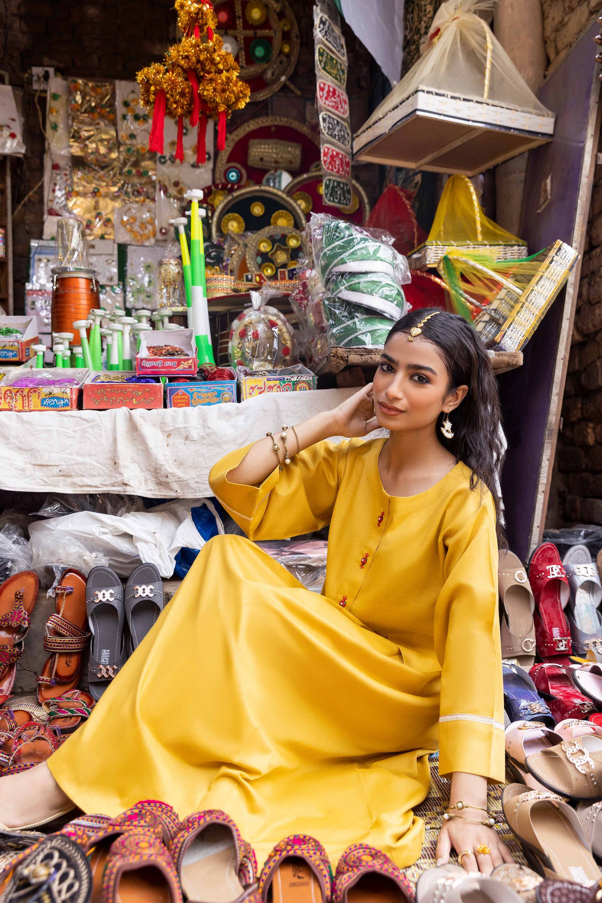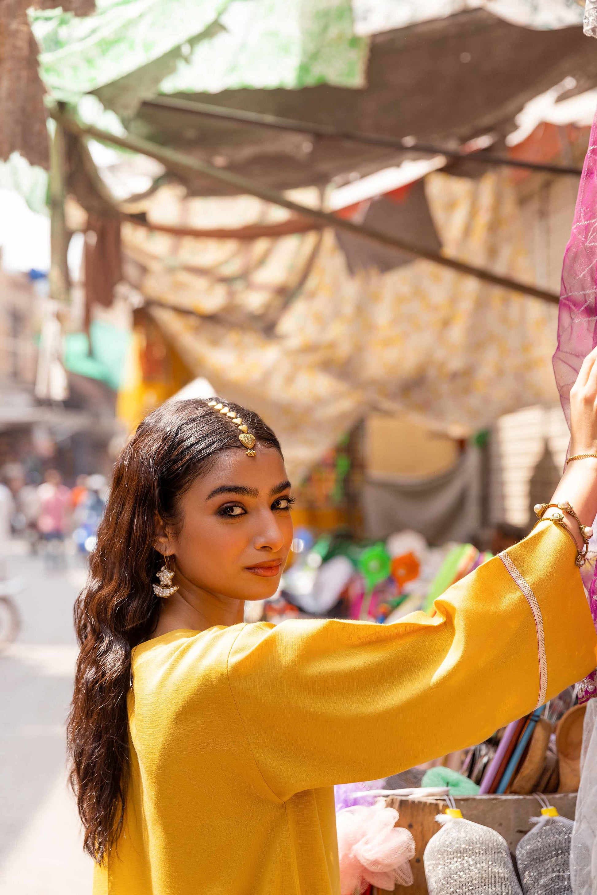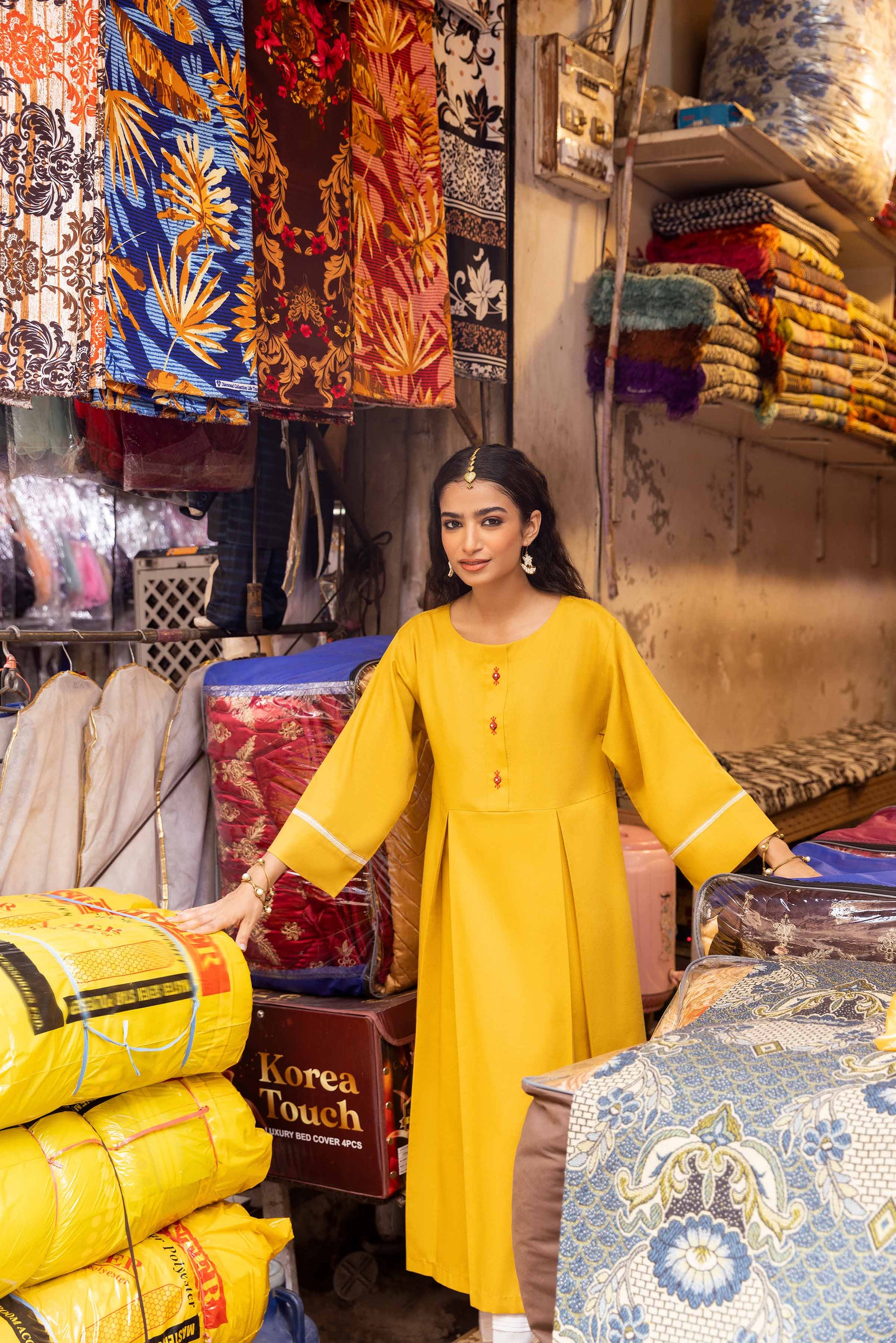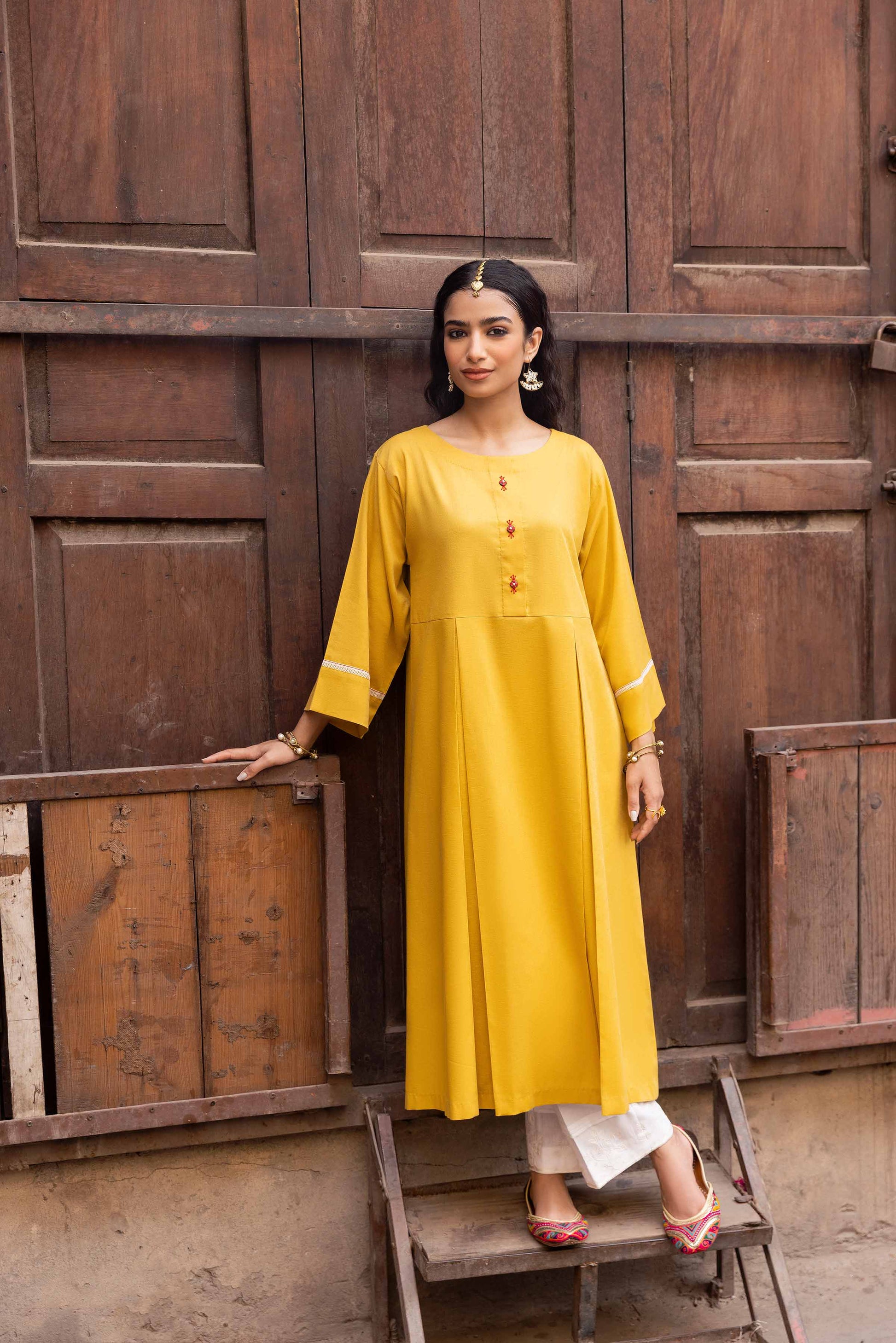 Round Neckline With Adda Work, Lace Insertion At Sleeves, Front Yoke With Box Pleats Detail