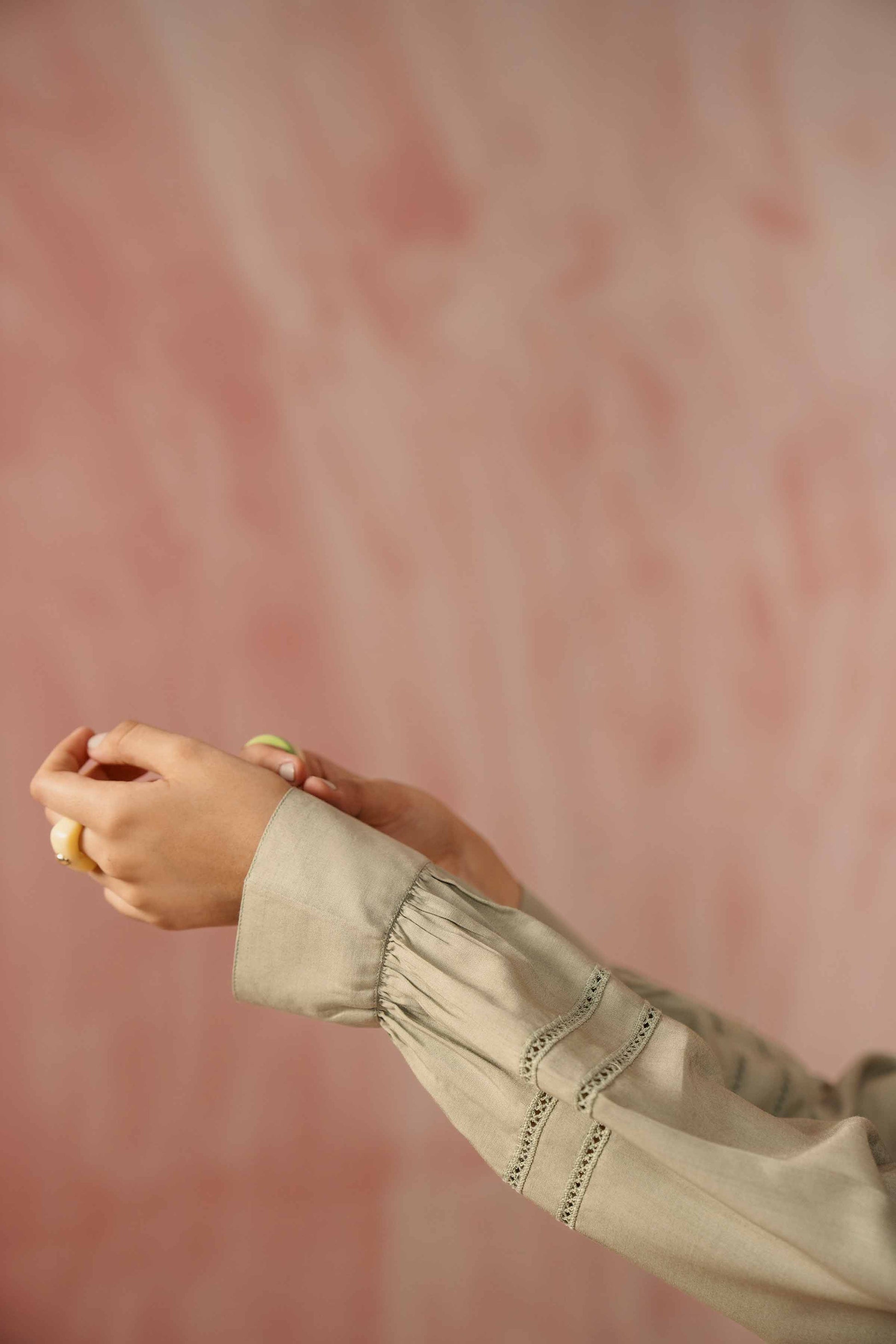 Band Neckline With Placket, Buttons Detail At Placket & Cuffed Sleeves With Tarkashi Detail