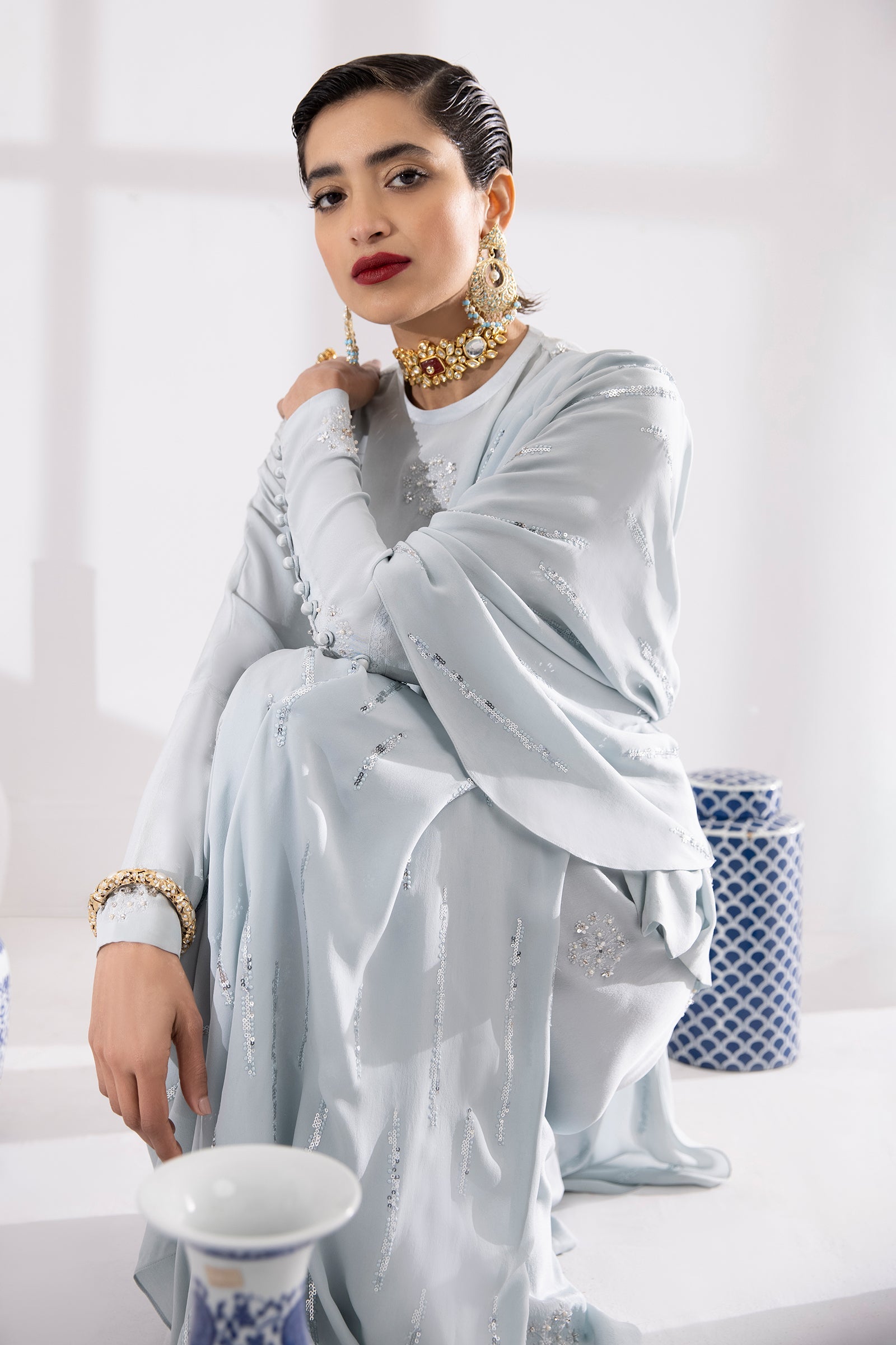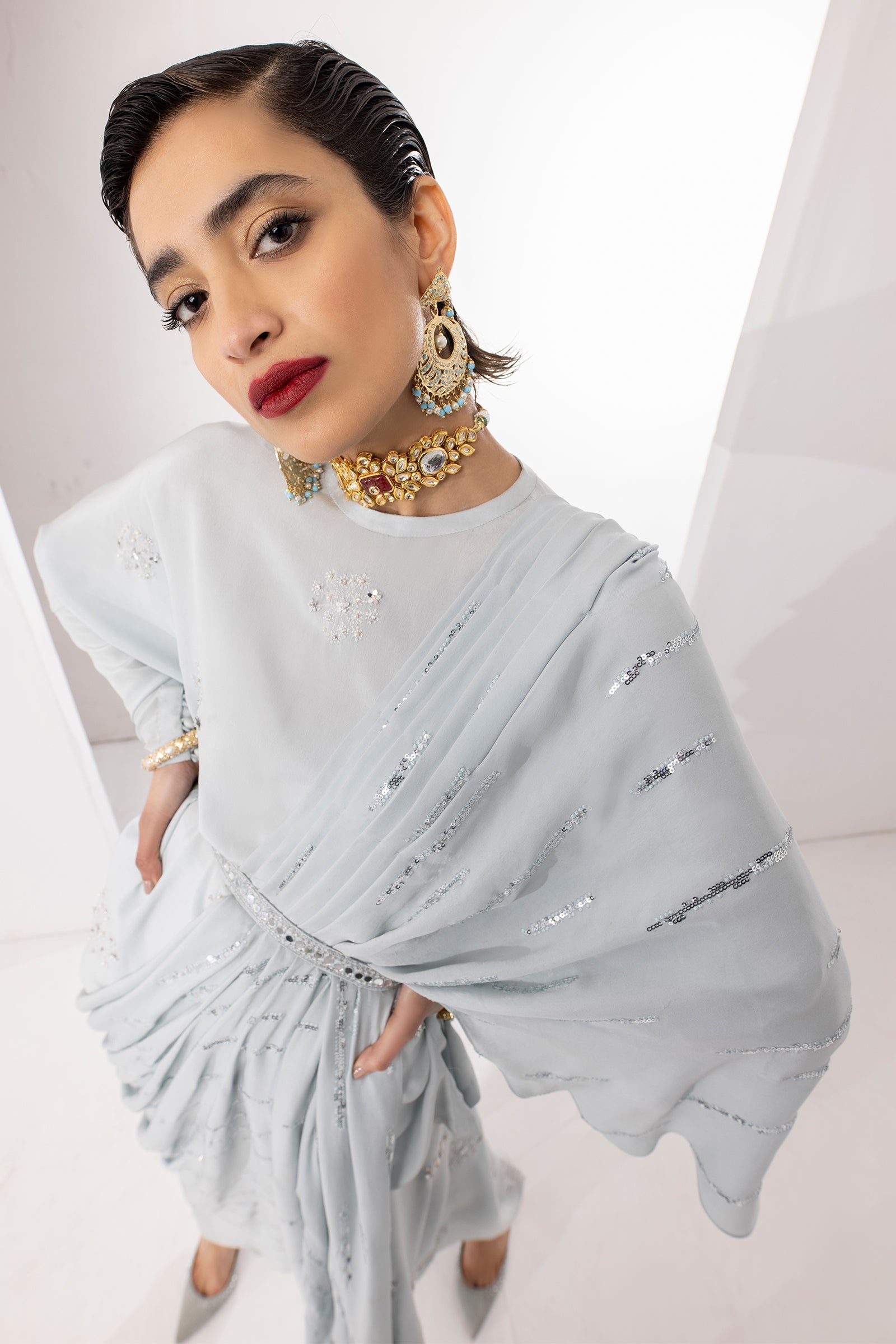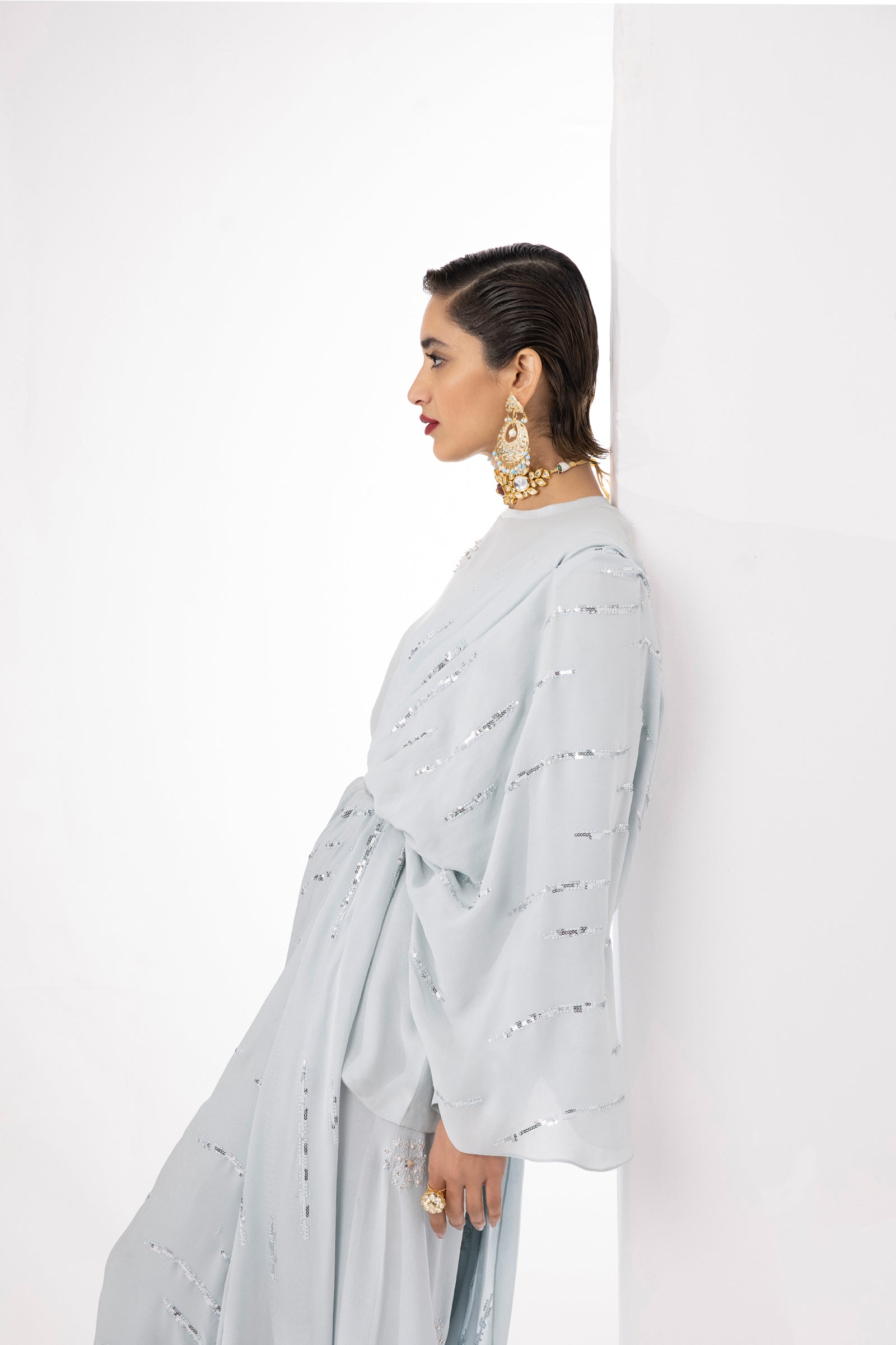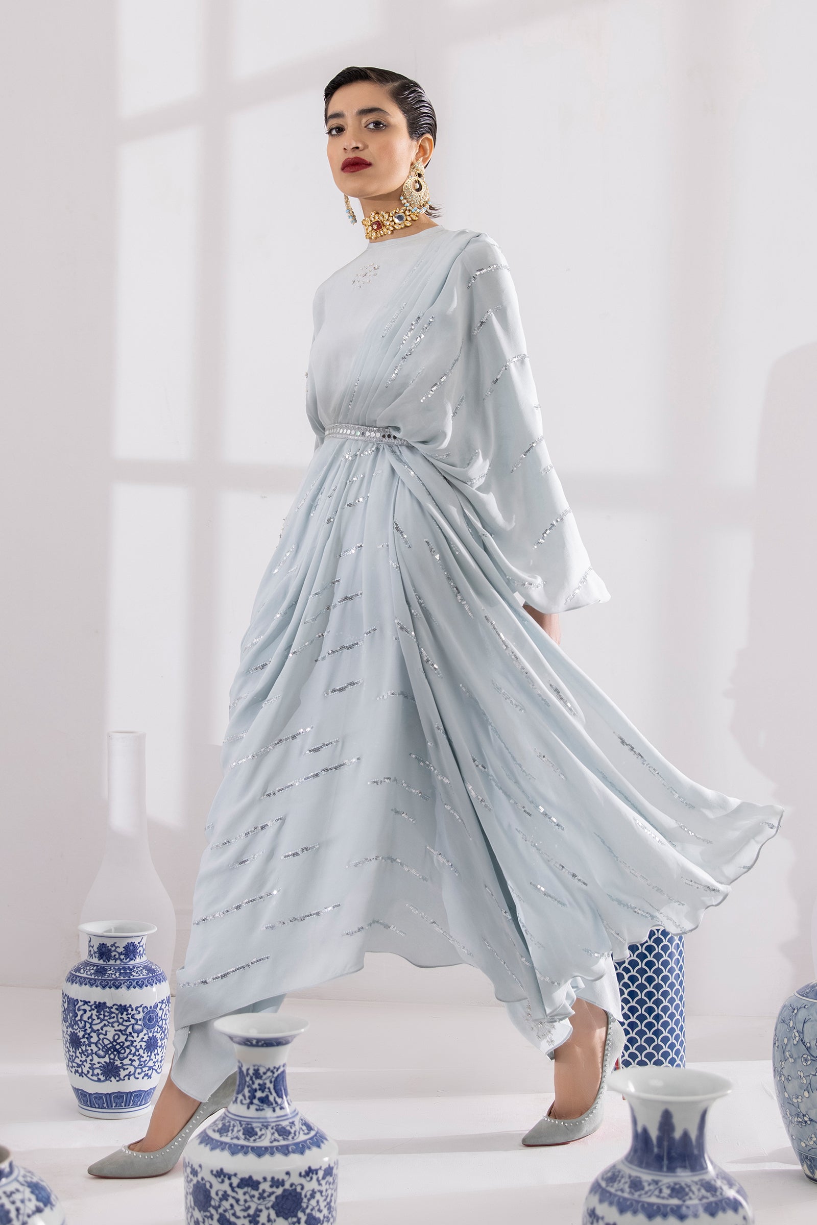 Artémis; an exquisitely draped ice blue silk gown is minimally embellished with sparkling details. The most versatile of evening looks this ensemble will take you effortlessly from festive events to evening soirees.
