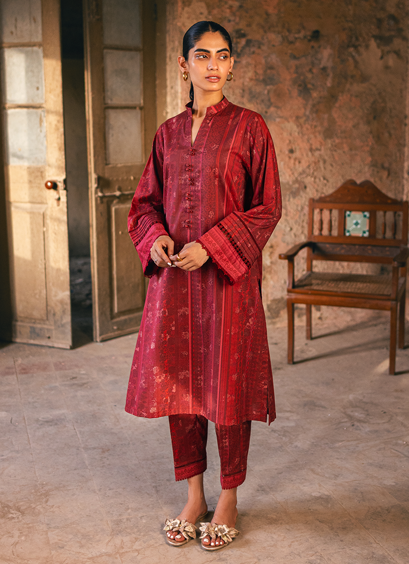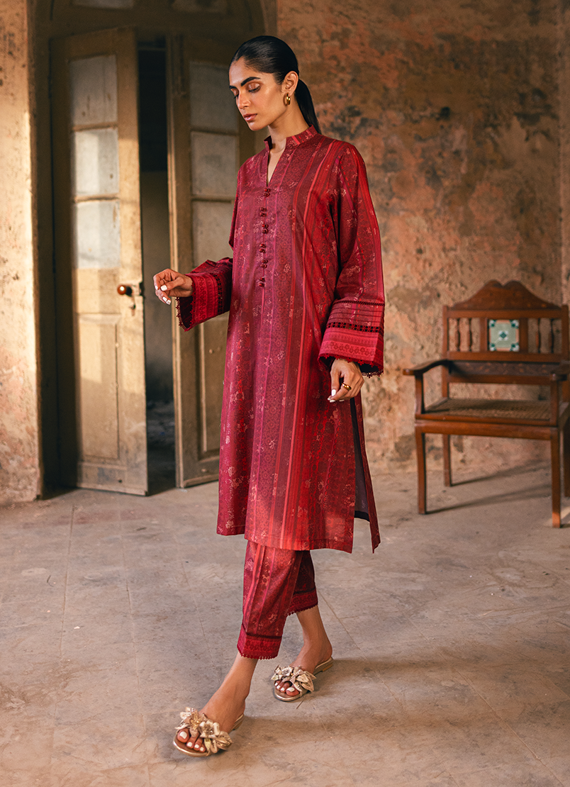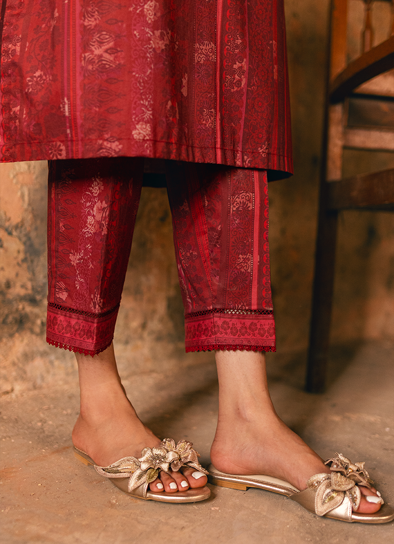 Crafted from the finest pure cotton, this eye-catching co-ord set features a striking red print. Delicate lacework and intricate pintex details on the sleeves add to its charm and allure. Accompanied by matching pants, the ensemble becomes a versatile choice suitable for a variety of occasions.