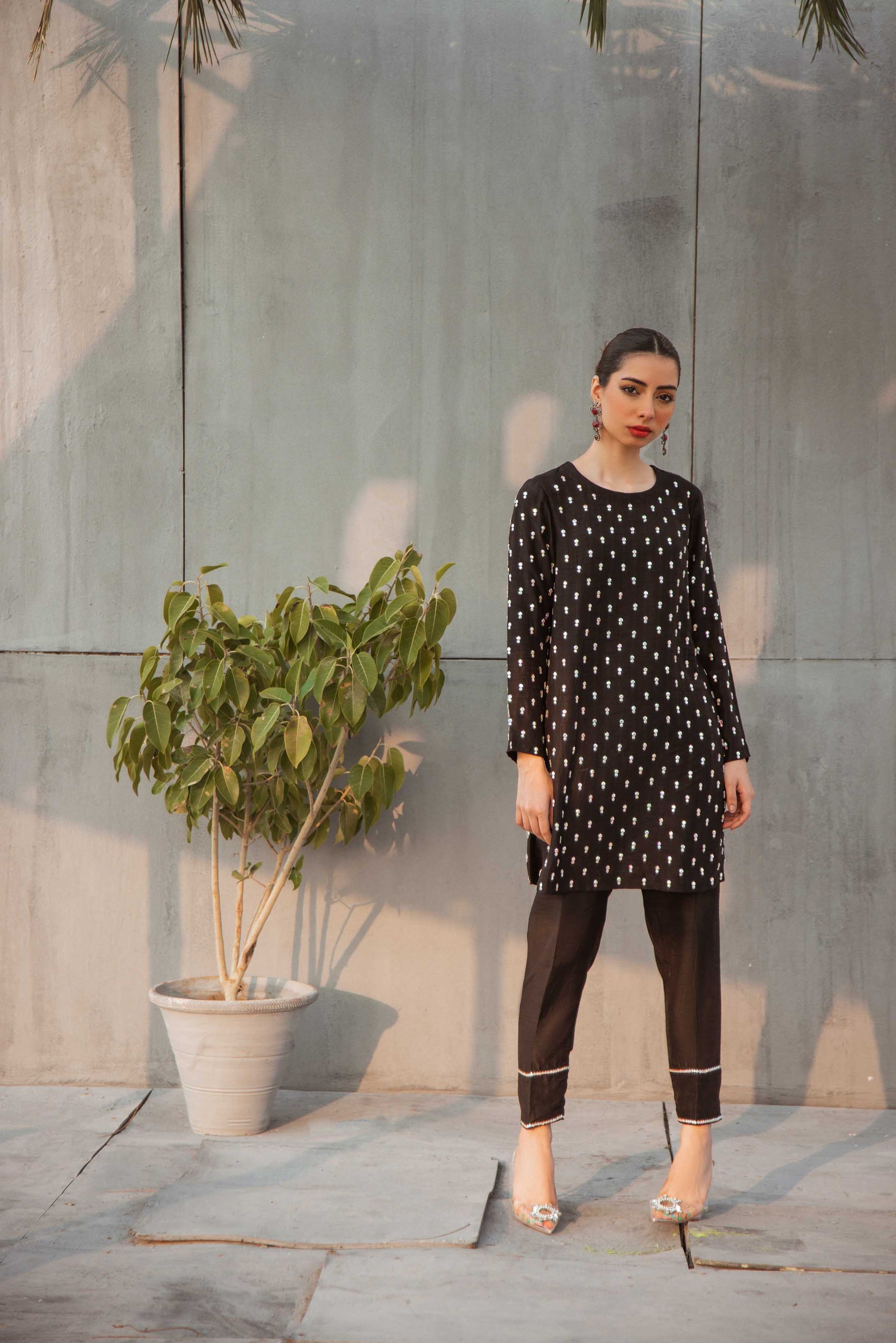 Lamhay is a two piece pure korean rawsilk fully hand embellished outfit. The multi colored Swarovski stones are super bling and festive for this season. Paired with embellished straight pants.