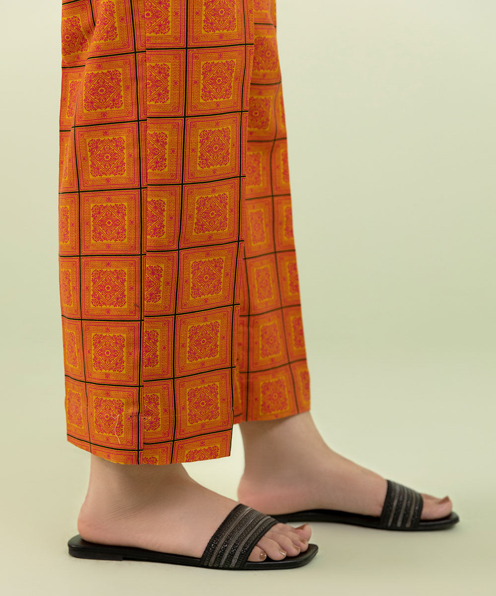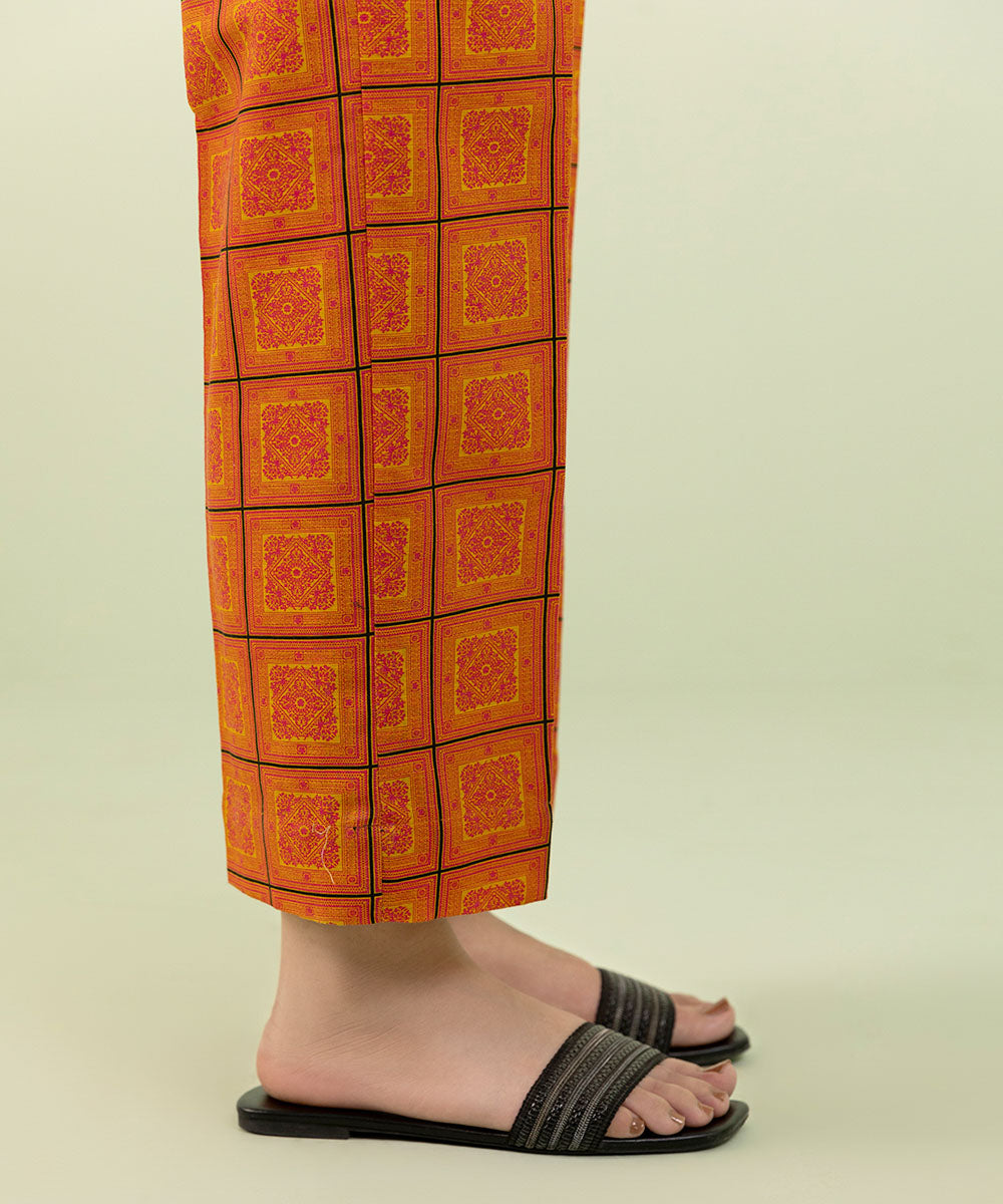 Pair your outfit with our orange printed straight pants.