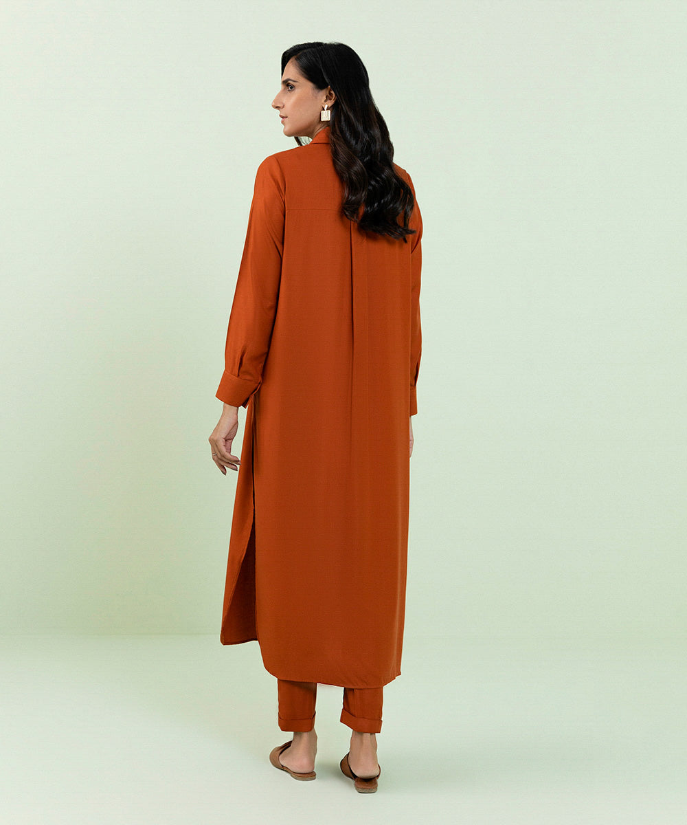 Our burnt orange straight button down kurta features a collar with placket.