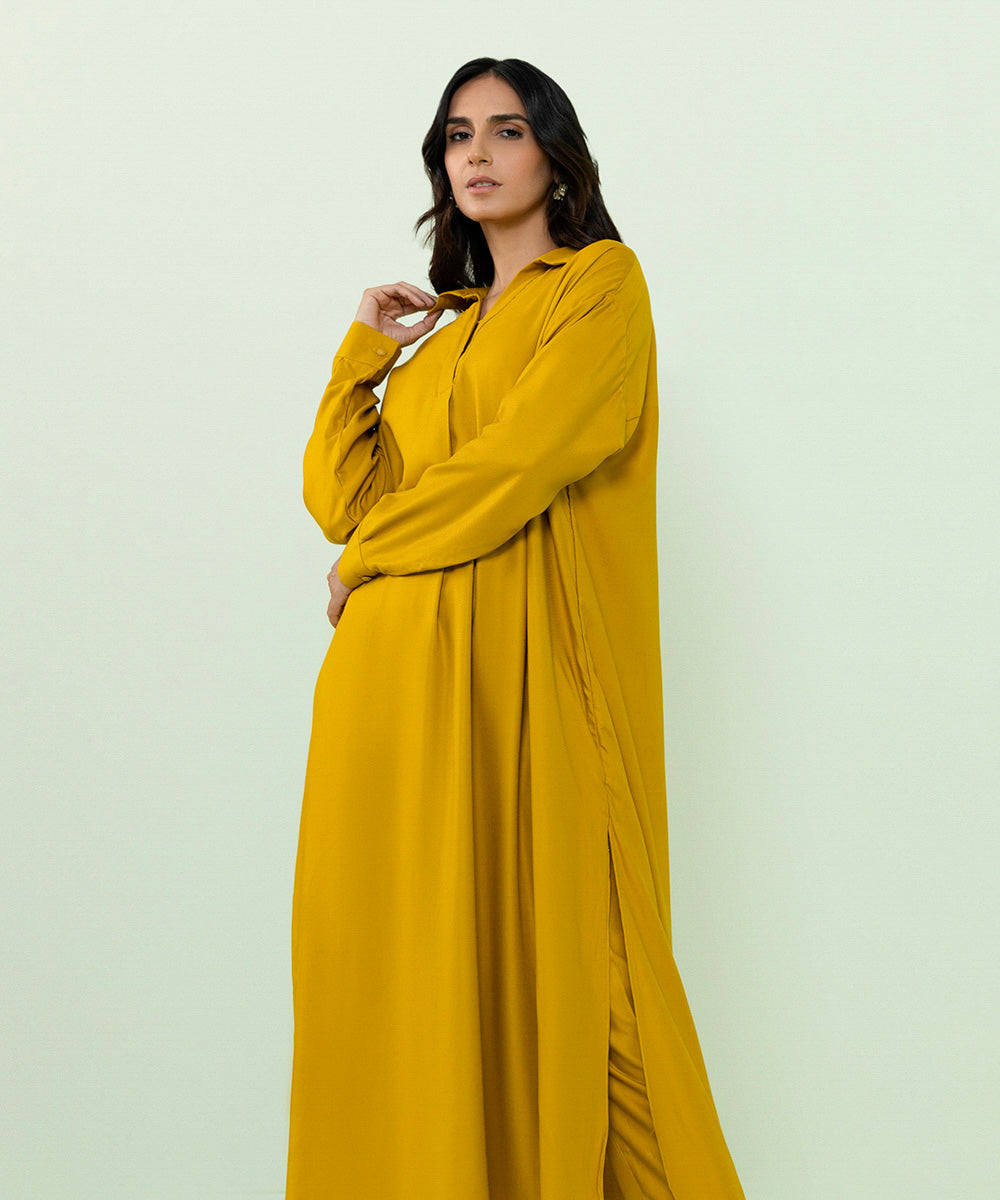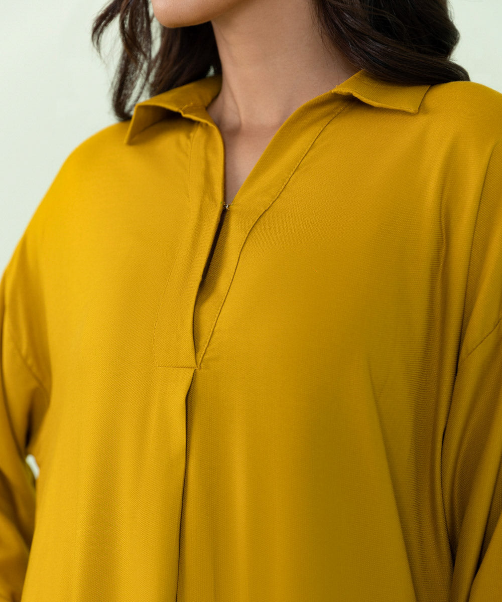 Elevate your style with our mustard straight shirt accented with a collar neckline with a slit.