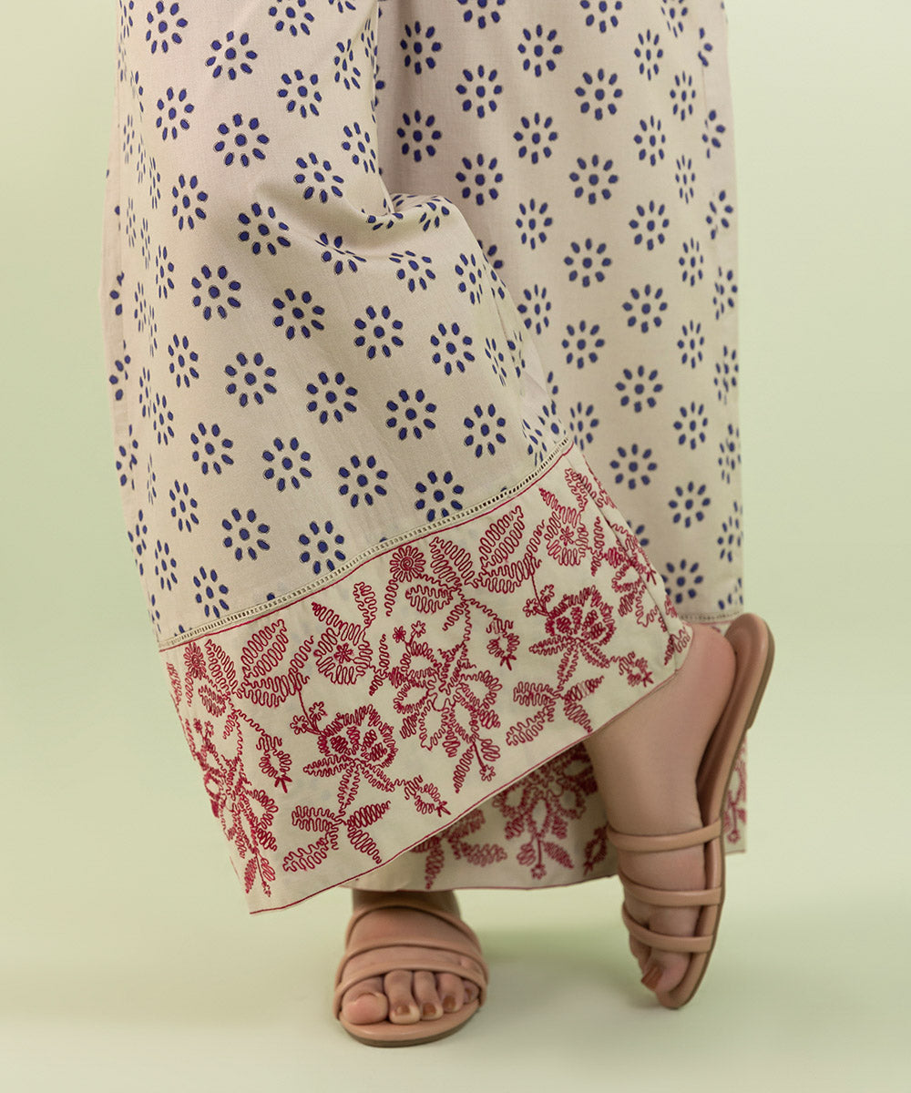 Our white printed culotte is accented with an embroidered hem for an elevated look.