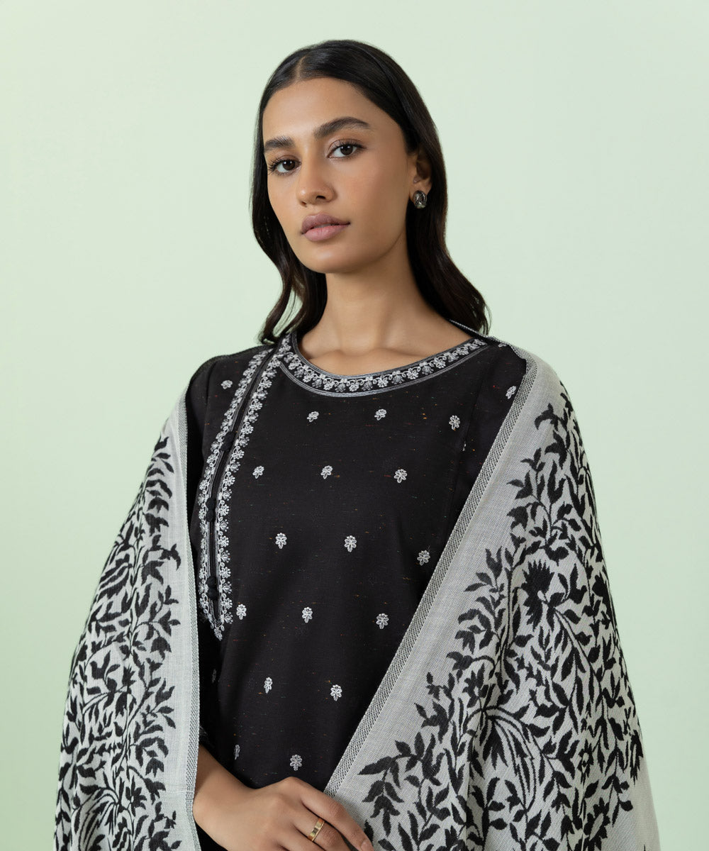 Elevate your style with our black three-piece featuring embroidered shirt and shalwar, paired with a blended shawl.