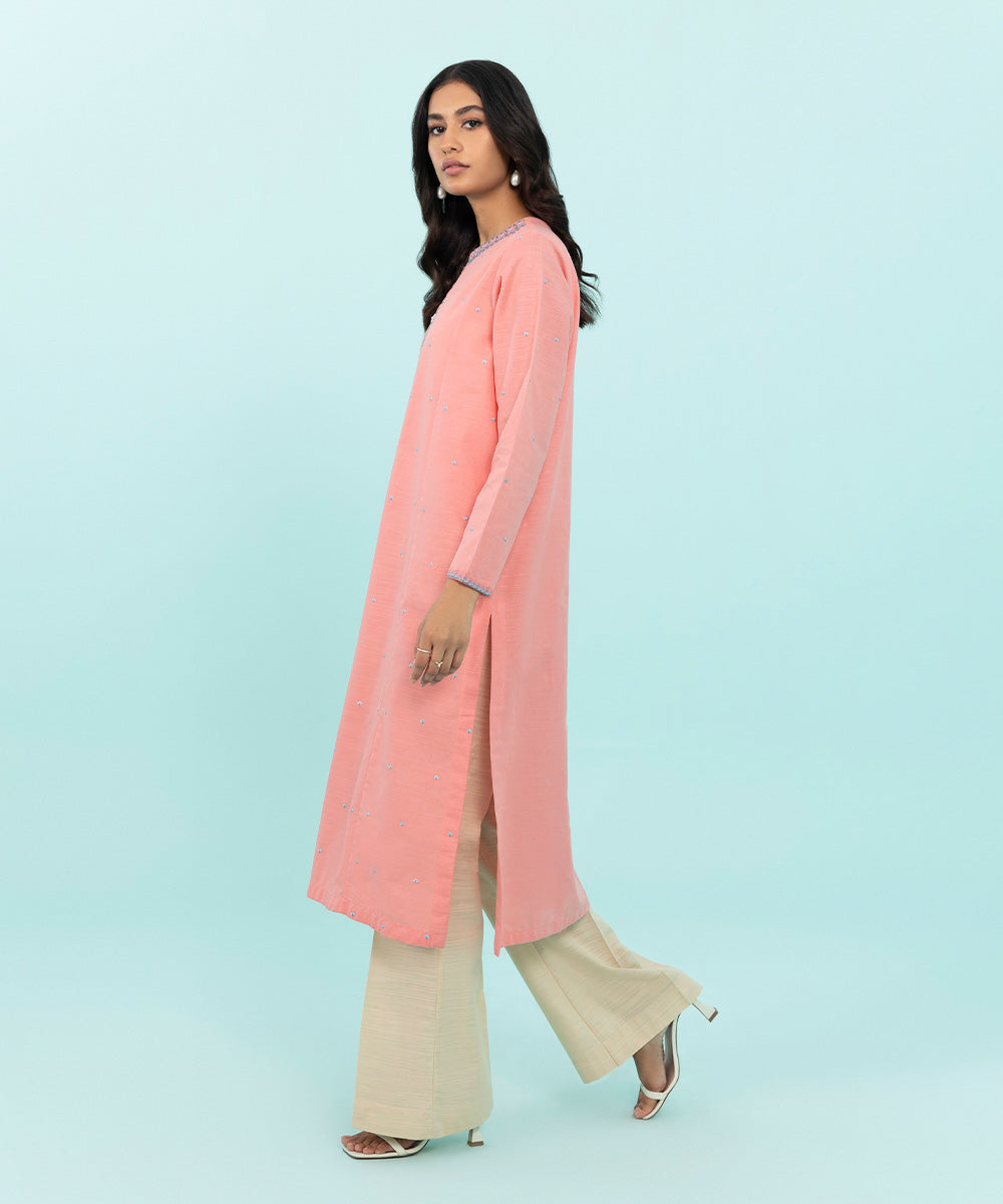 This winter season, upgrade your wardrobe with our pink silhouette accented with embroidery detail.