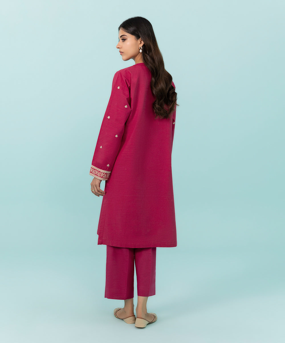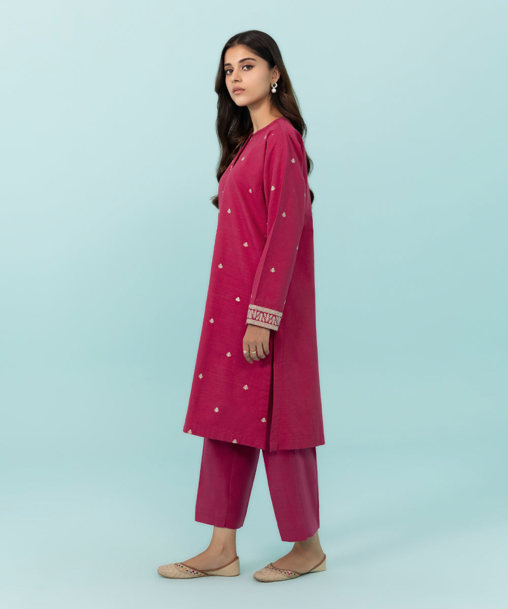This winter season, upgrade your wardrobe with our pink silhouette accented with embroidery detail.