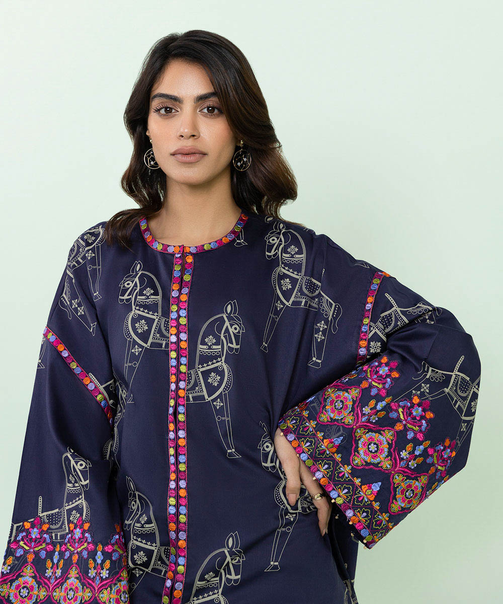 Printed Front With Embroidery, Printed Back, Full Sleeves, Round Neckline