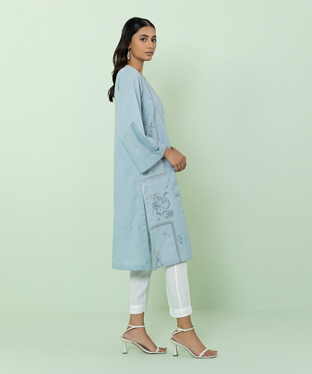 Uplift your style with our sky blue straight shirt featuring intricate embroidery patterns.