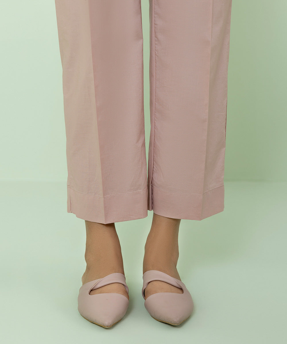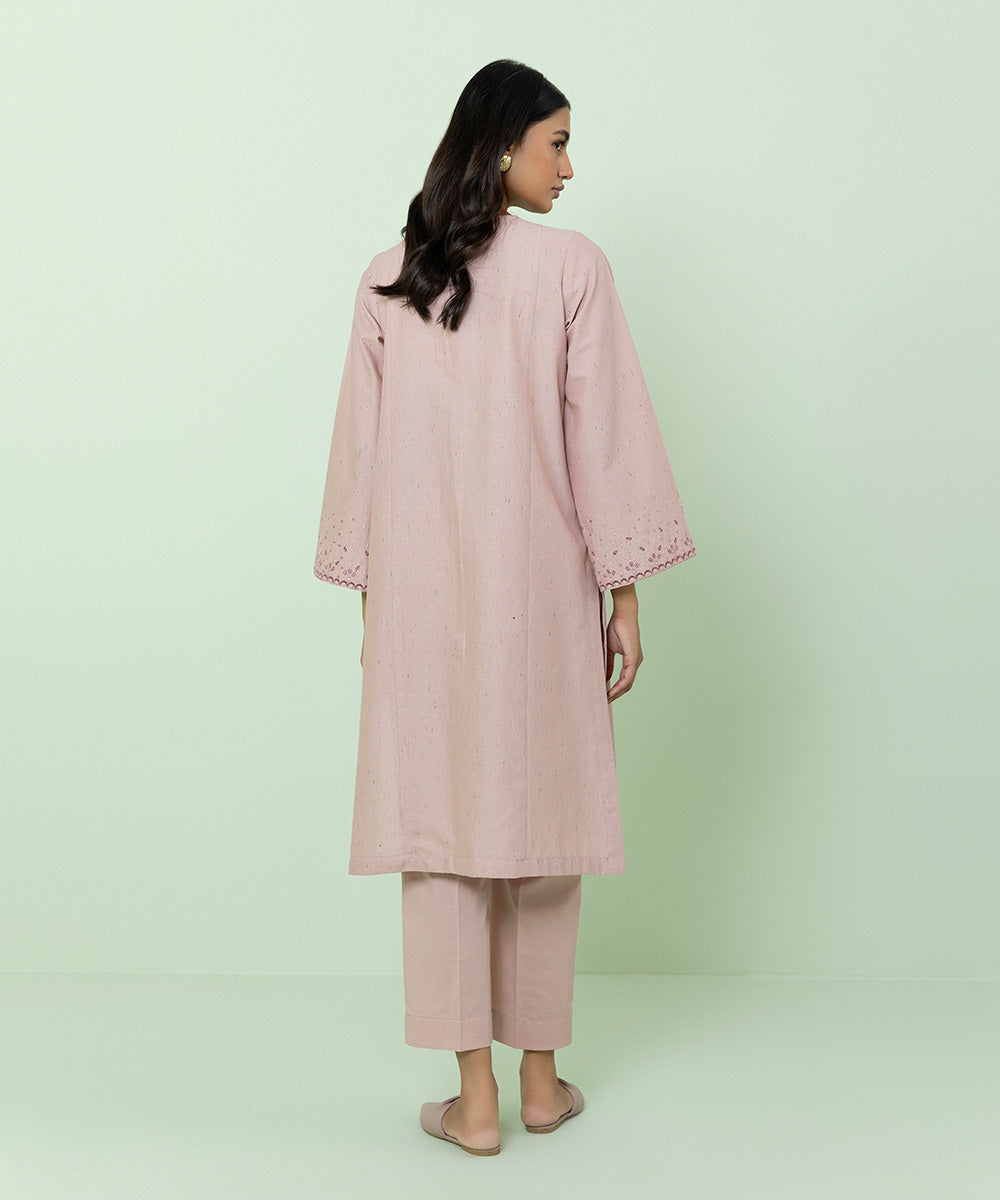 Embrace winter season with our dull pink intricately patterned two-piece featuring kurta and straight pants .