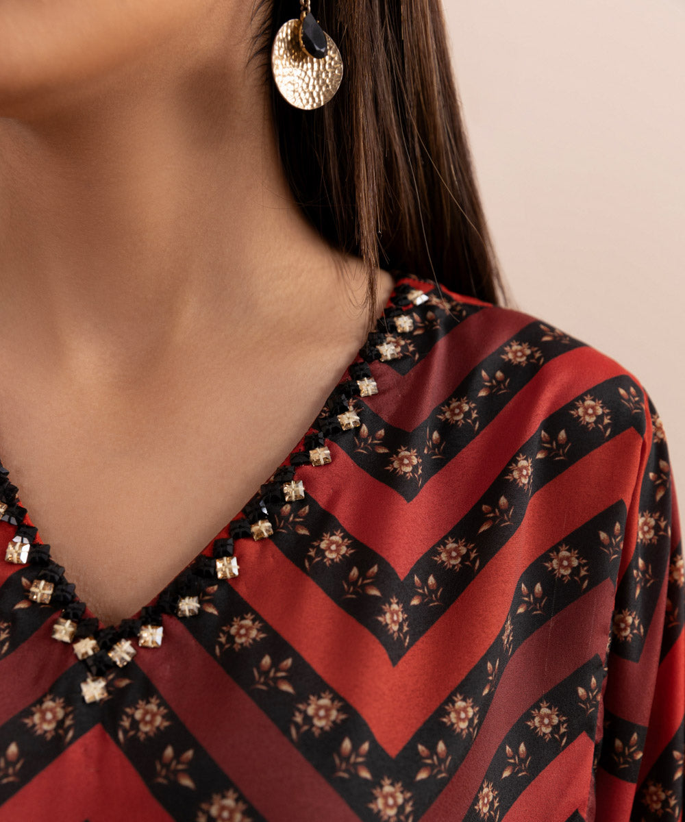 Printed Front With Embellishment, Printed Back, Full Sleeves, V Neckline