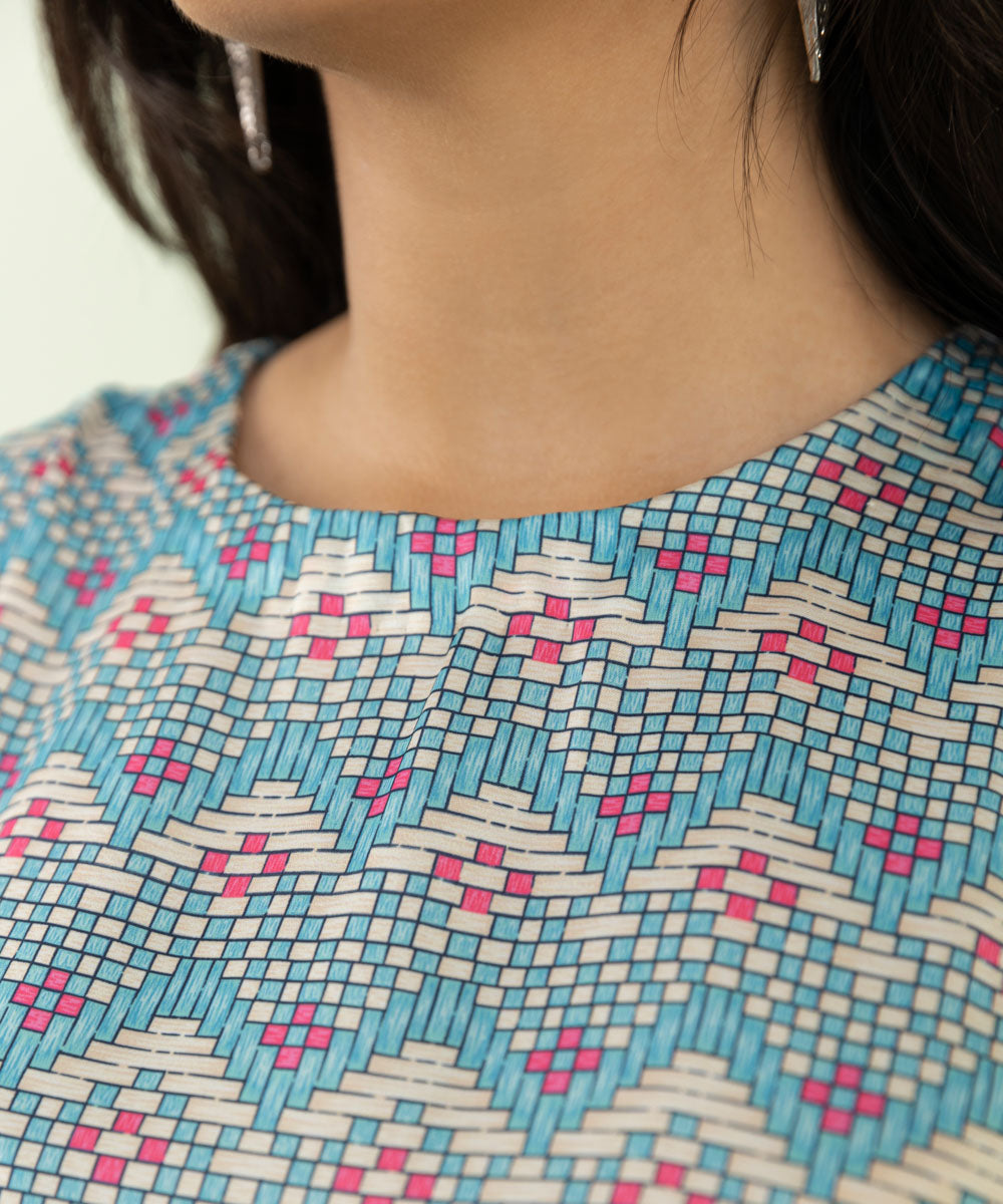 Our blue sleeveless silk kameez features intricate patterns and is paired with a printed shalwar.