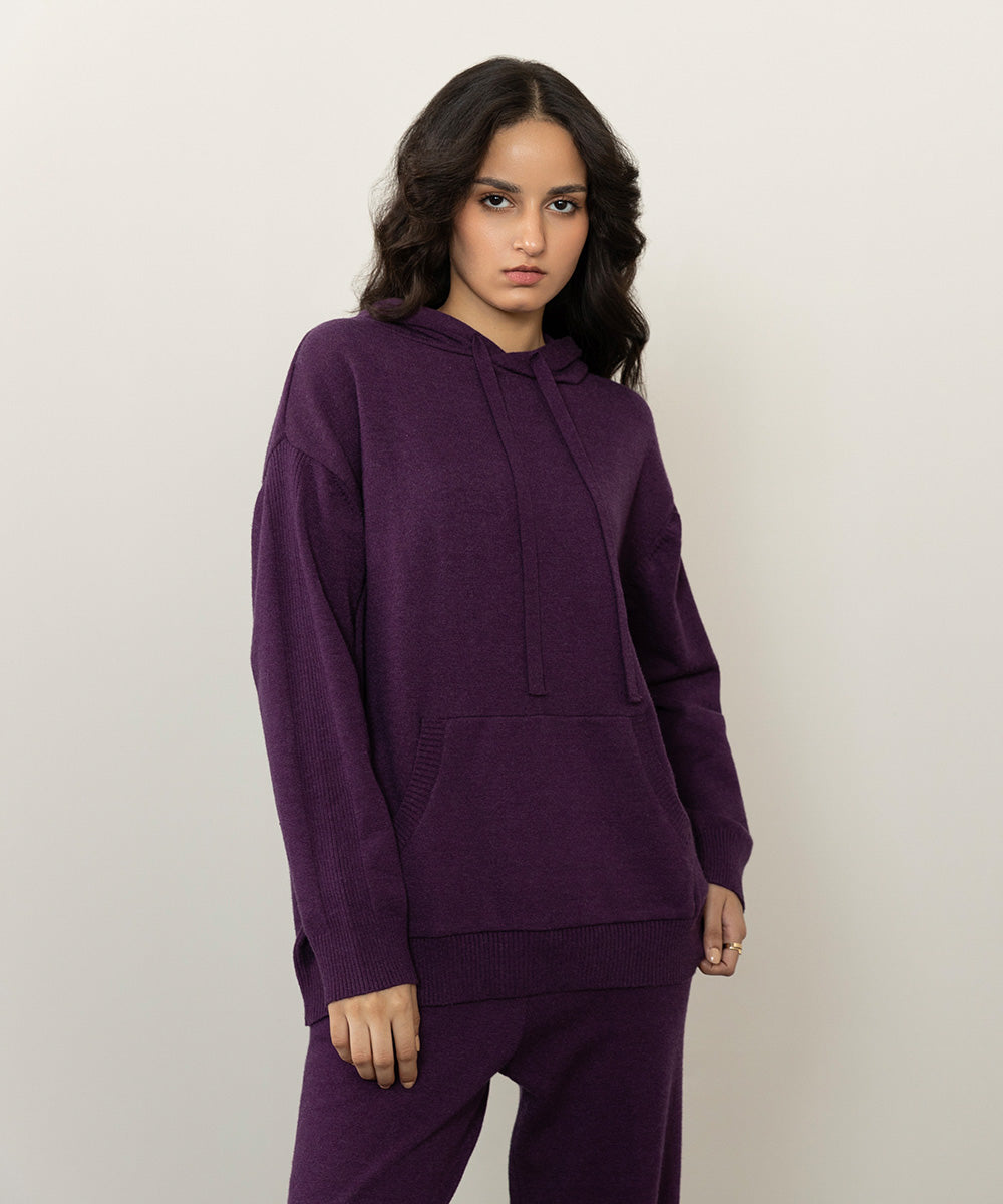 Knit hoodie with front pockets. Full sleeves with ribbed detail.