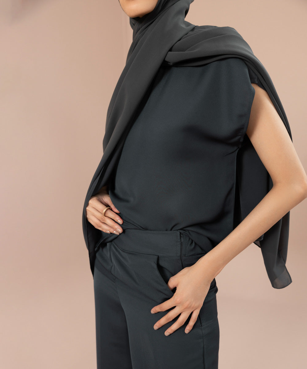 Loose-fit top in drapey fabric with round neck and kimono short sleeves. Side slits and back closure.