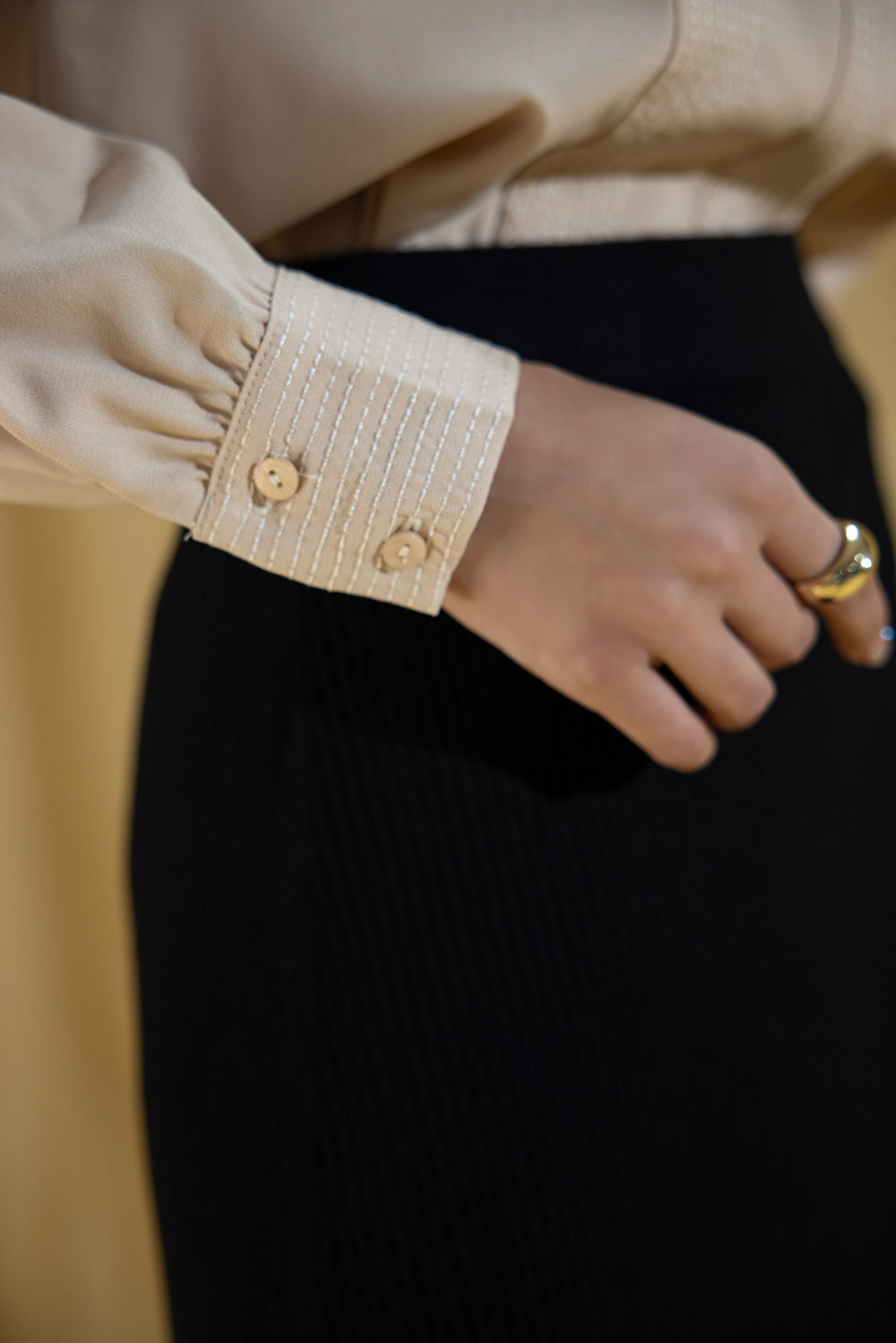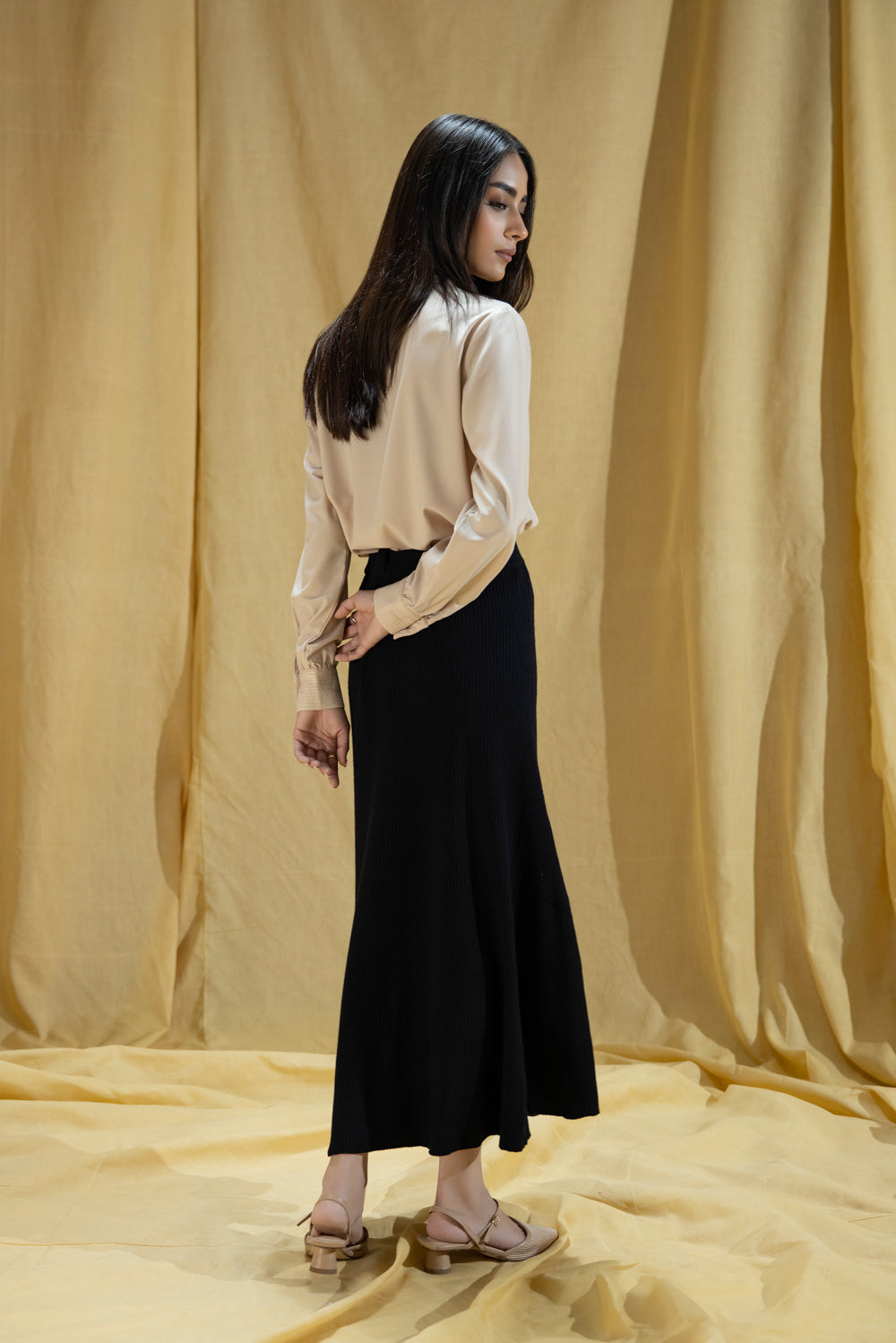 Black cropped button through shirt with white stitch detail on placket, cuff and collar. Full sleeves with cuffs.