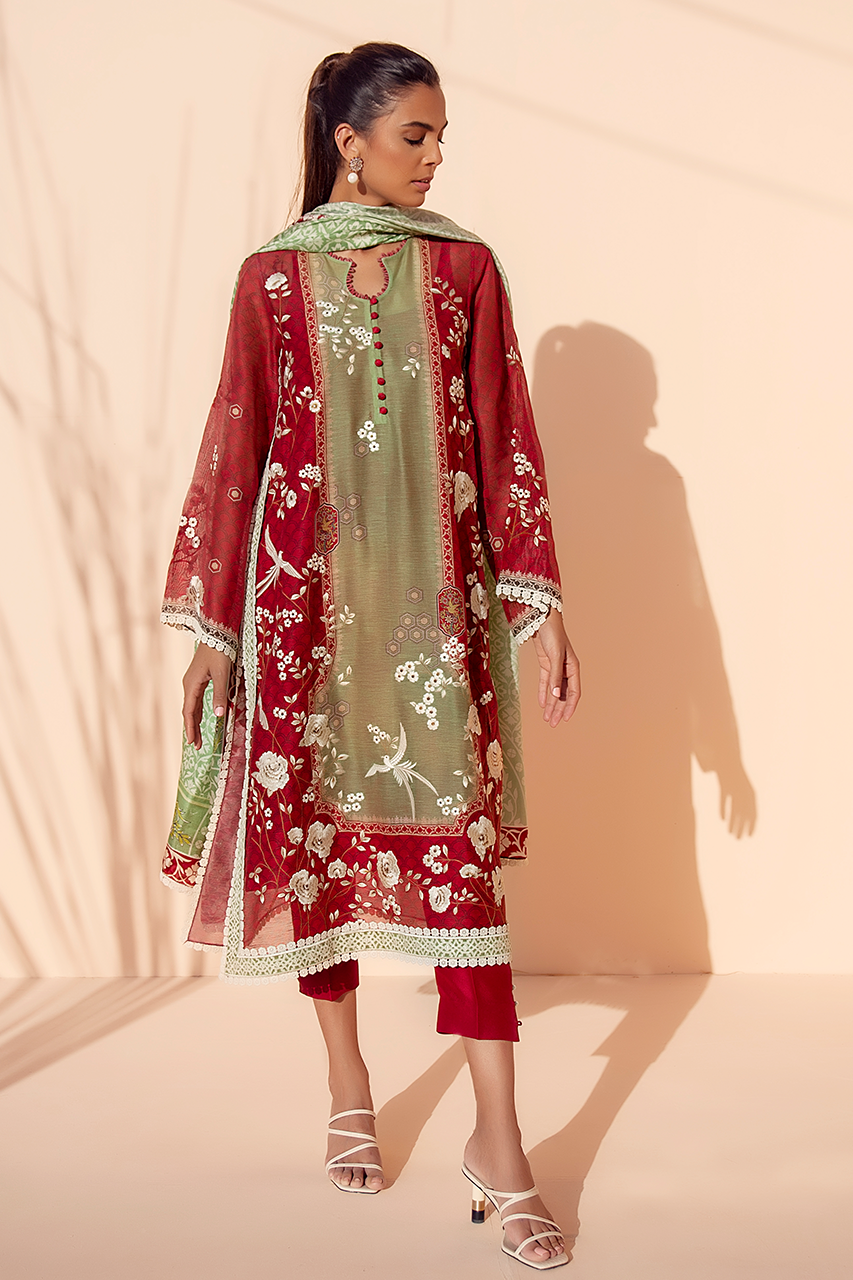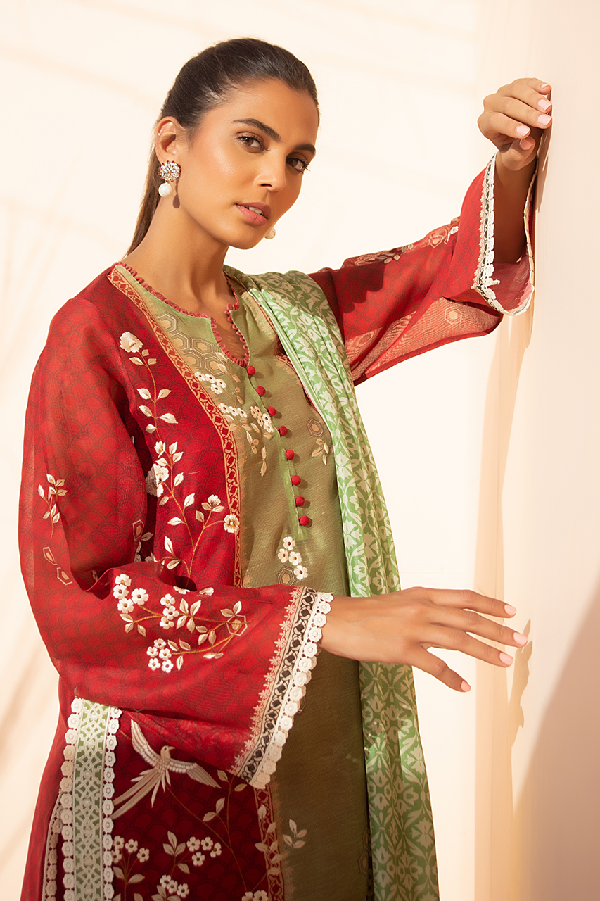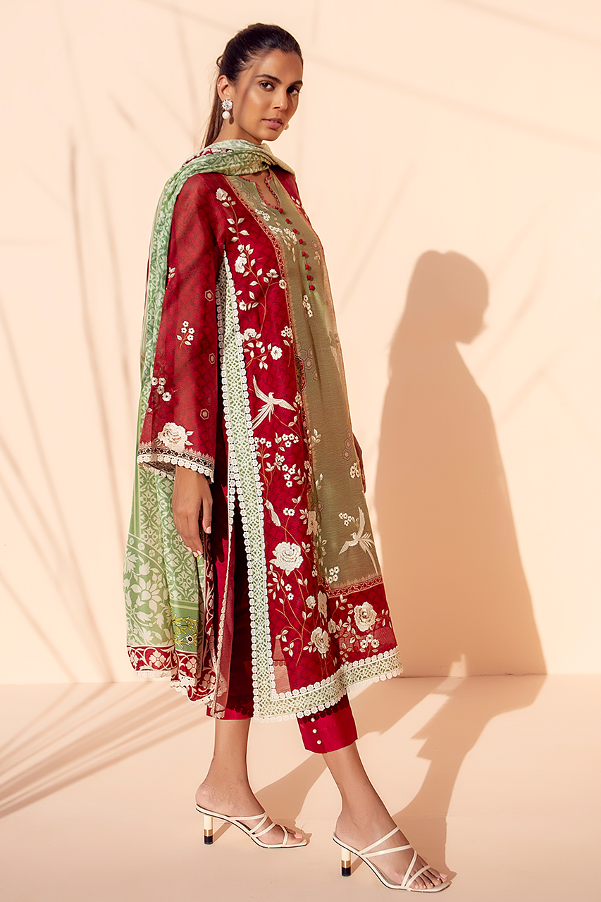 Spring into summer in this contrasting ruby and lime cotton net kurta with embroidered florals and ornamental imagery. Style it with our bold printed silk dupatta and raw silk trousers.