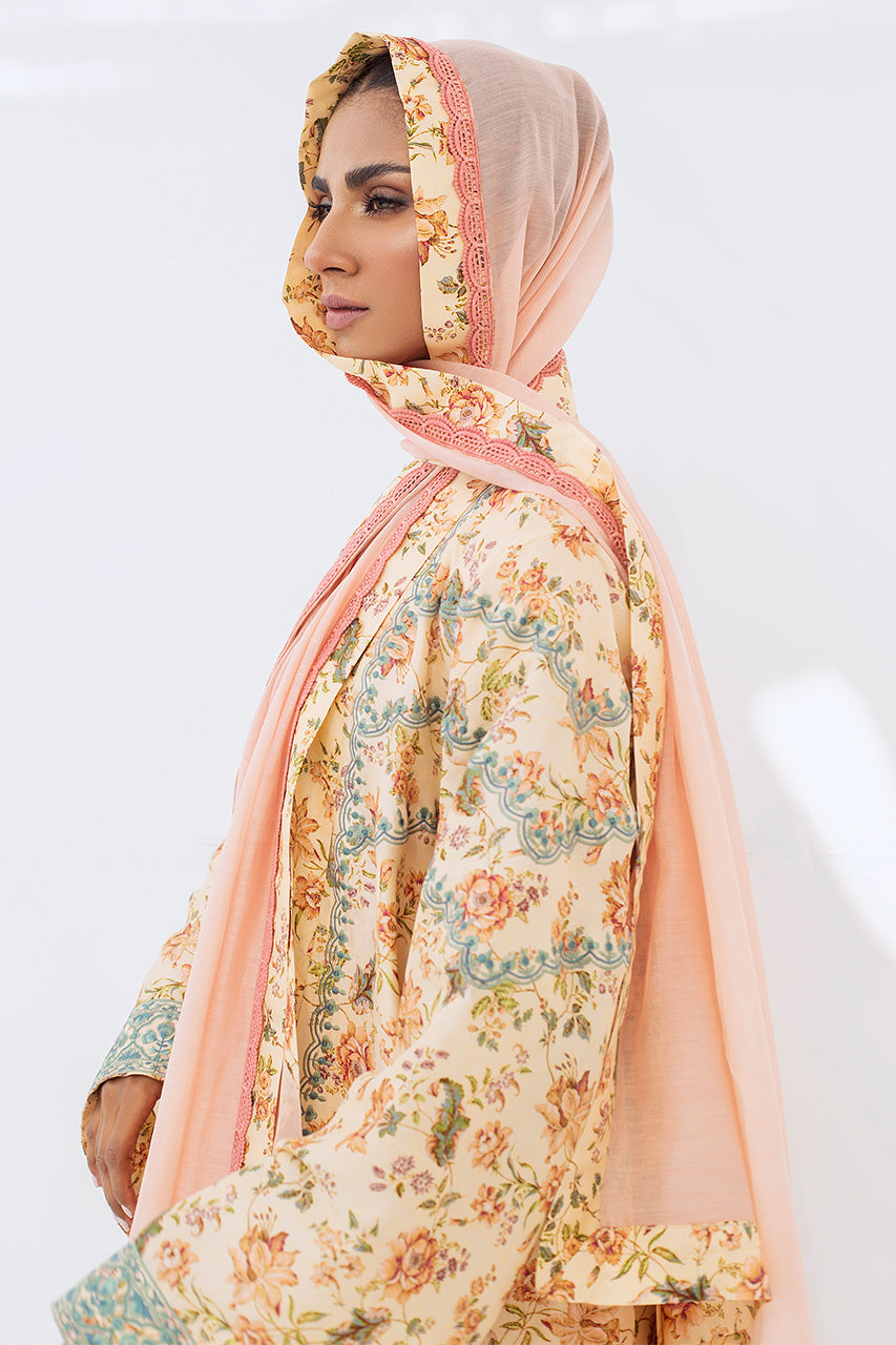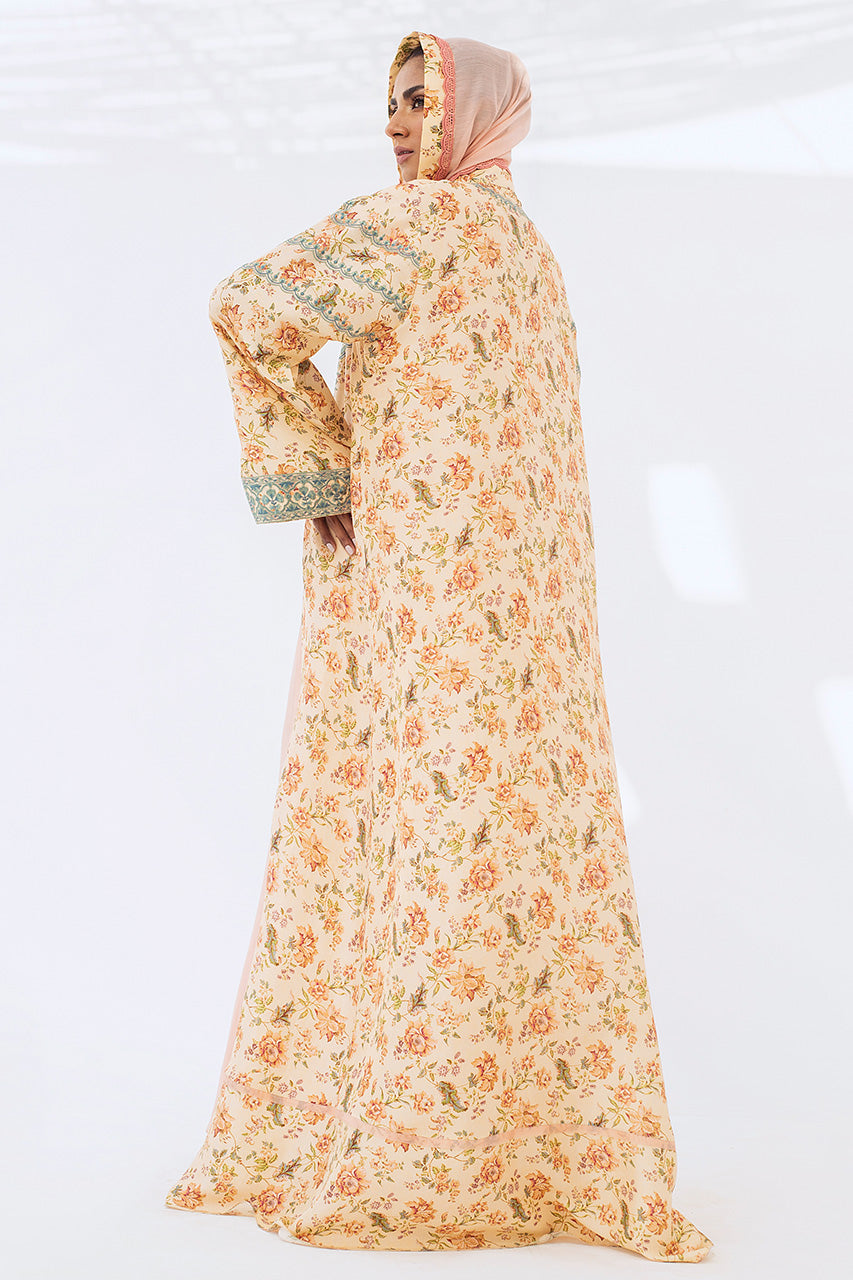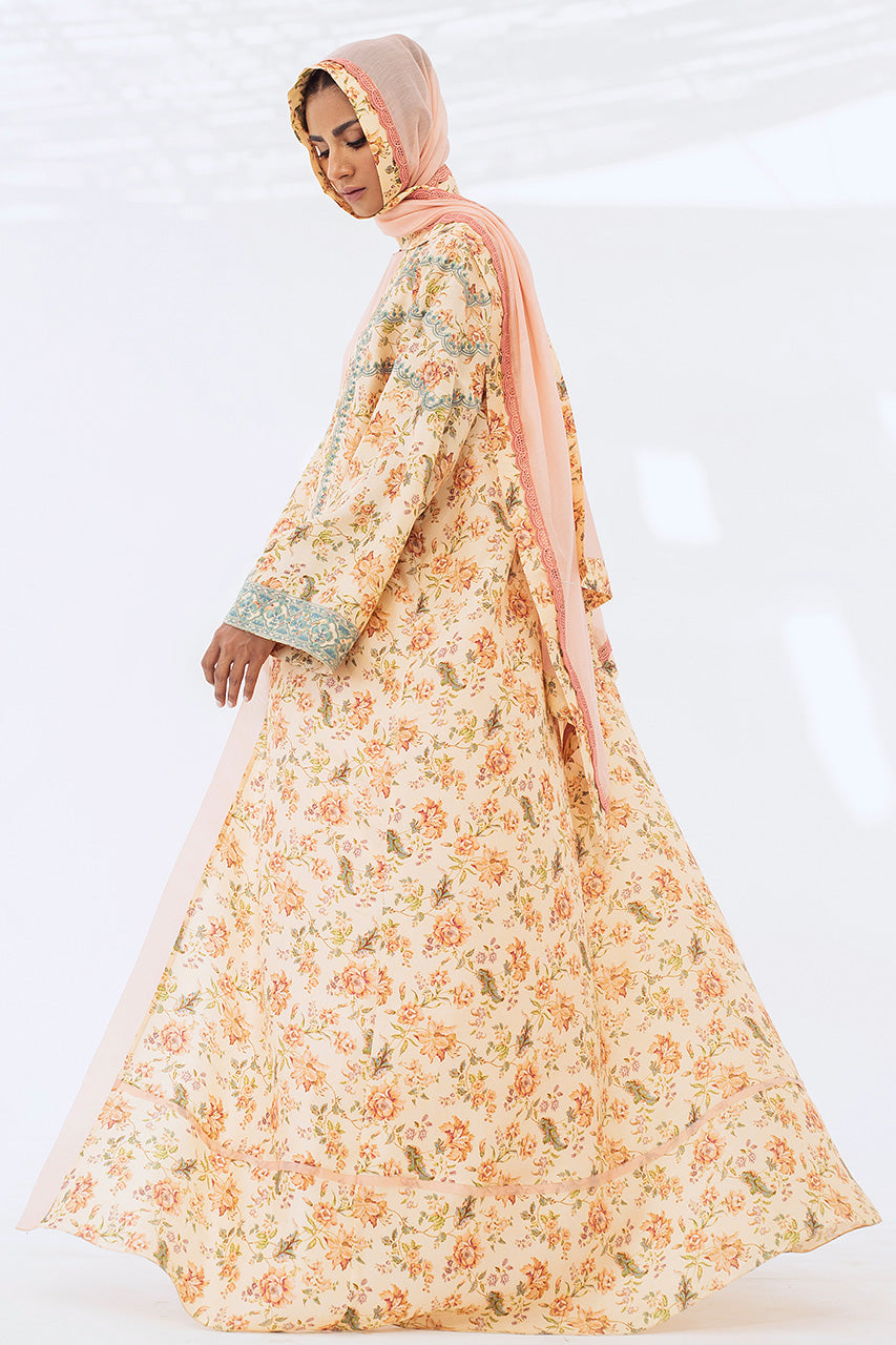 A bold floral print in a warm butterscotch coloured raw silk abaya sets the base for contrasting embroidery finishing in hues of blue. Paired with a printed khaddi silk scarf with pink lace detailing.