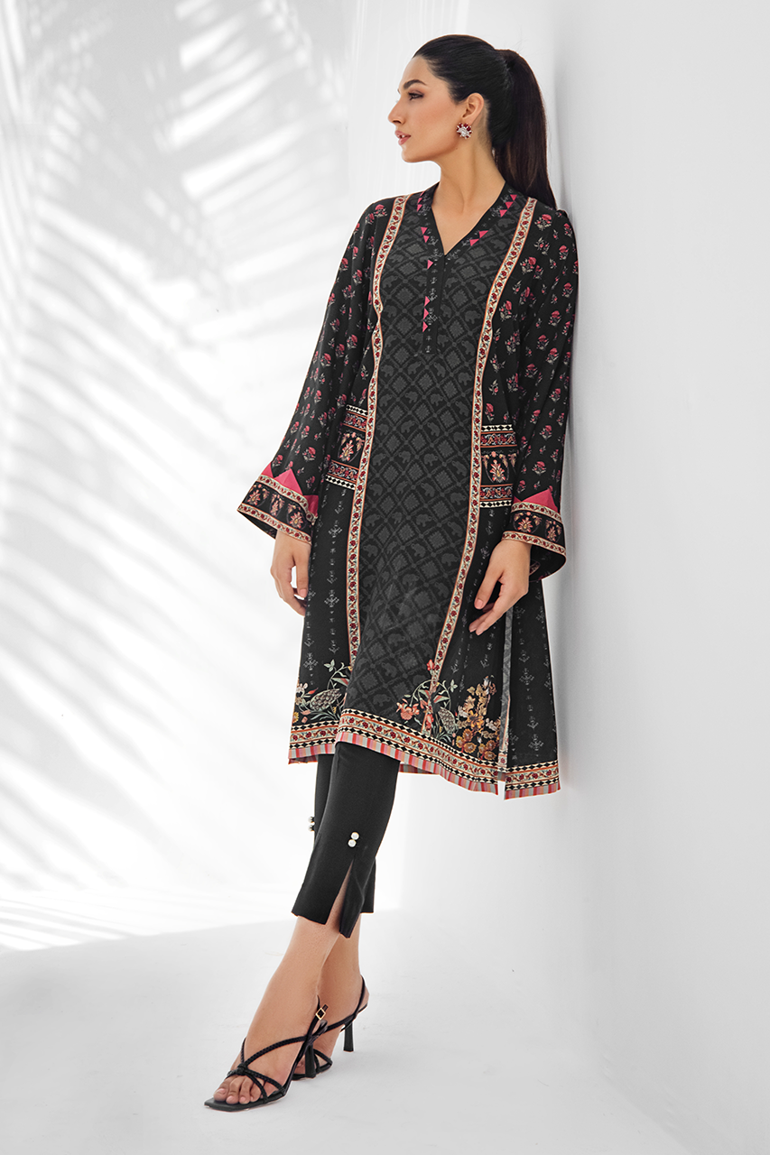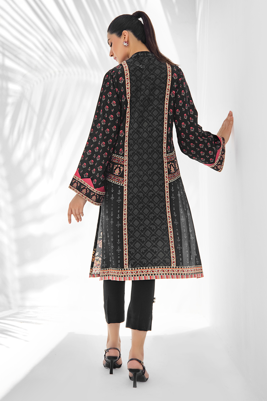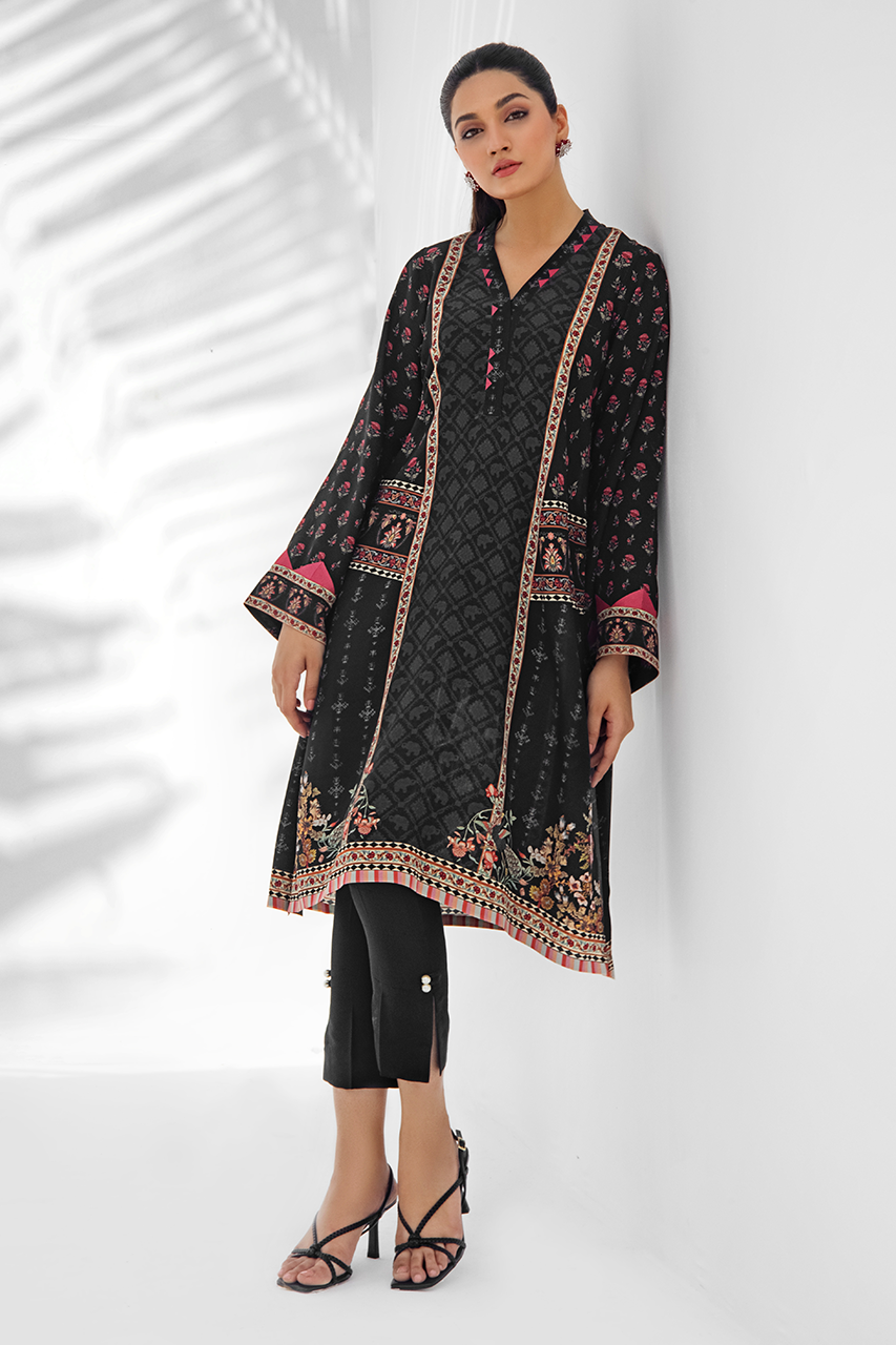 A relaxed silhouette, this printed crepe kurta is rendered with floral imagery on a black canvas. Fabric manipulation on the sleeves adds to the minimal detailing. Paired it with black raw silk crop trousers.