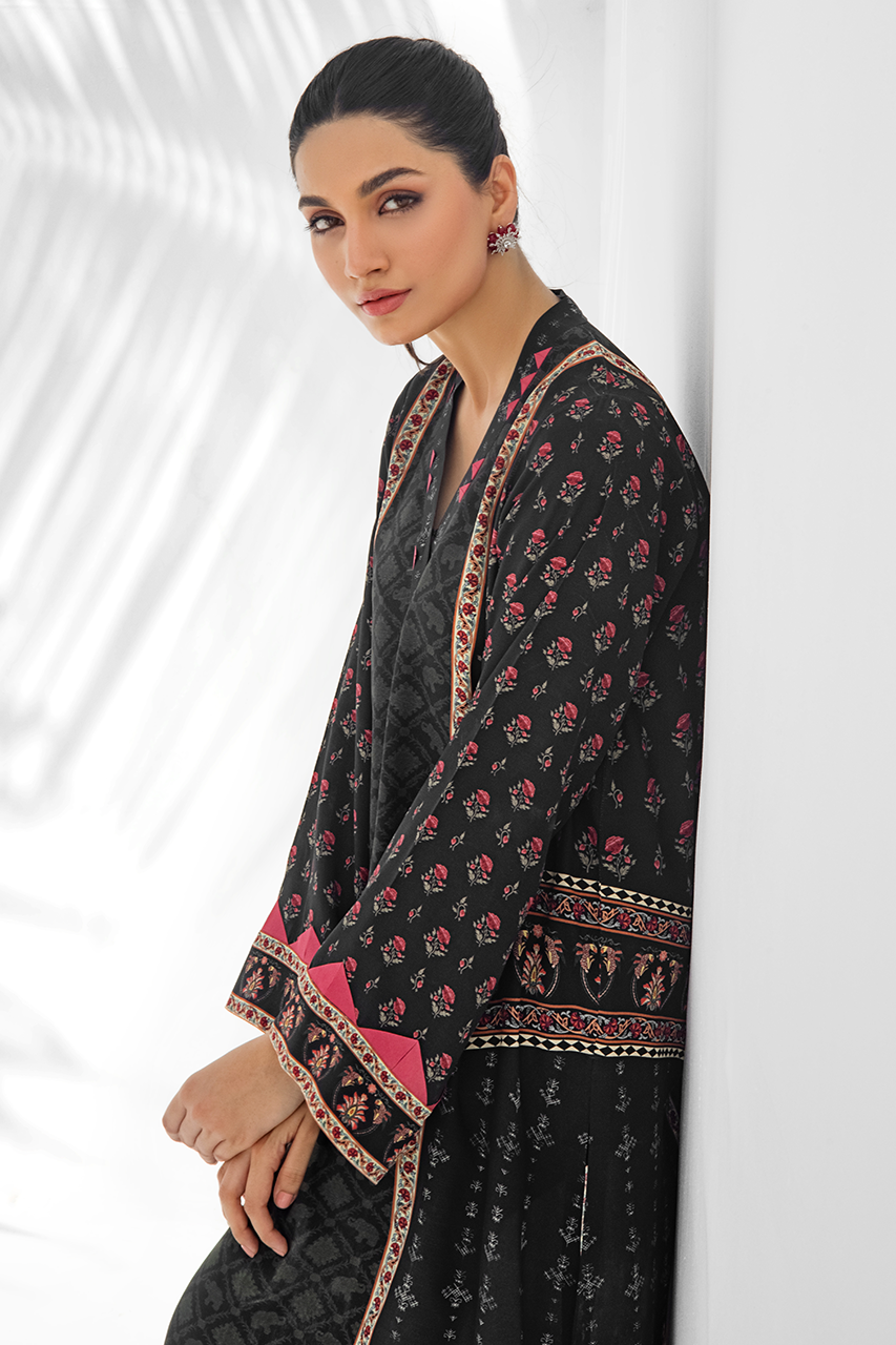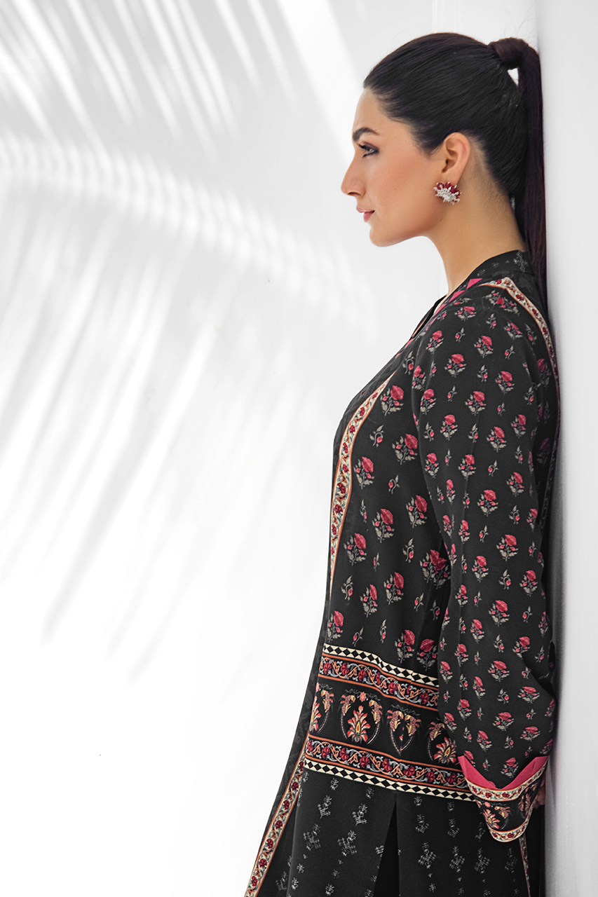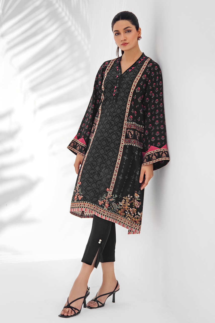 A relaxed silhouette, this printed crepe kurta is rendered with floral imagery on a black canvas. Fabric manipulation on the sleeves adds to the minimal detailing. Paired it with black raw silk crop trousers.
