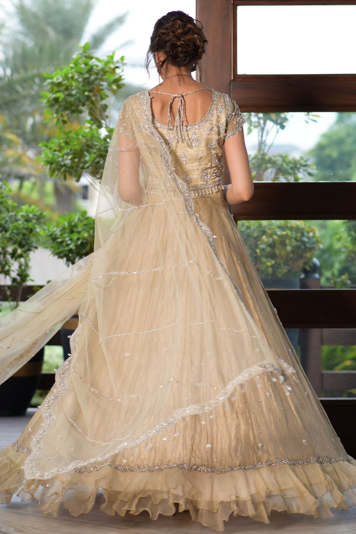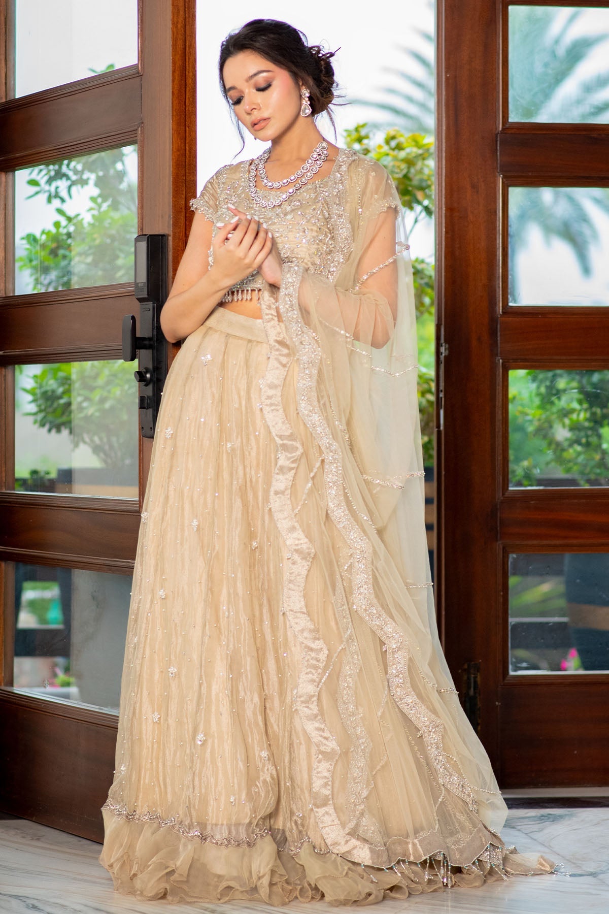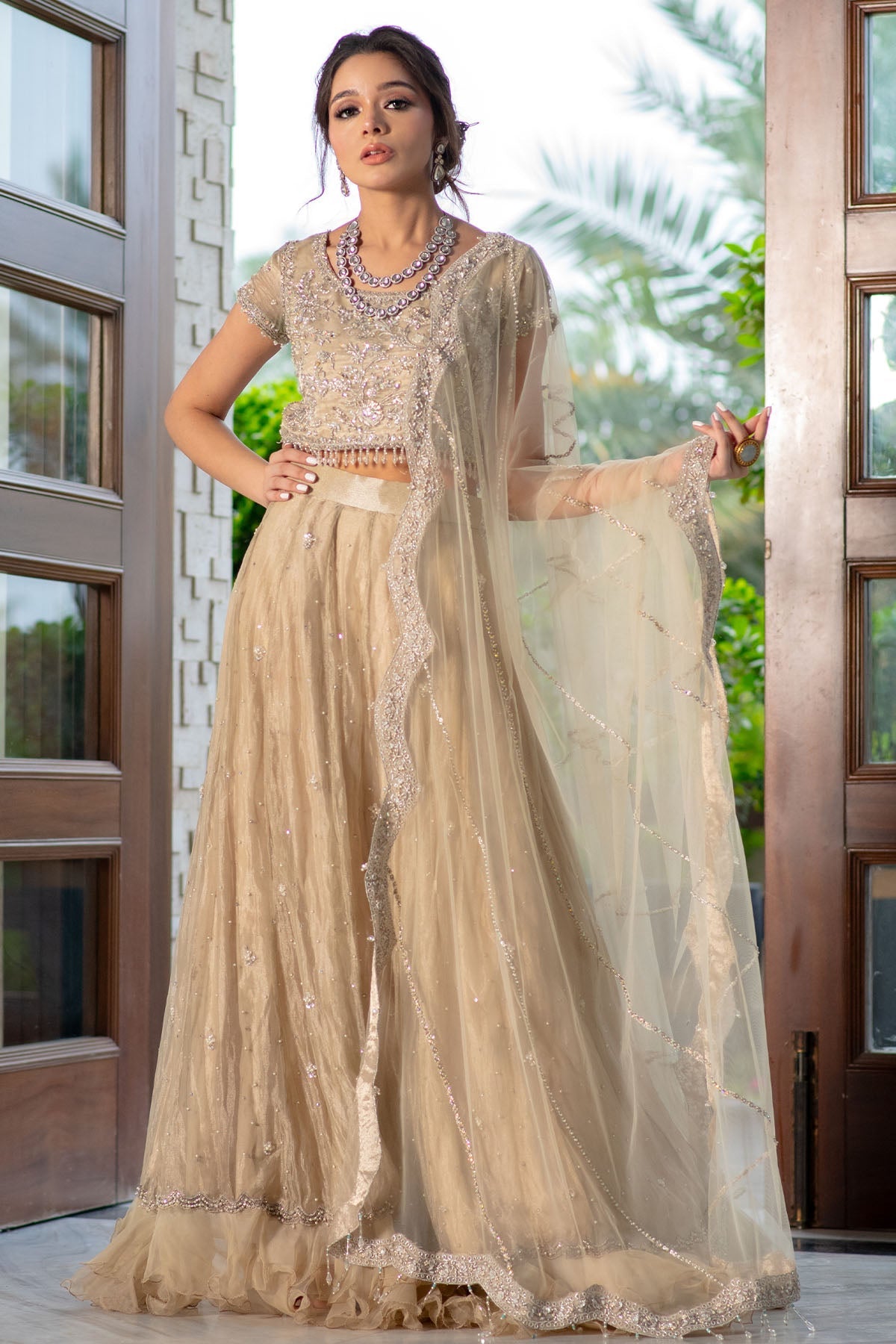 The finest craftsmanship in creating the lehenga choli. This dreamy choli is richly embroidered with zardozi and resham and paired with a heavily worked tissue lehenga with scalloped net dubbatta. The intricately embroidered and adda work completes the look for any kind of formal event.