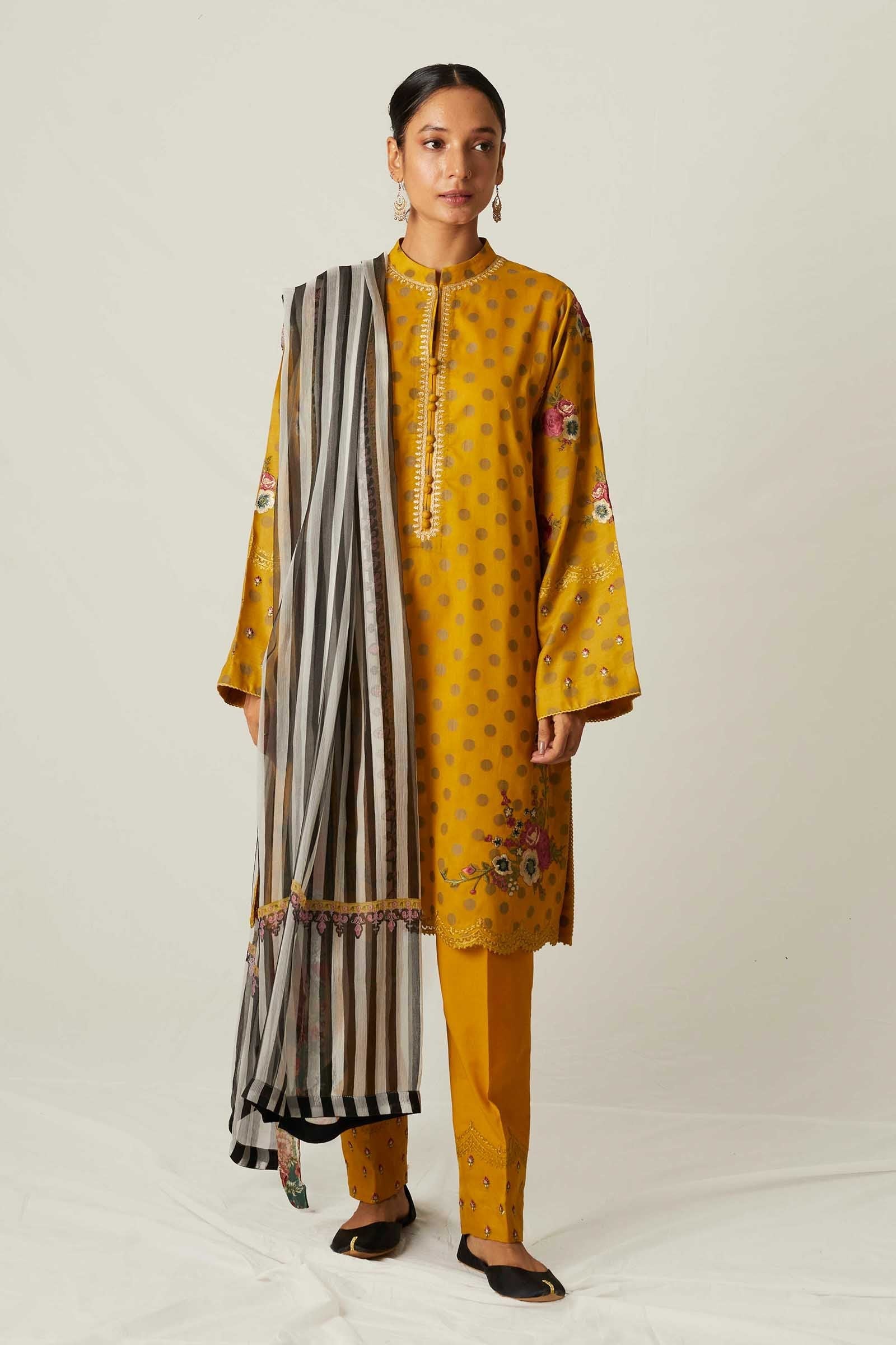 A mustard straight cut panelled kurta with an embroidered neckline, sleeves, corner motives and hemline, paired with our embroidered tapered pants and a printed chiffon dupatta.