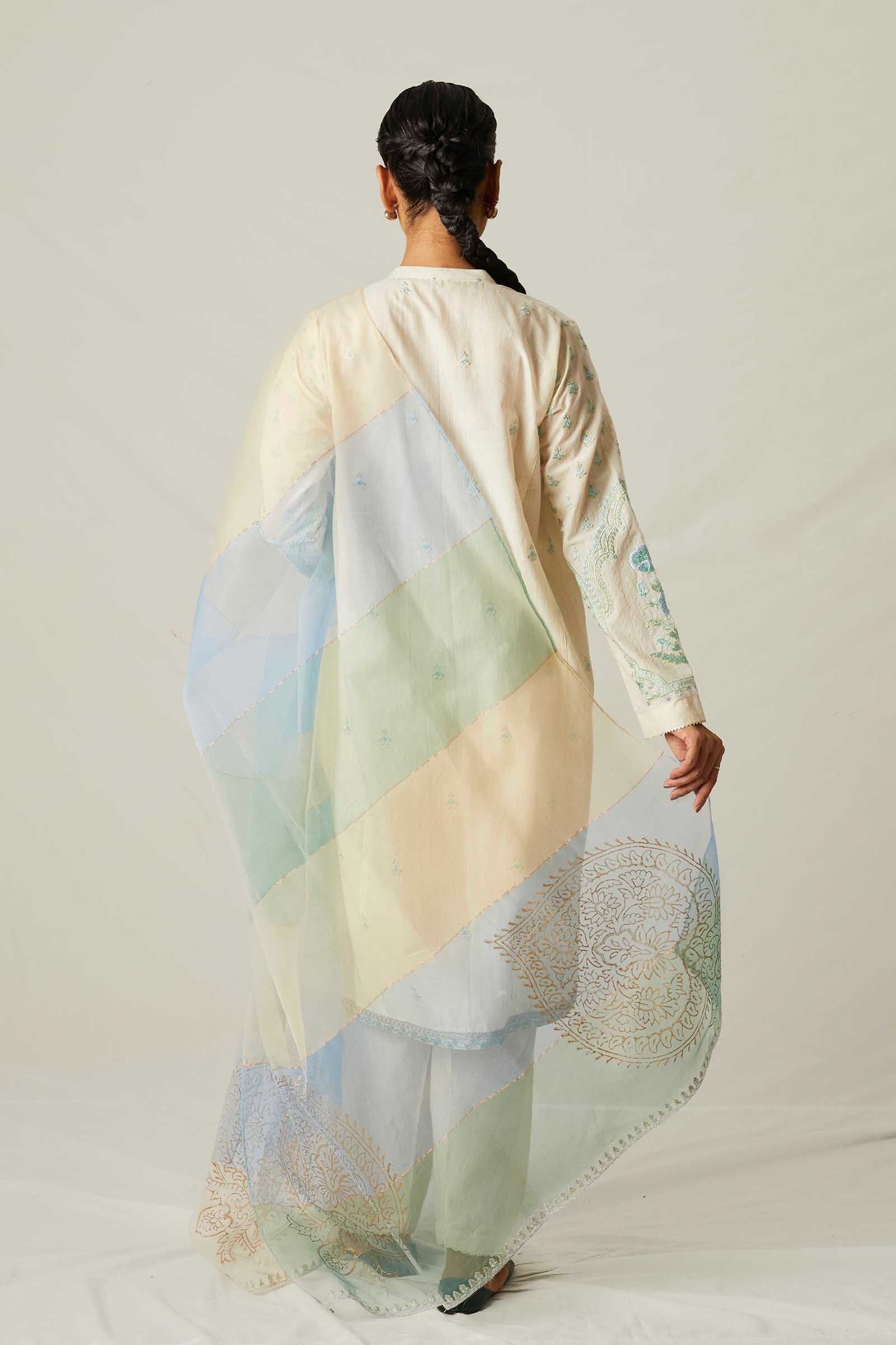 A flared panelled kurta with embroidery all over, along with an embroidered neckline, with composed sleeves and a hemline. It is paired with our classic shalwar and an organza dupatta with block printed motives and embroidered borders on two sides