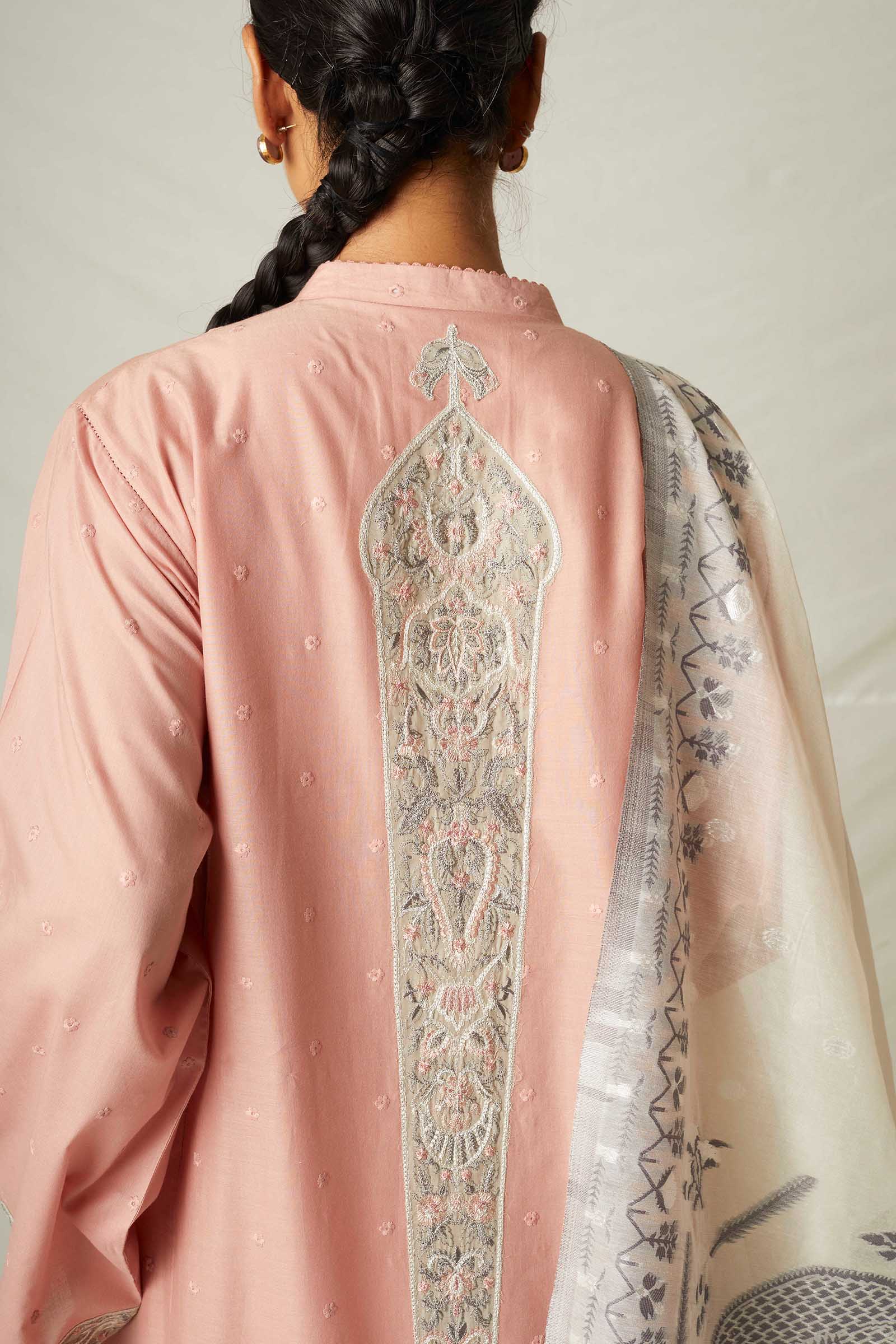 A Tea Pink loose fit panelled kurta, with embroidery all over, including sleeves, pockets and an elaborate back motive. It is paired with our classic shalwar and a cotton jacquard dupatta