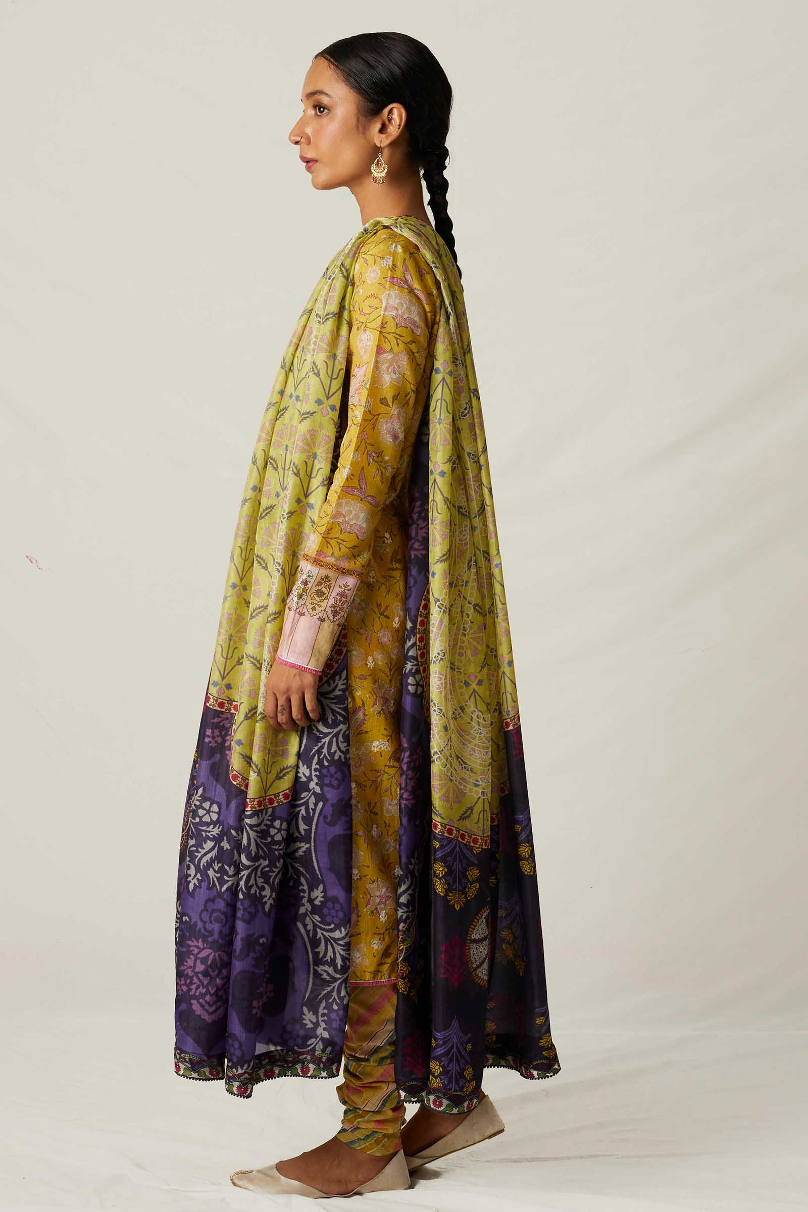 A straight cut, panelled kurta with embroidery all over, as well as an embroidered neckline and elaborate side motives, paired with a chooridaar pyjama and a printed silk dupatta