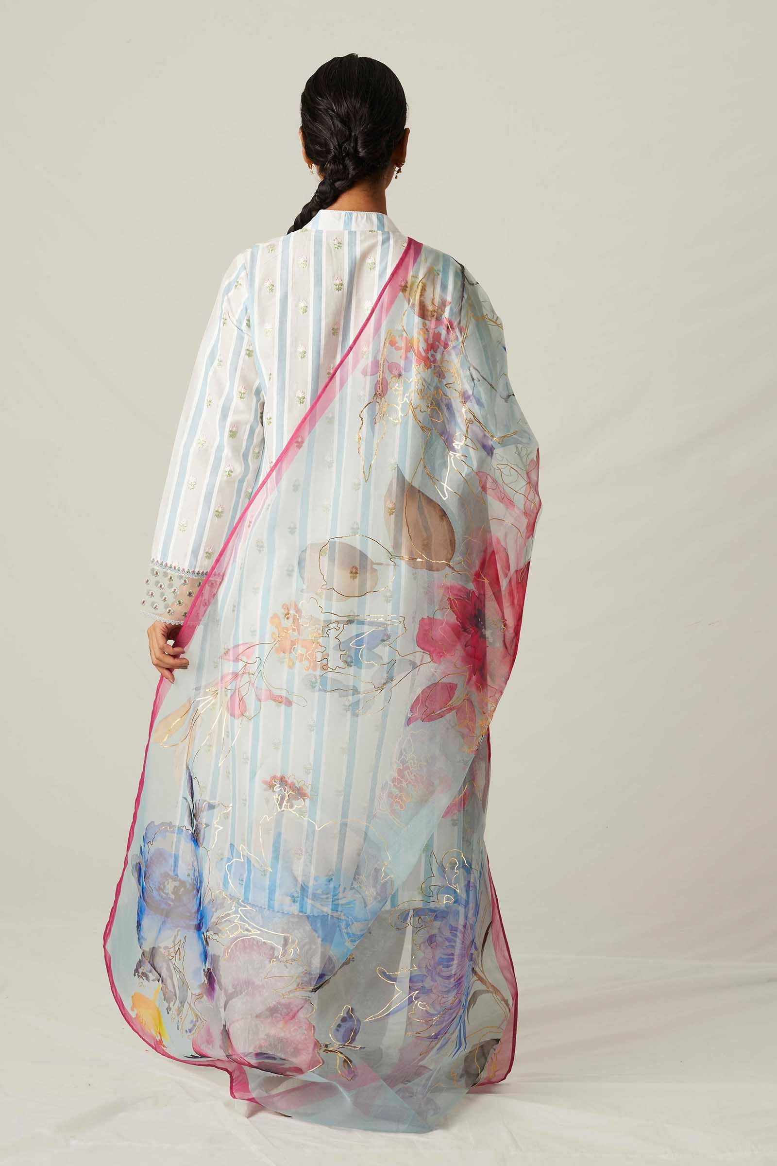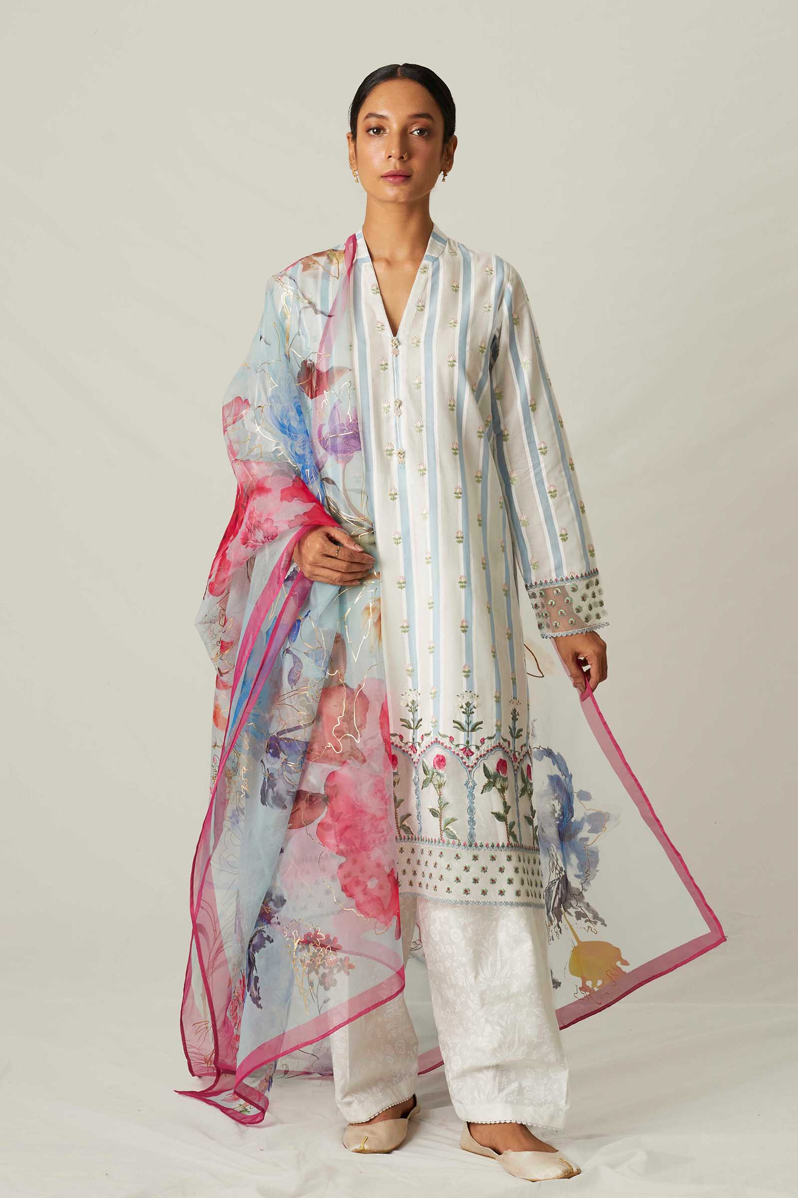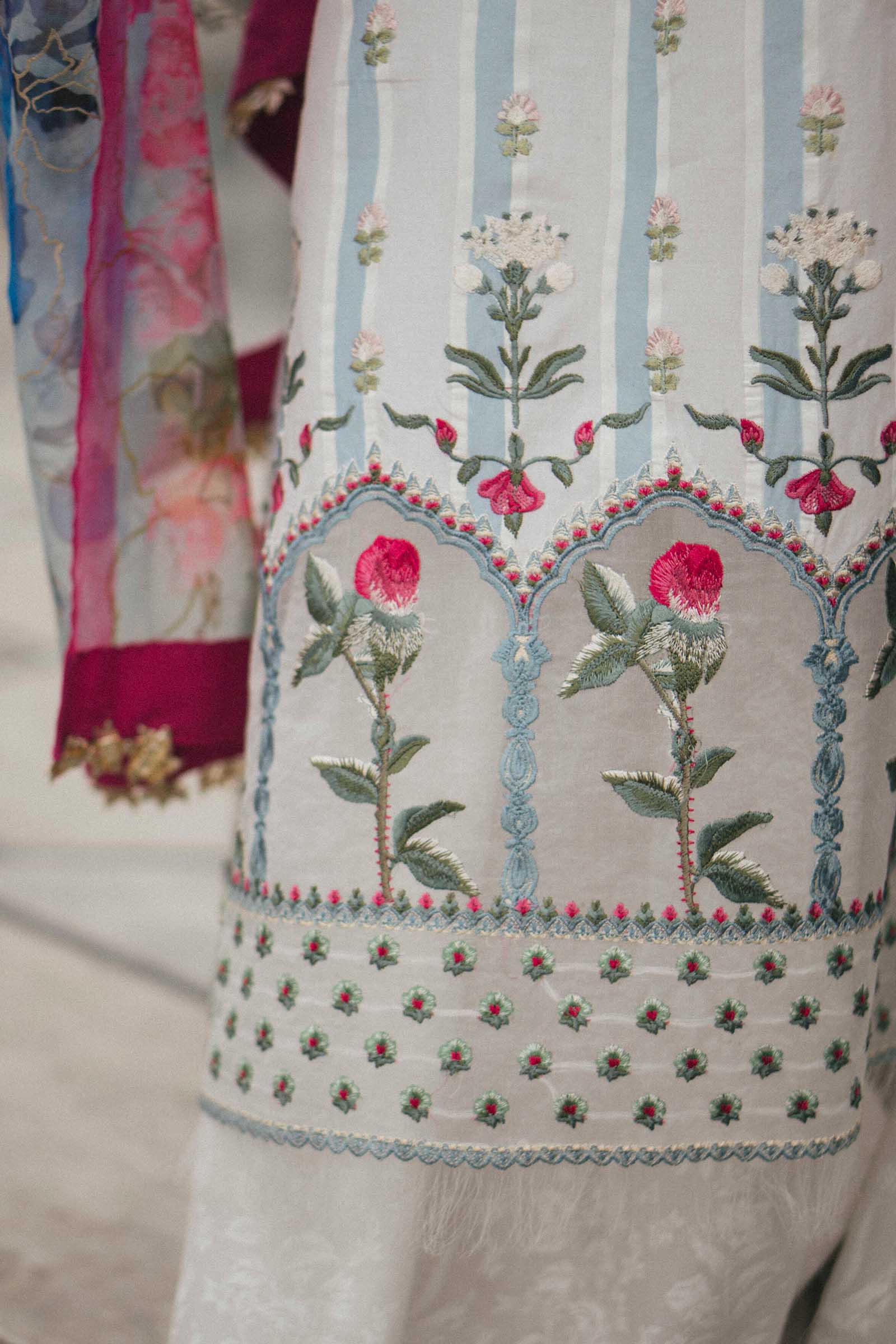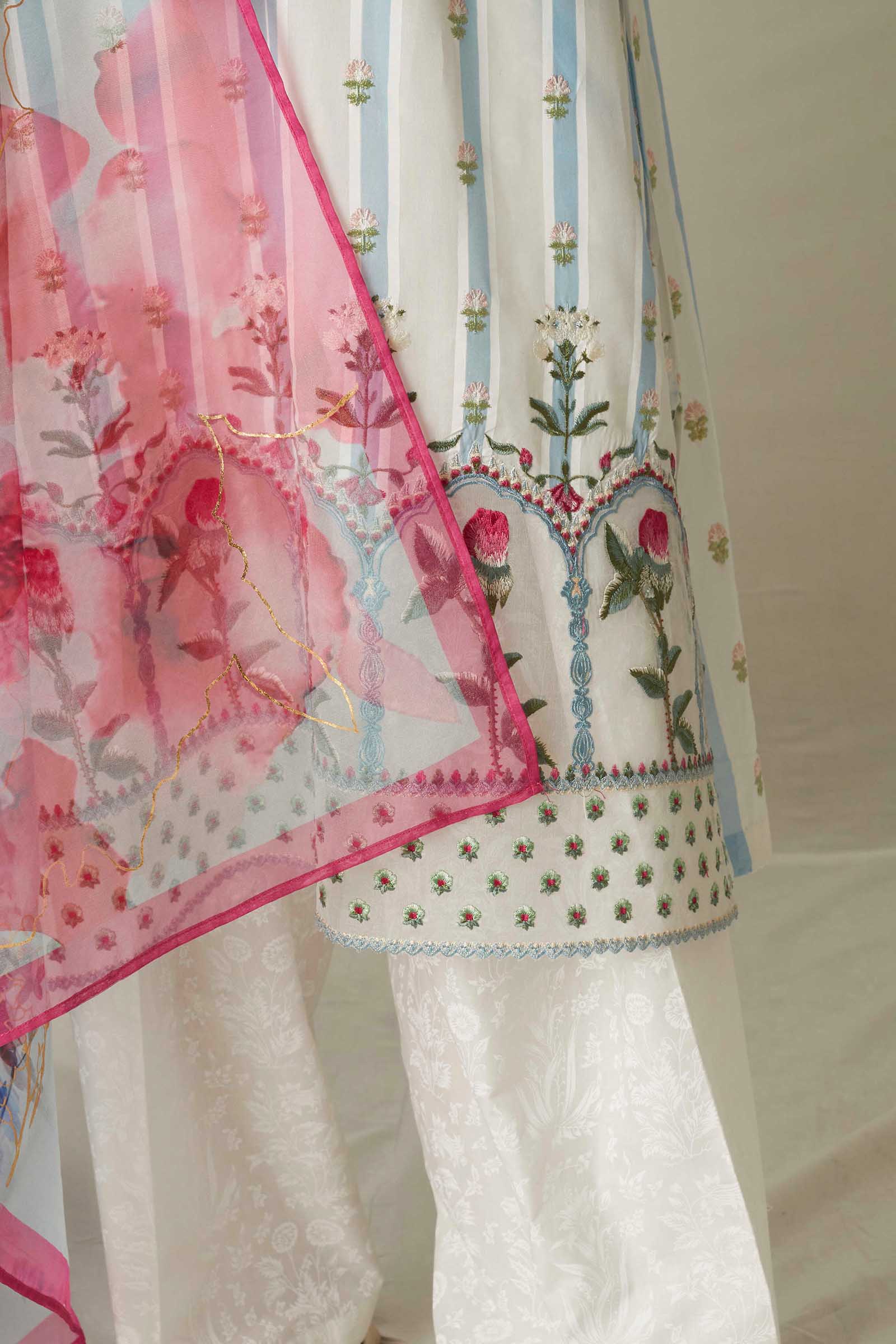 An A-Line kurta with embroidery all over, including sleeve borders and an elaborately embroidered hemline, paired with our classic paste printed shalwar and an organza dupatta with foil printed details