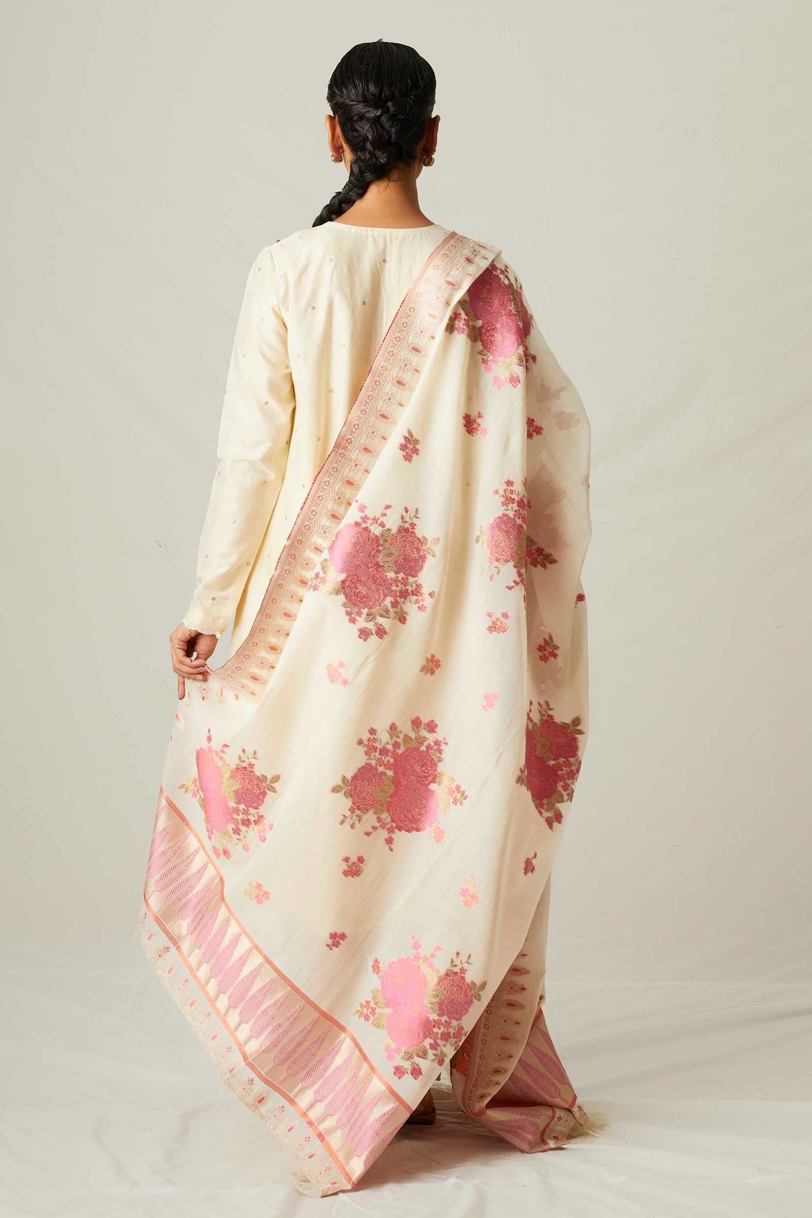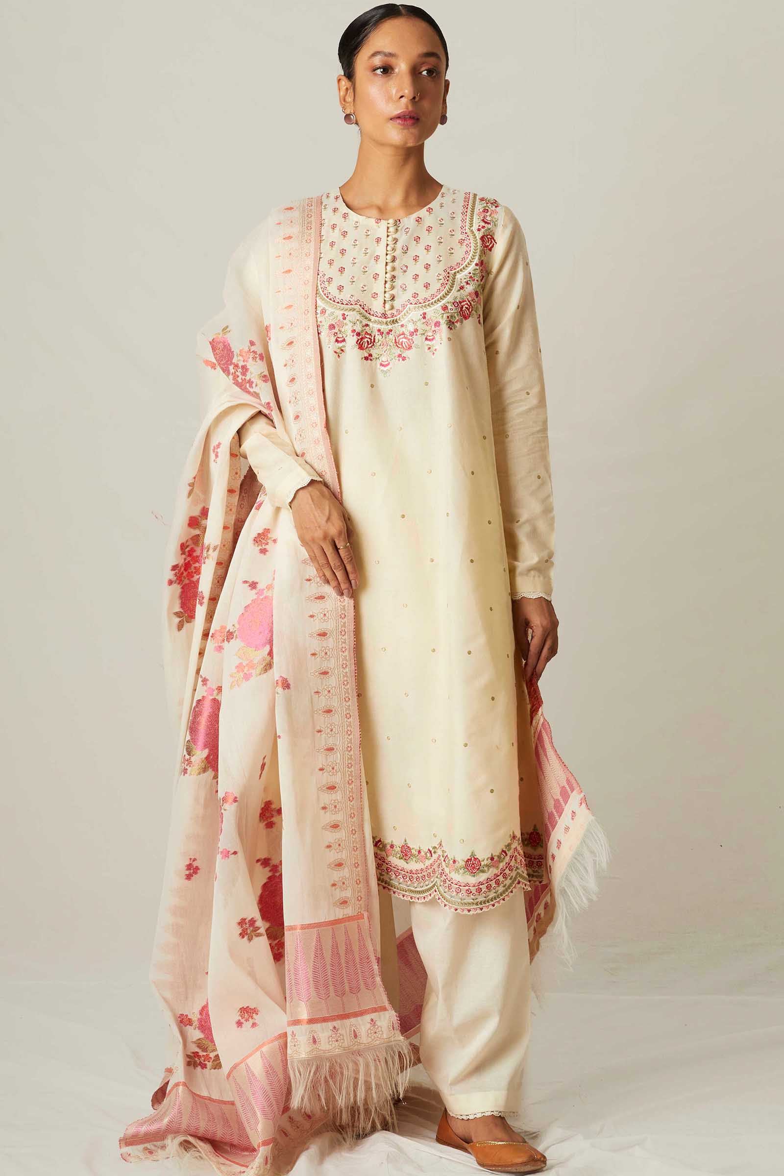 An off white flared, panelled kurta with embroidery all over, as well as a heavily embroidered neckline and hemline. It is paired with a shalwar and the look is completed with our decadent floral jacquard dupatta
