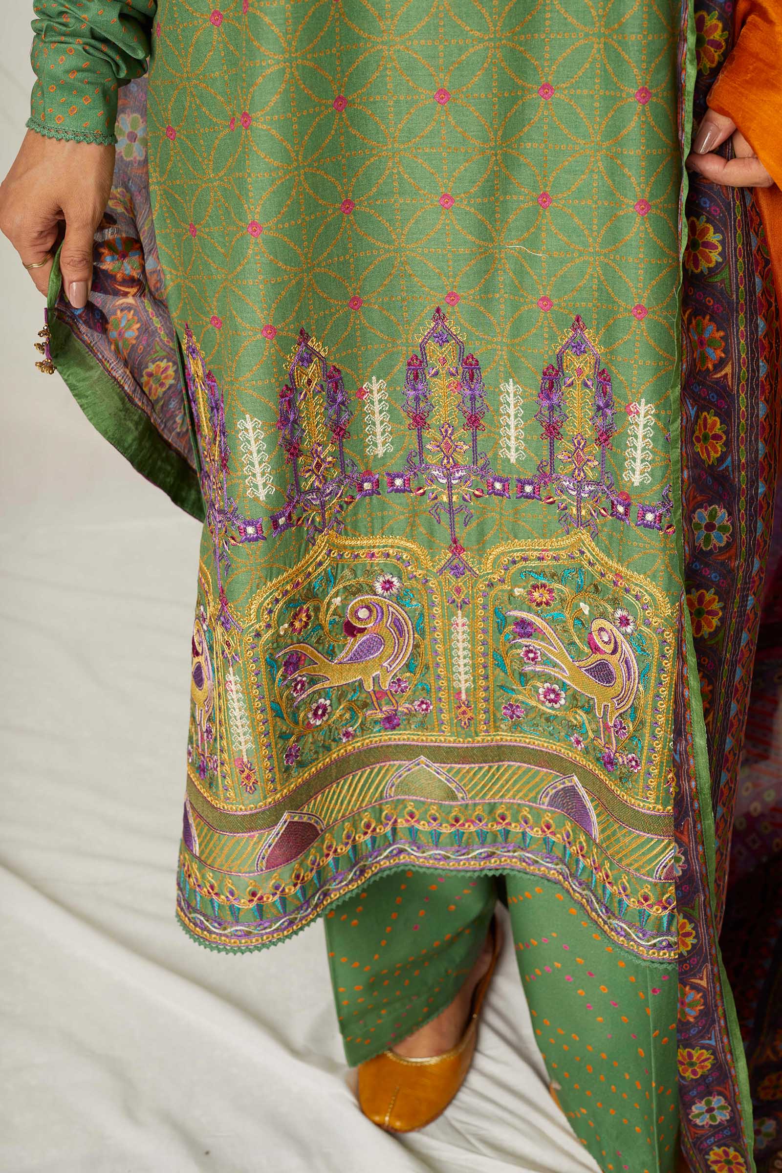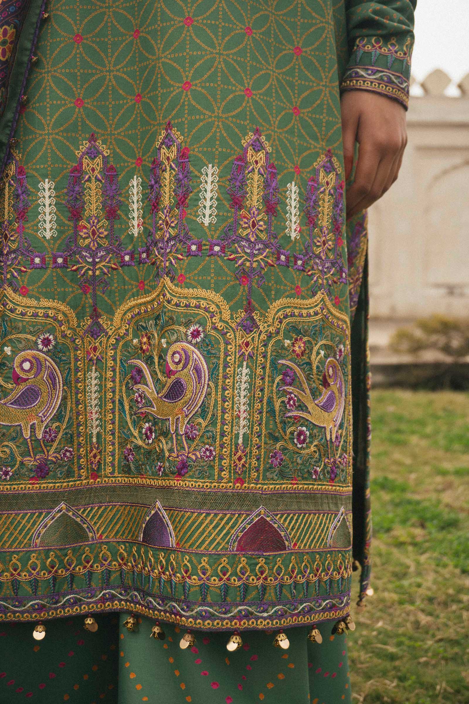 A deep green printed straight fit kurta with chooridaar sleeves and heavily embroidered neckline and border at the hem. It is paired with our classic shalwar and a digitally printed silk dupatta.