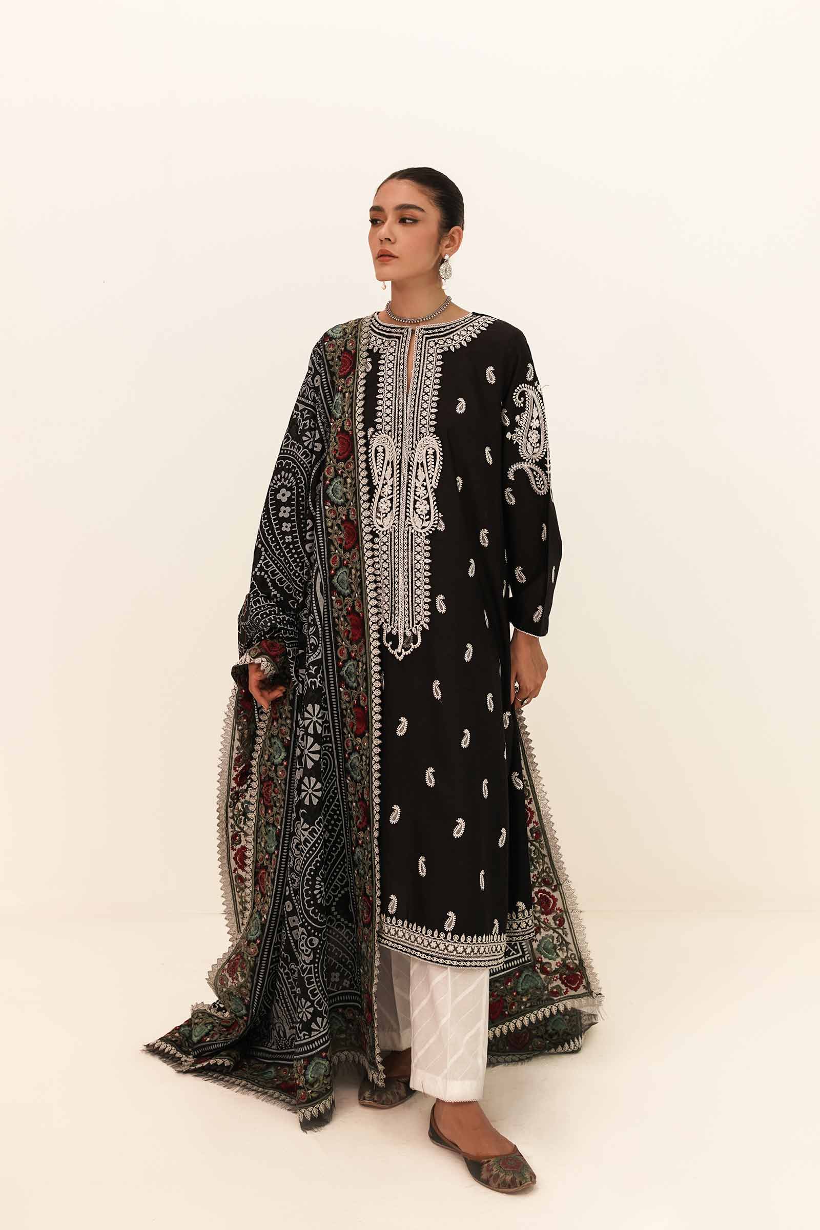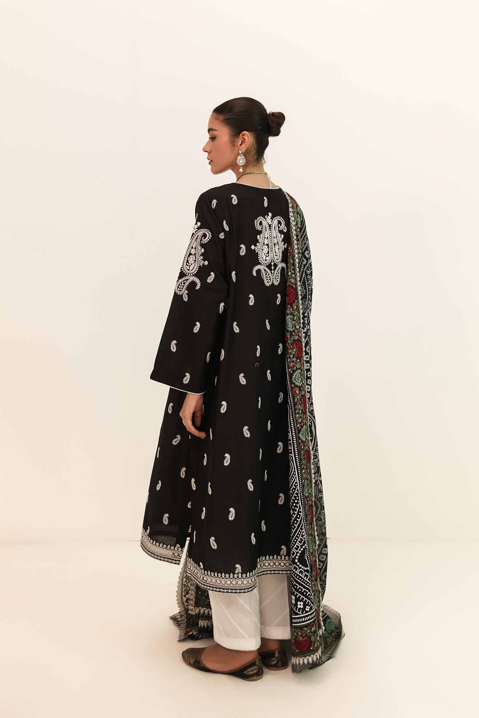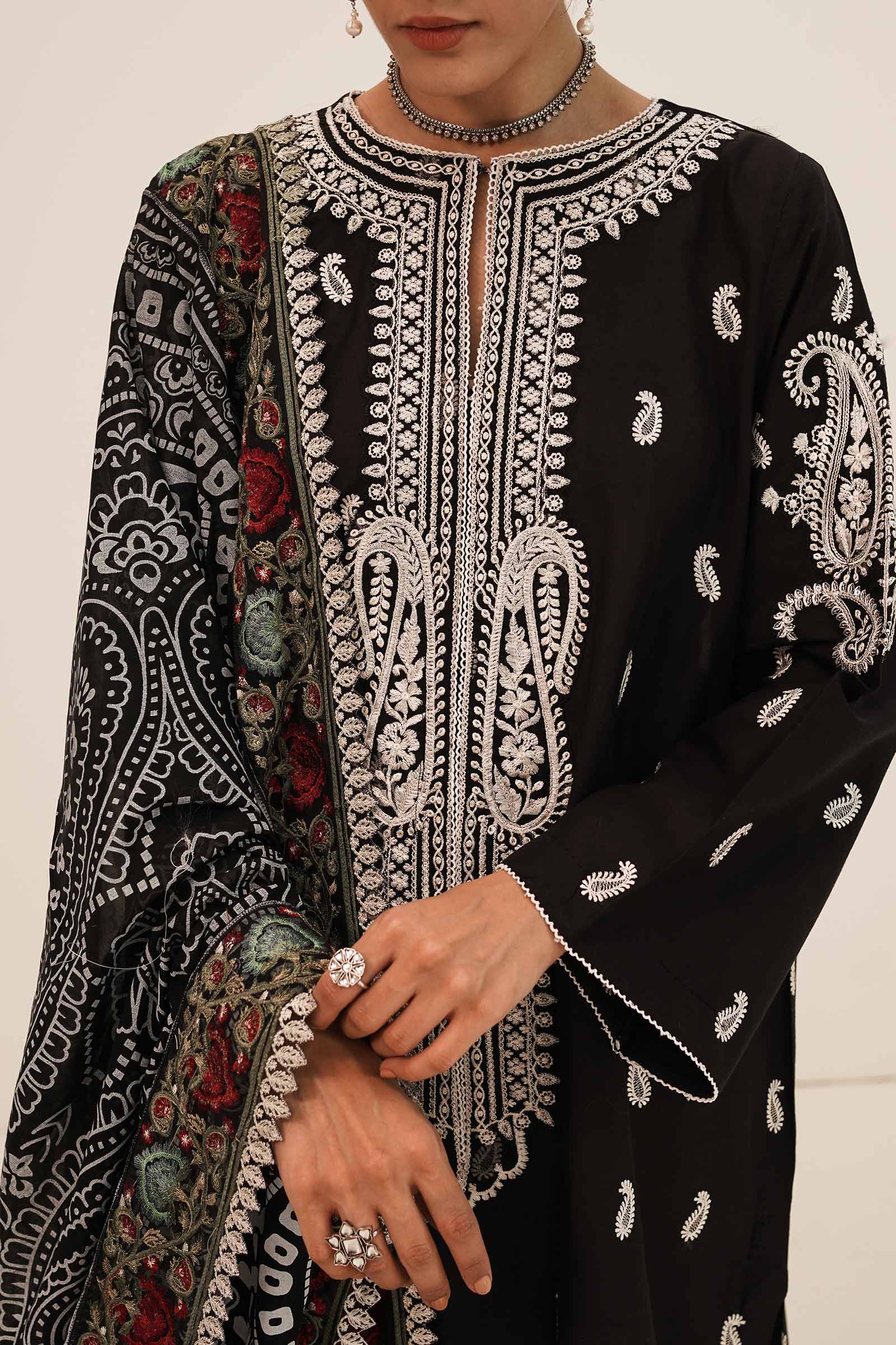 One of the more decorative designs with its lush embroidered neckline, borders, and motifs, Afreen A comes with a splash of color on its fully embroidered shirt. The intricately embroidered borders on all four sides of the printed swiss voile dupatta plays with the most vibrant of colors, adding a burst of life and celebrating love this season. Paired with a plain cambric trouser, you have yourself a celebration of spring.