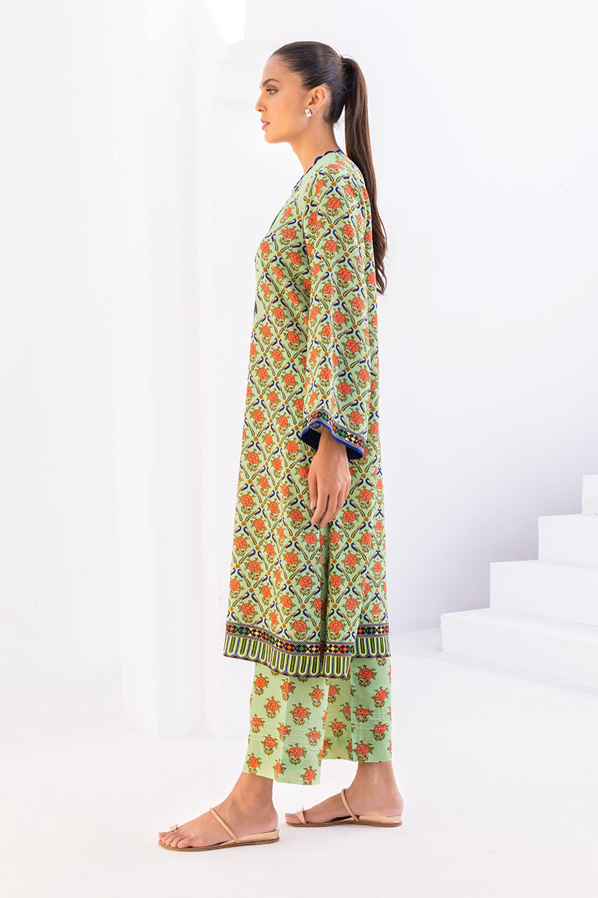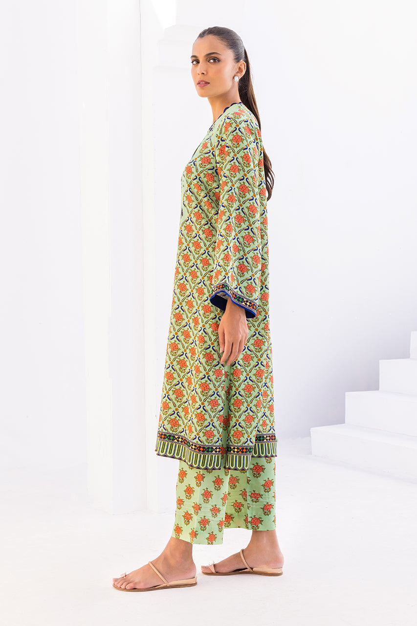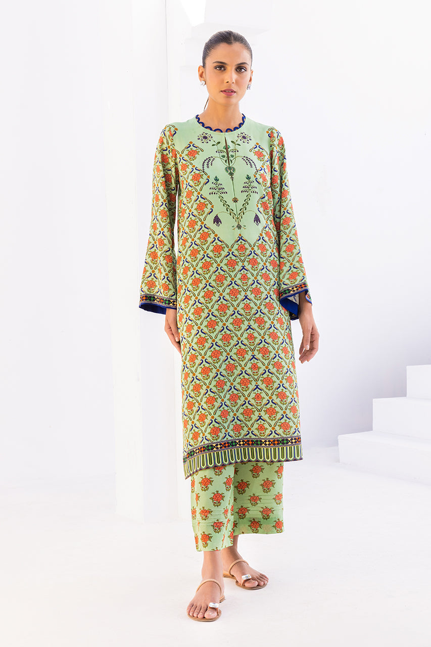 This mint digitally printed kurta is comfortable and classy with its floral and peacock elements. The piece is paired with a matching printed shalwar.