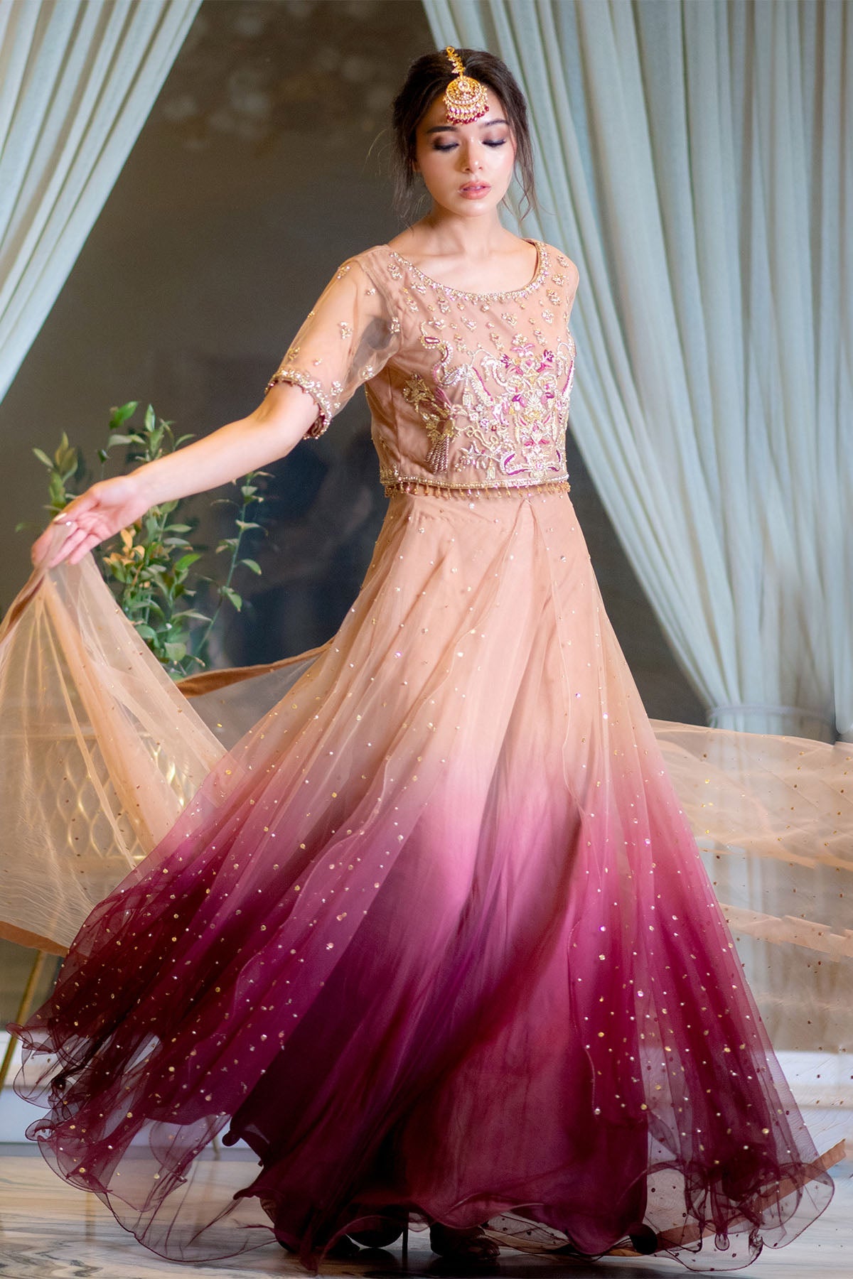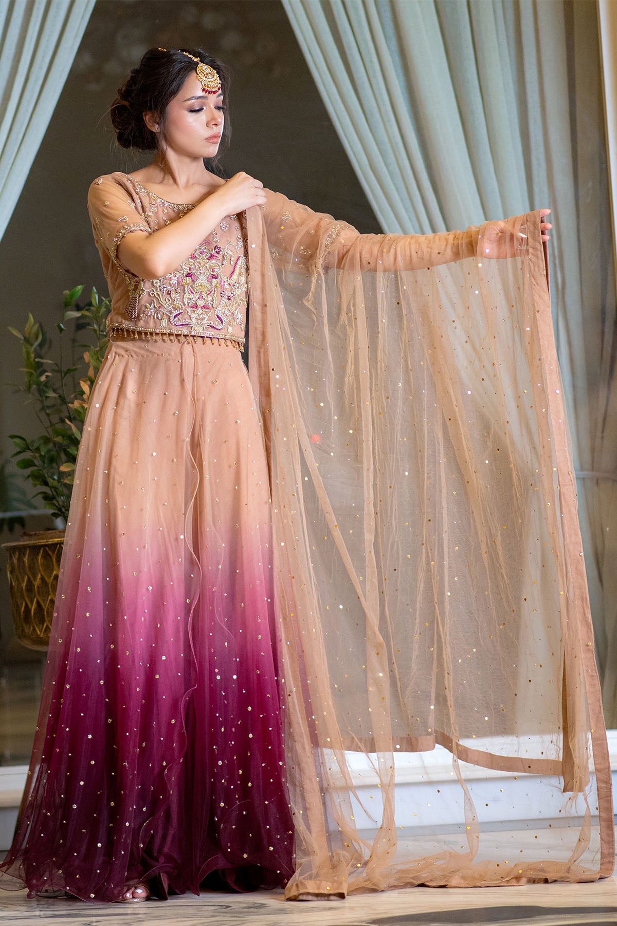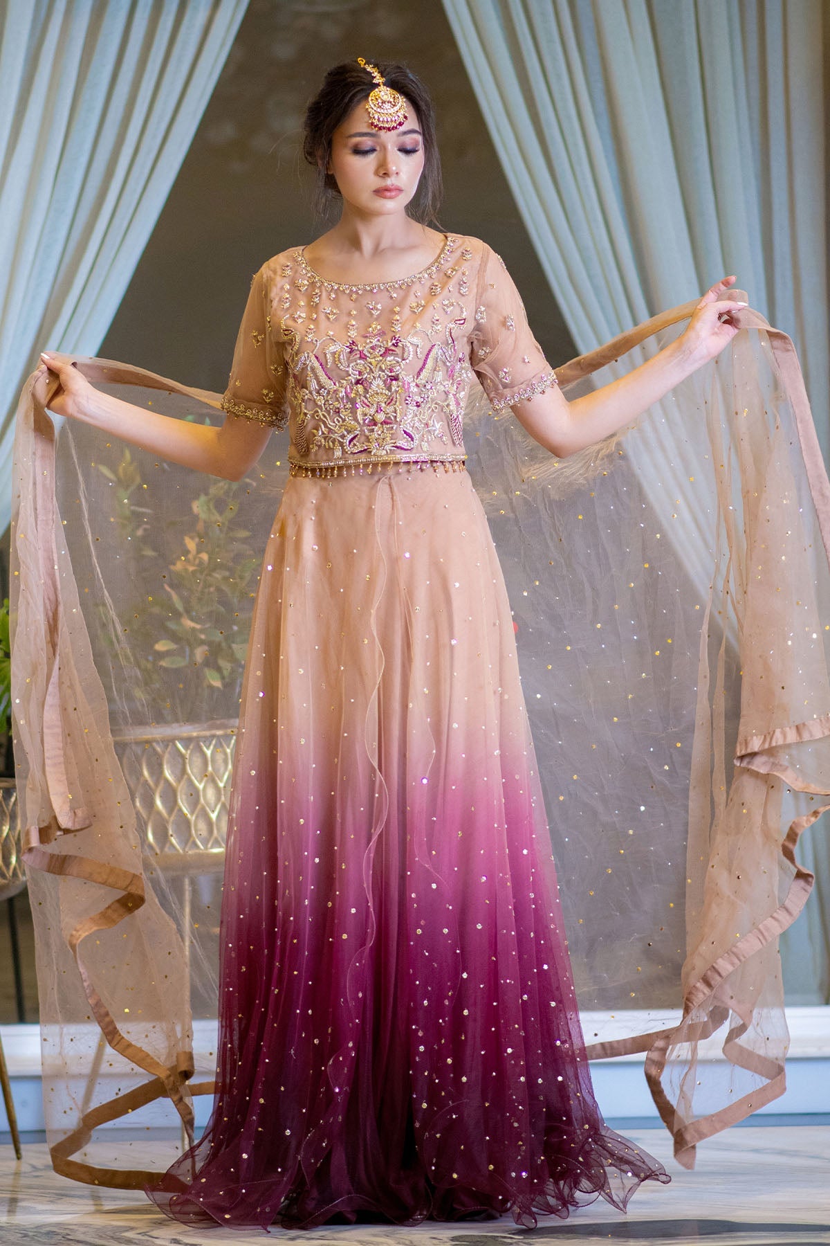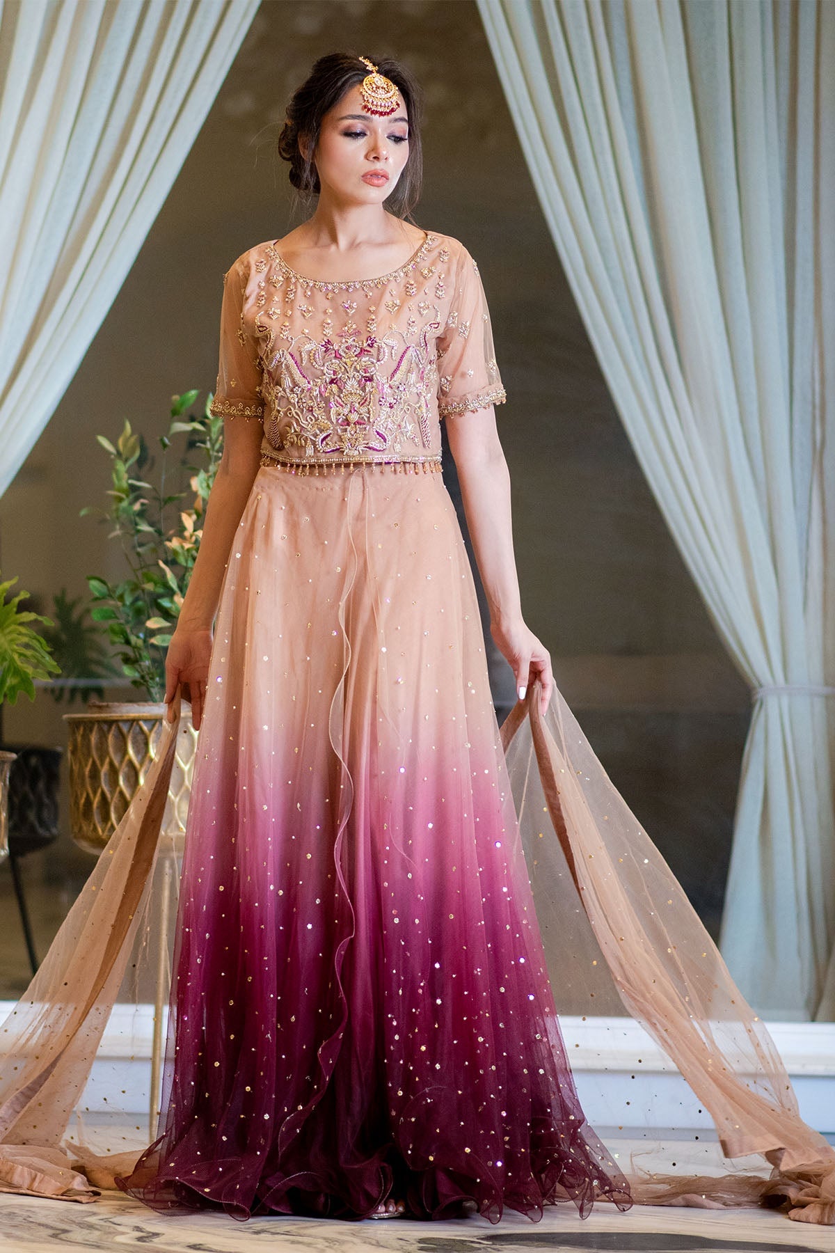 The gorgeous layered over a subtly shimmering lehgna for an amazingly flattering silhouette. It’s dubbatta us Densely embellished with a triple sequins spray for that extra sparkle