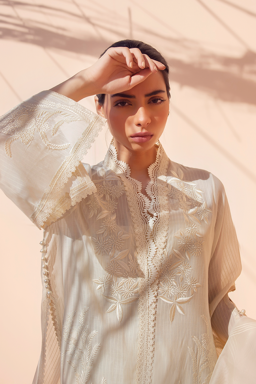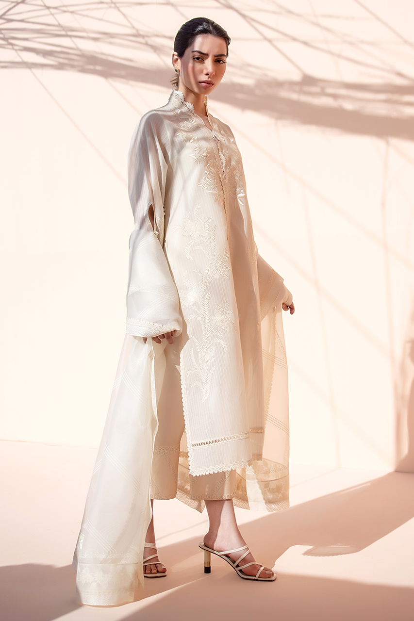 An ivory woven fabric is artfully embroidered with foliage imagery and cutout sleeves that create interest. The ensemble is paired with a matching organza dupatta and a raw silk panwar.