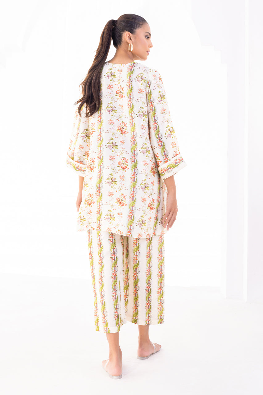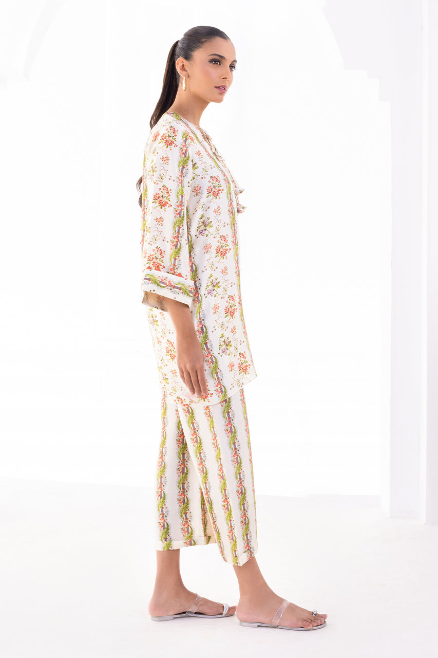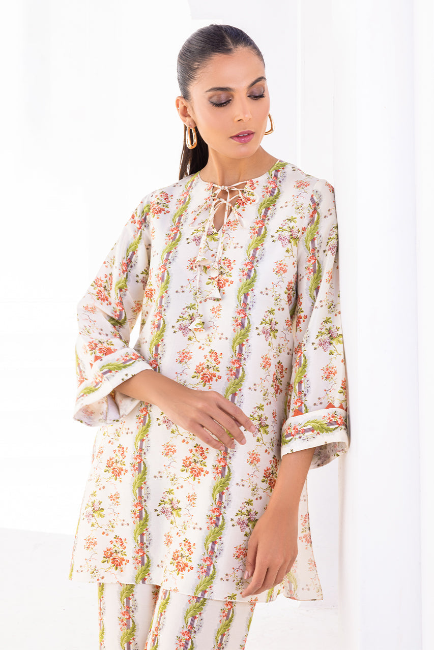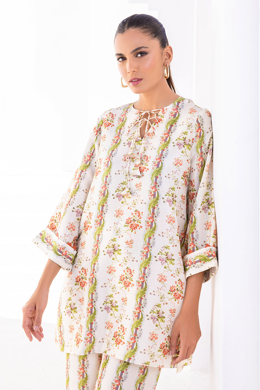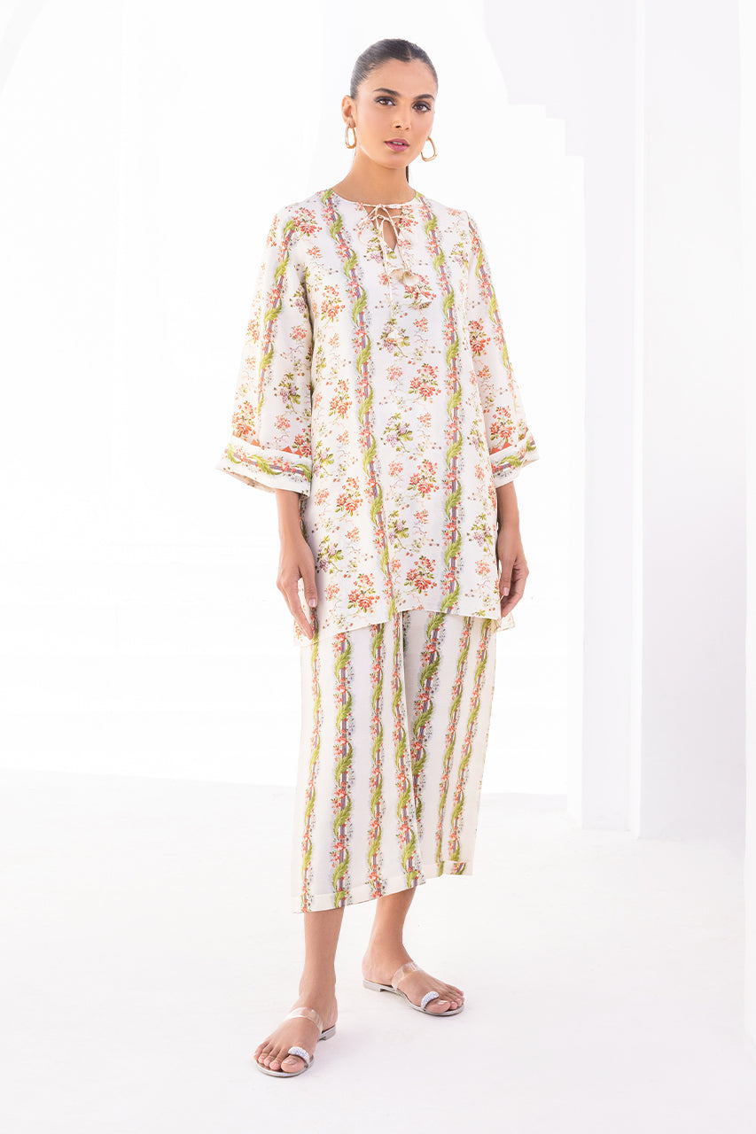 With a beautiful breezy silhouette and a perfect balance of print on print, this set is your go-to summer staple. A cream based rawsilk kurta dotted with pink and white floral imagery and tassels detailings is paired with co-ordinating printed rawsilk culottes.
