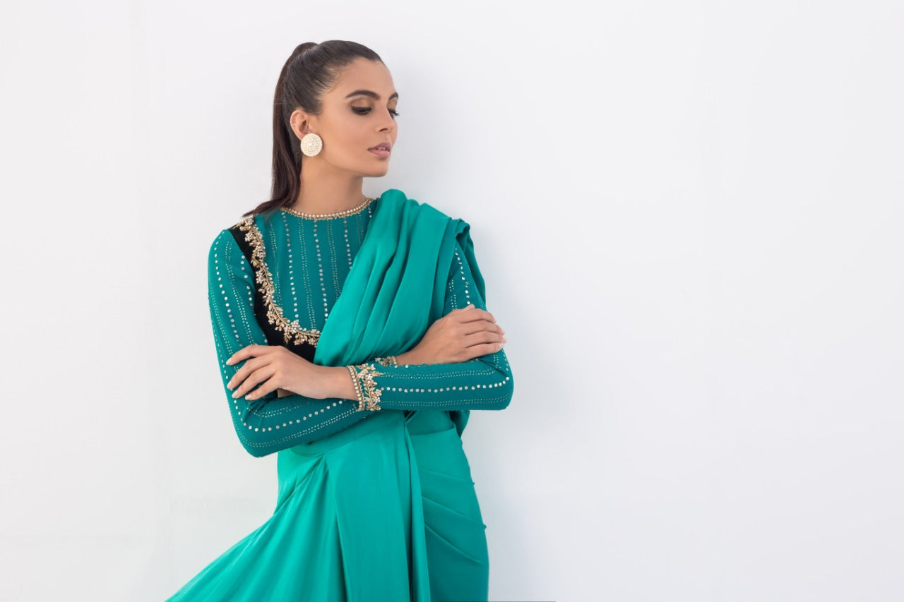 A dip dyed charmeuse saree in turquoise hues is paired with a matching georgette kaamdani blouse adorned with zardoze hand work on the sleeves and neckline and an emerald green velvet applique