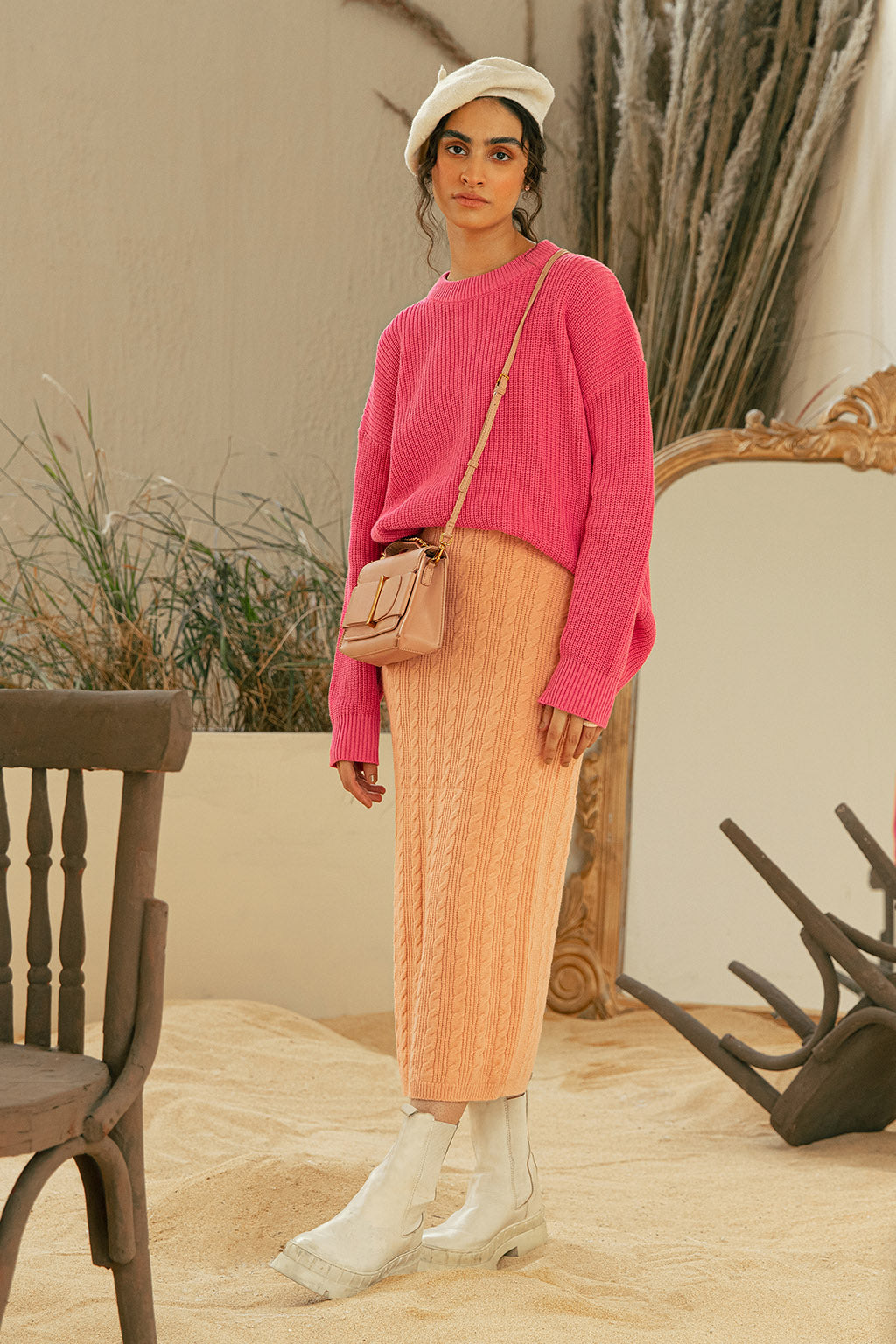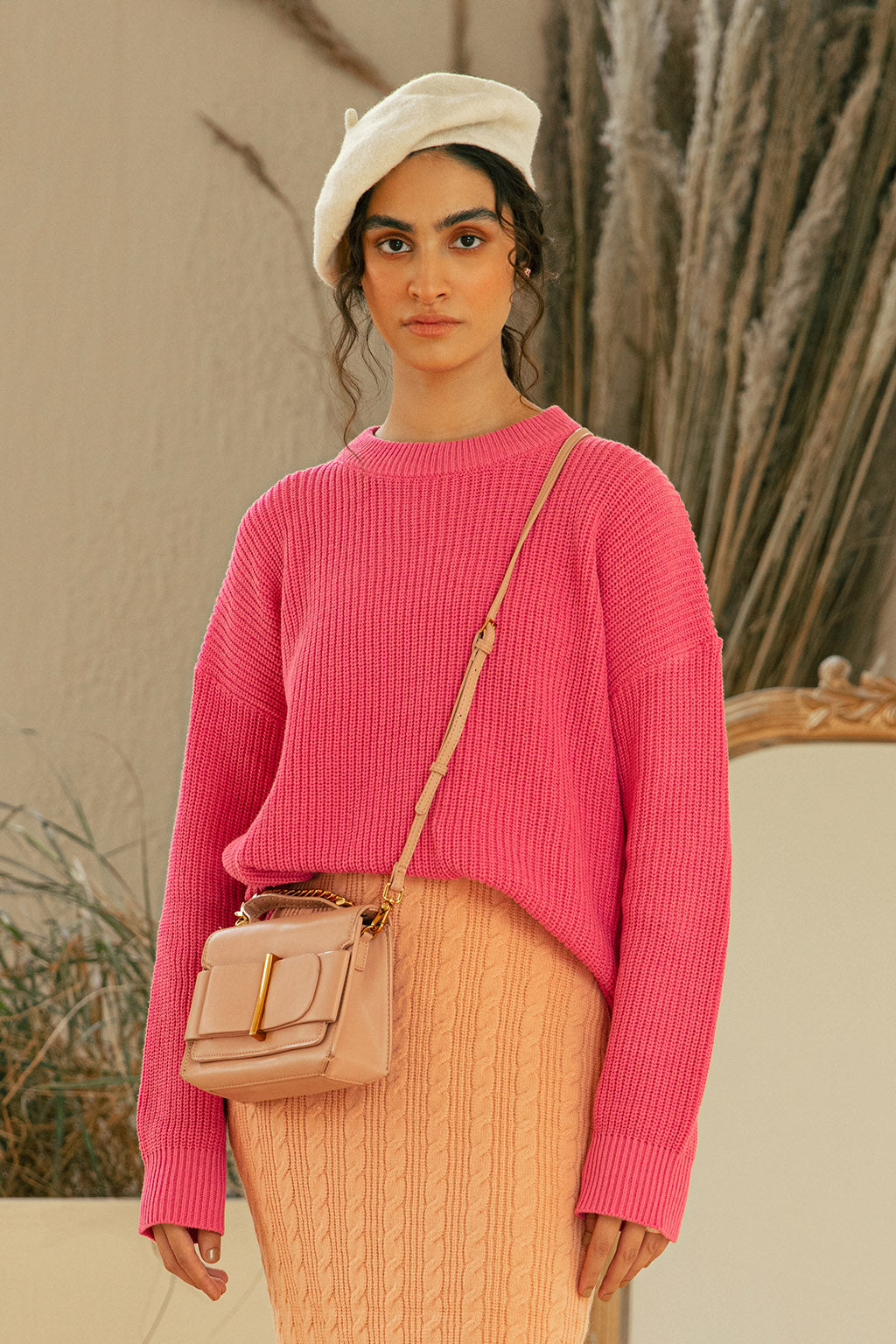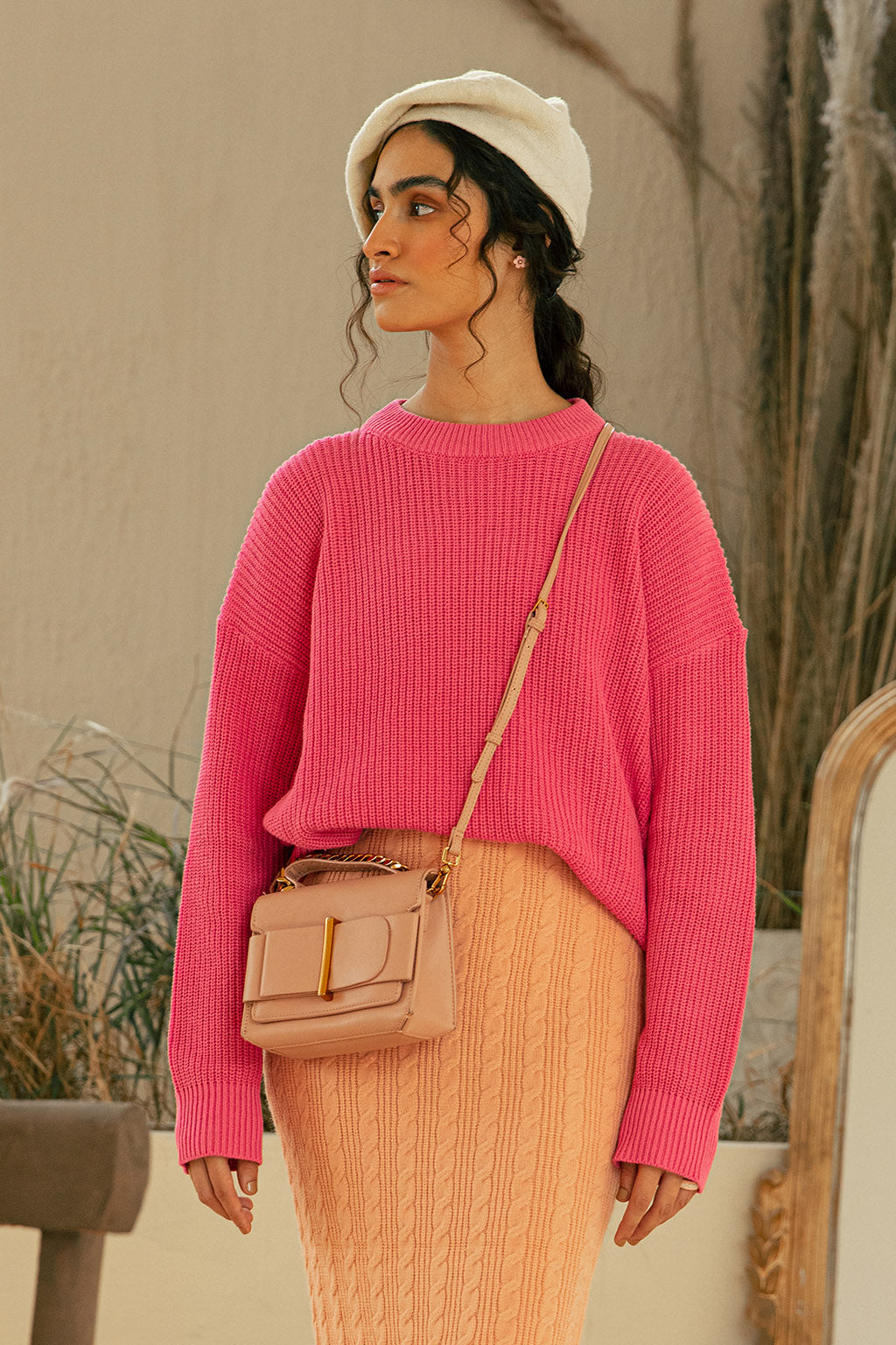 - The trendy sweater in fuchsia will quickly become your winter ally. The loose fit silhouette is accented by a high round neckline and long sleeves. Bundle yours on with jeans, or Formal pants ankle boots and a wool overcoat.
