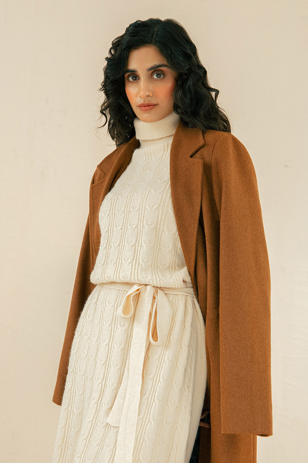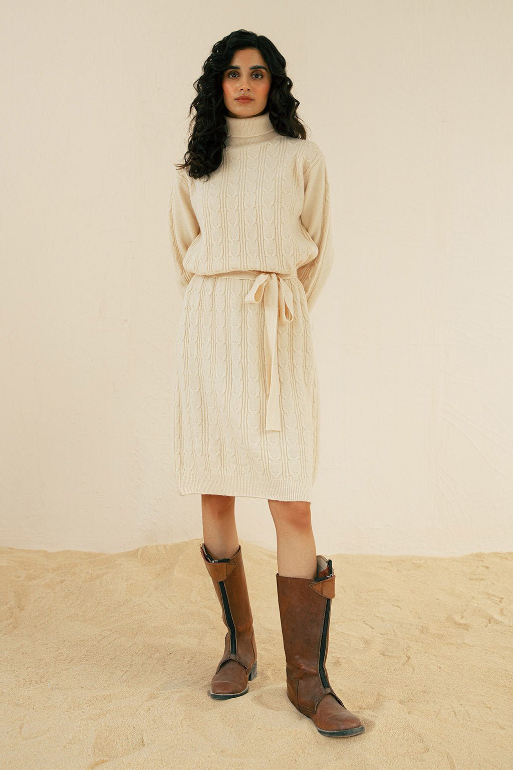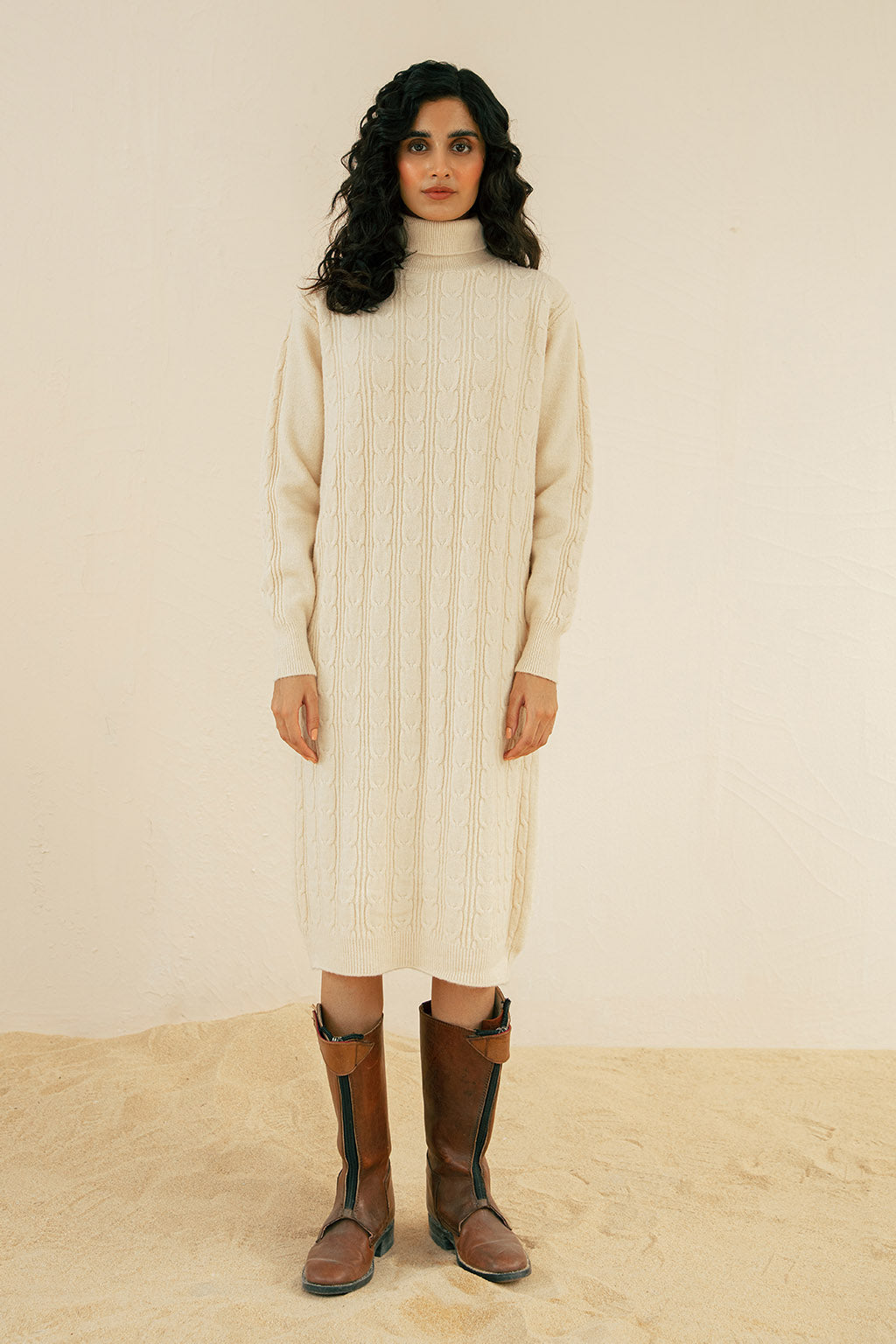 - Thick cable knits of this white Long sweater dress add a textural finish to outfits. It's knitted to a body hugging shape with a turtle neckline, long sleeves and ribbed cuffs. Wear it for a chic winter edit.
