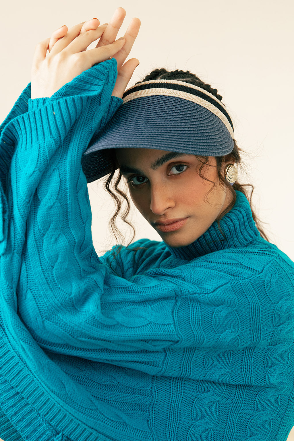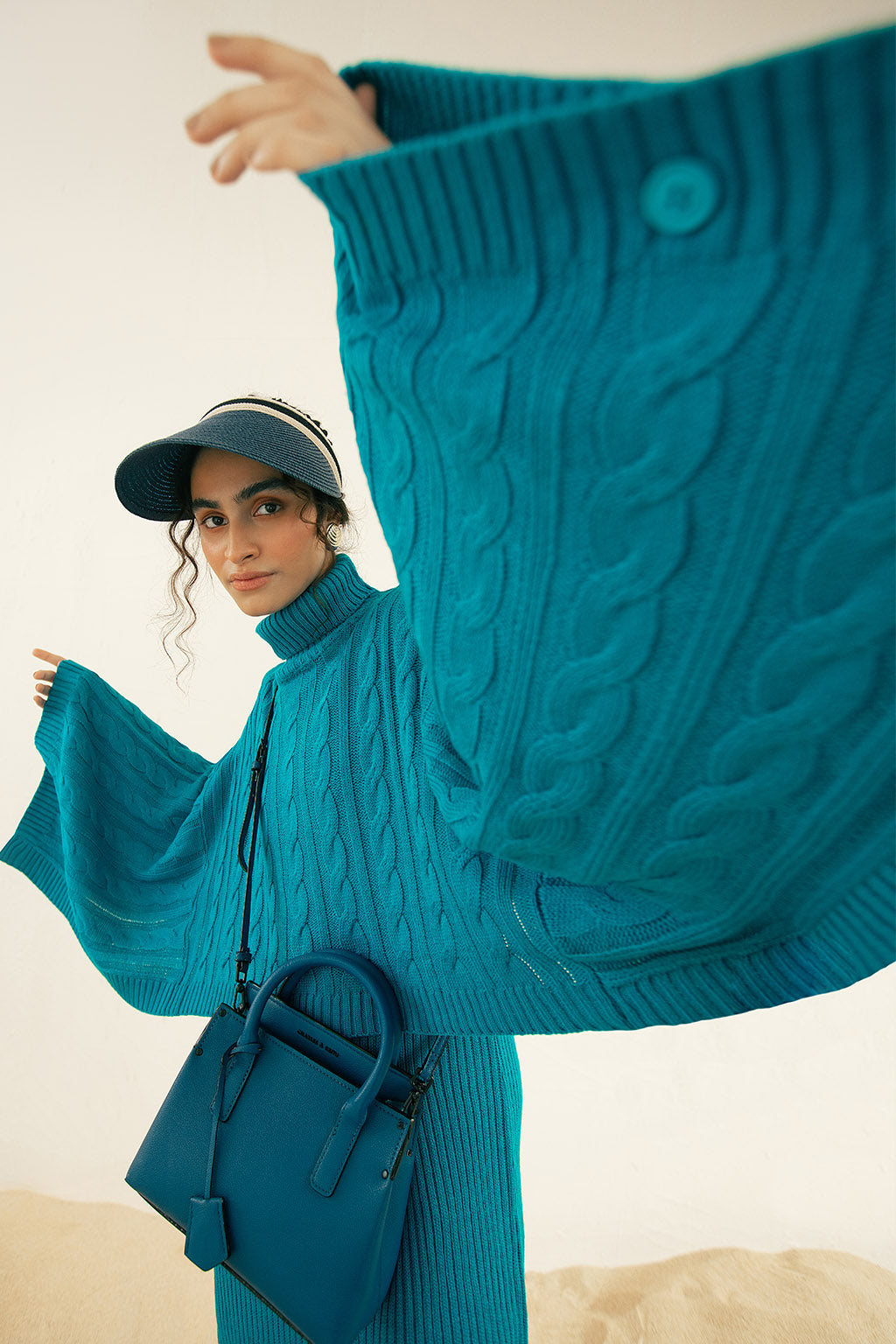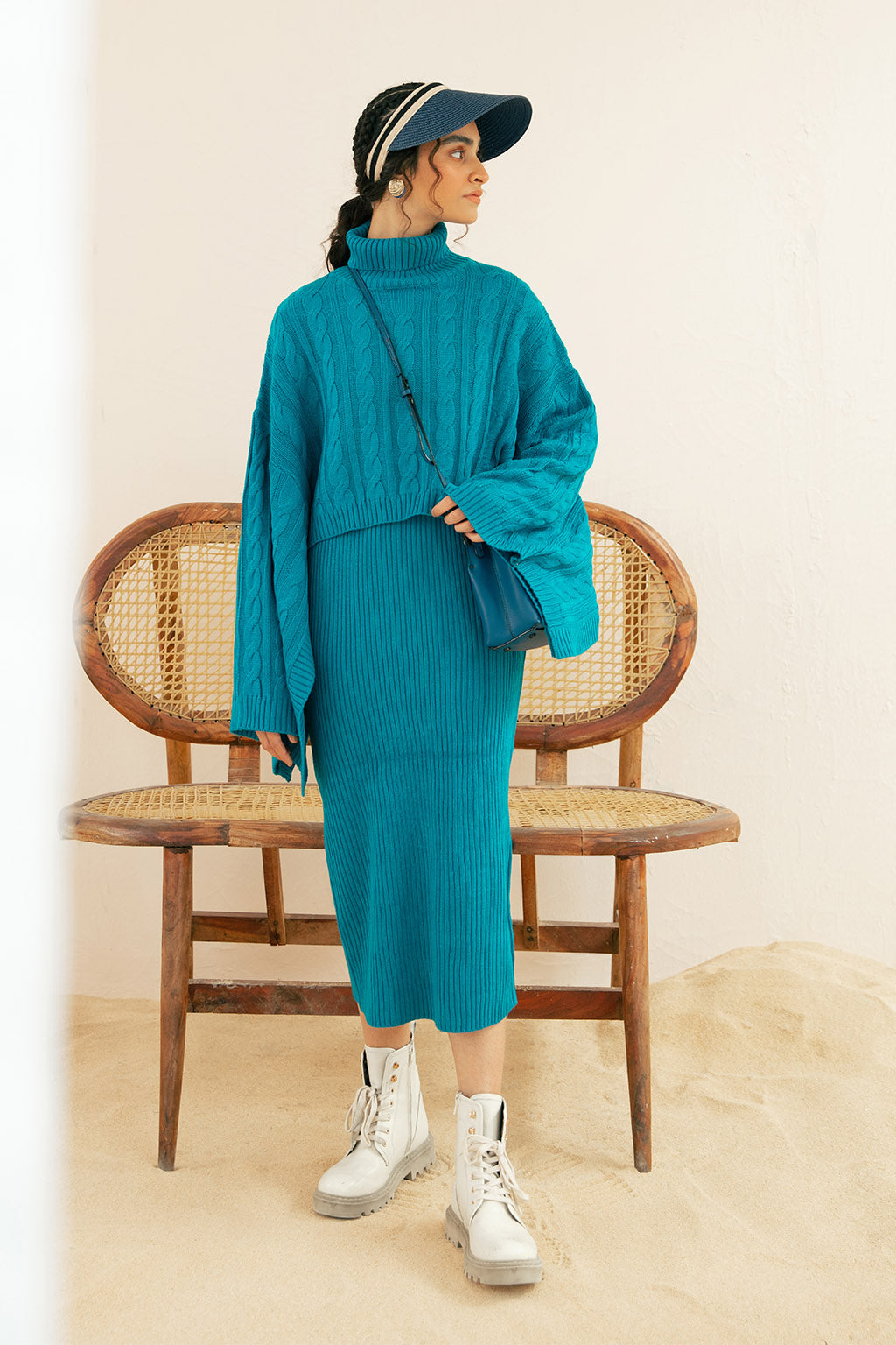 - Knitted with a modern cable-knit design, this trendy blue matching separate will quickly become your winter ally. The loose silhouette is accented by a crew neckline and long baggy sleeves. Paired with matching long dress