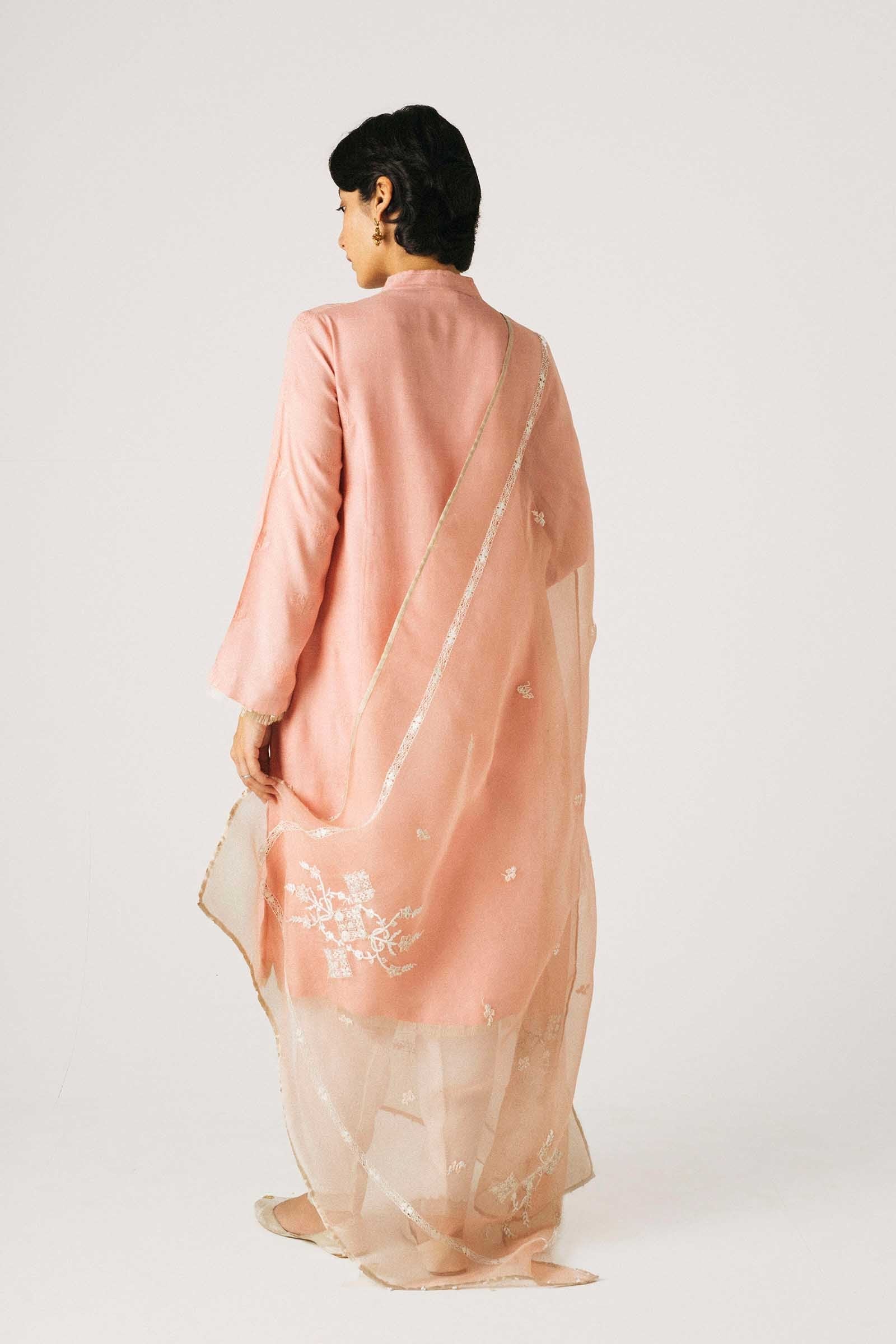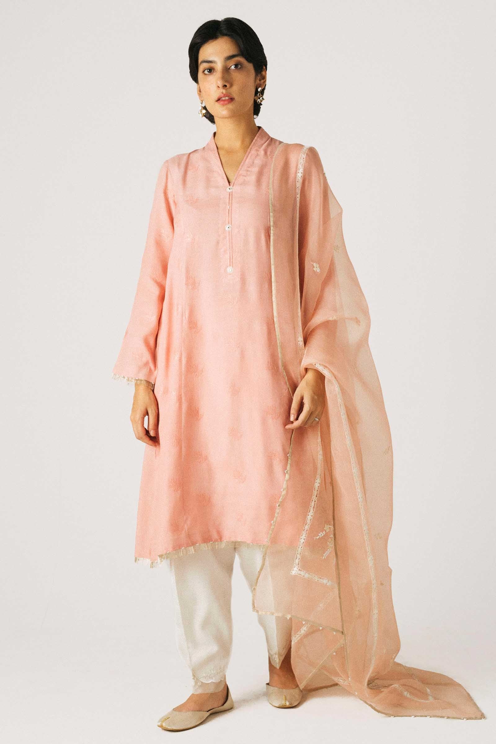 Flamingo pink regular-fit kurta with cross-stitch and sequin embroidery all over paired with an ivory tapered shalwar with embroidery. Adding on to our timeless classic, we have paired this ensemble with a beautifully hand-crafted taarkashi dupatta, detailed with mirror work.