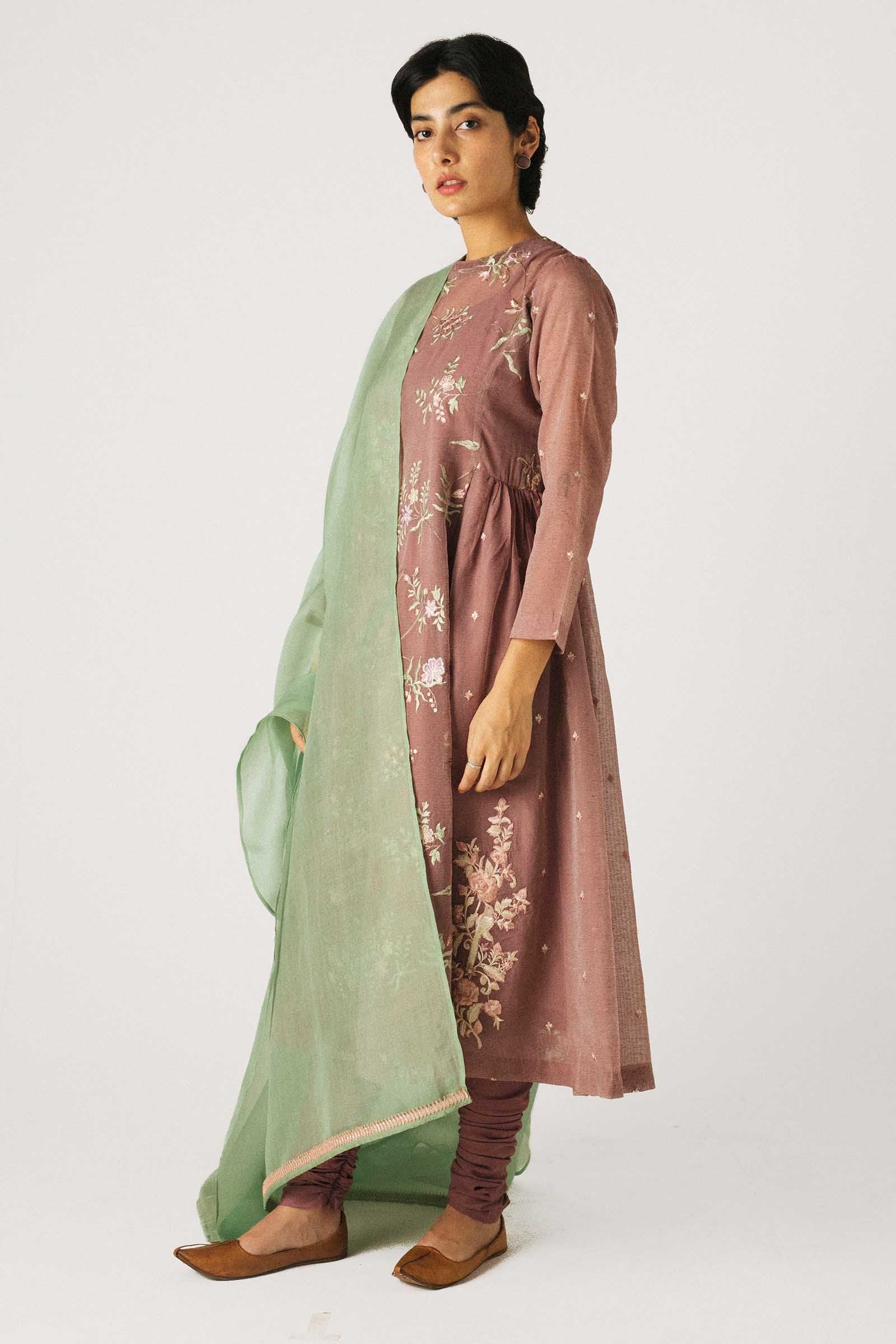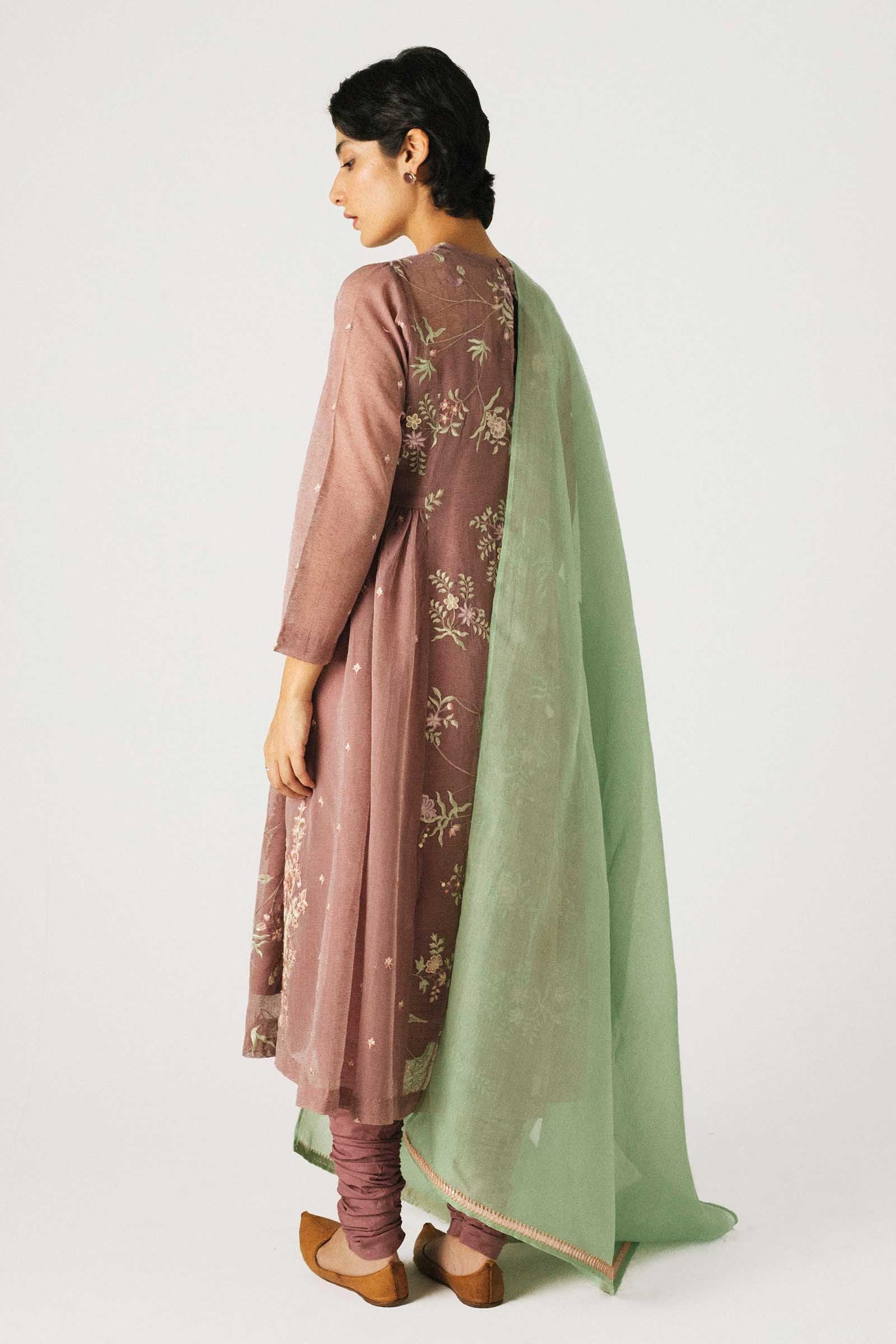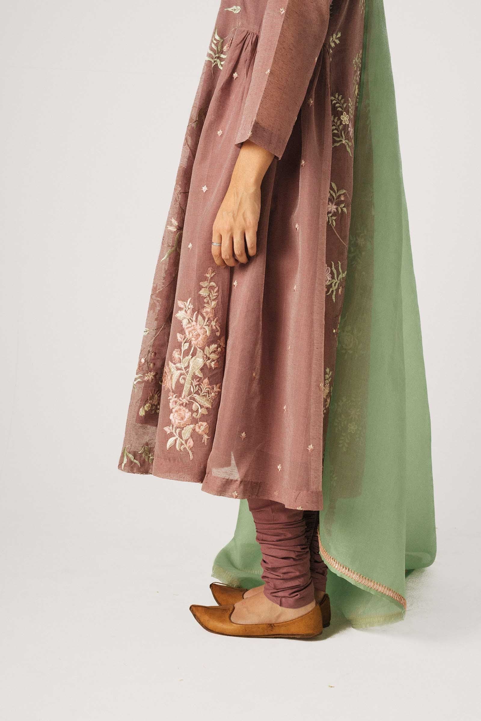 Mauve flared peshwas with embroidery all over, paired with our signature zipped chooridar in same color and aquamarine dupatta. Pair it with antique gold anklets.