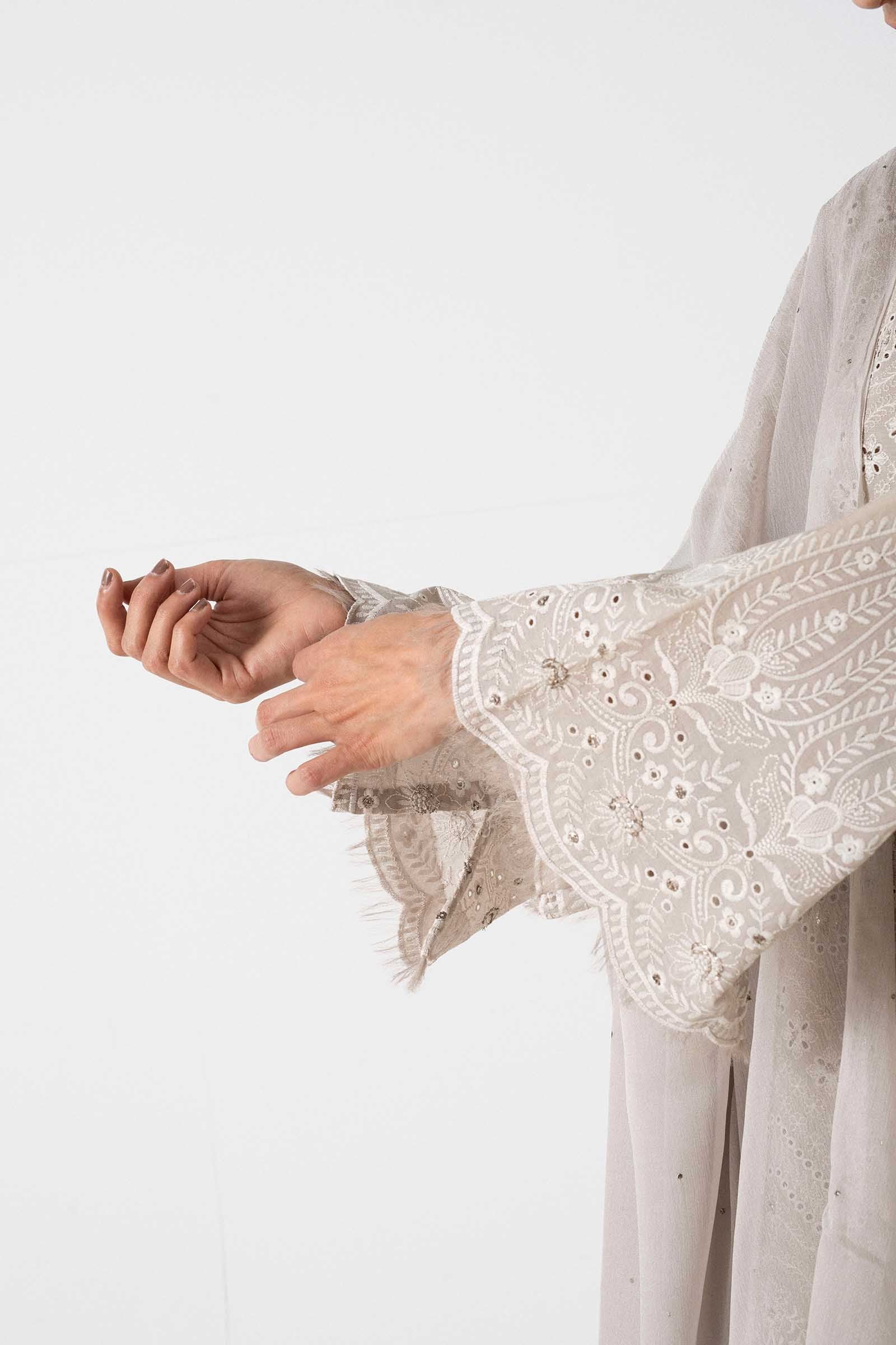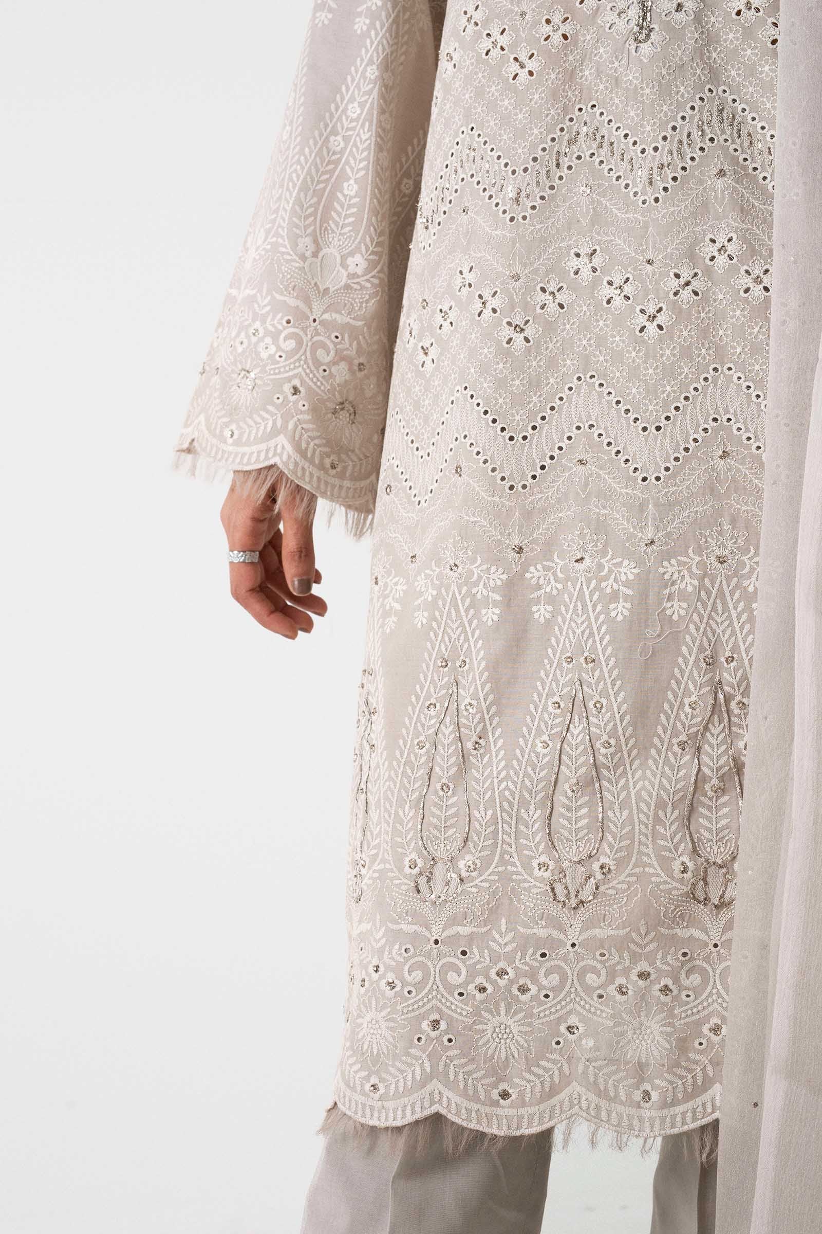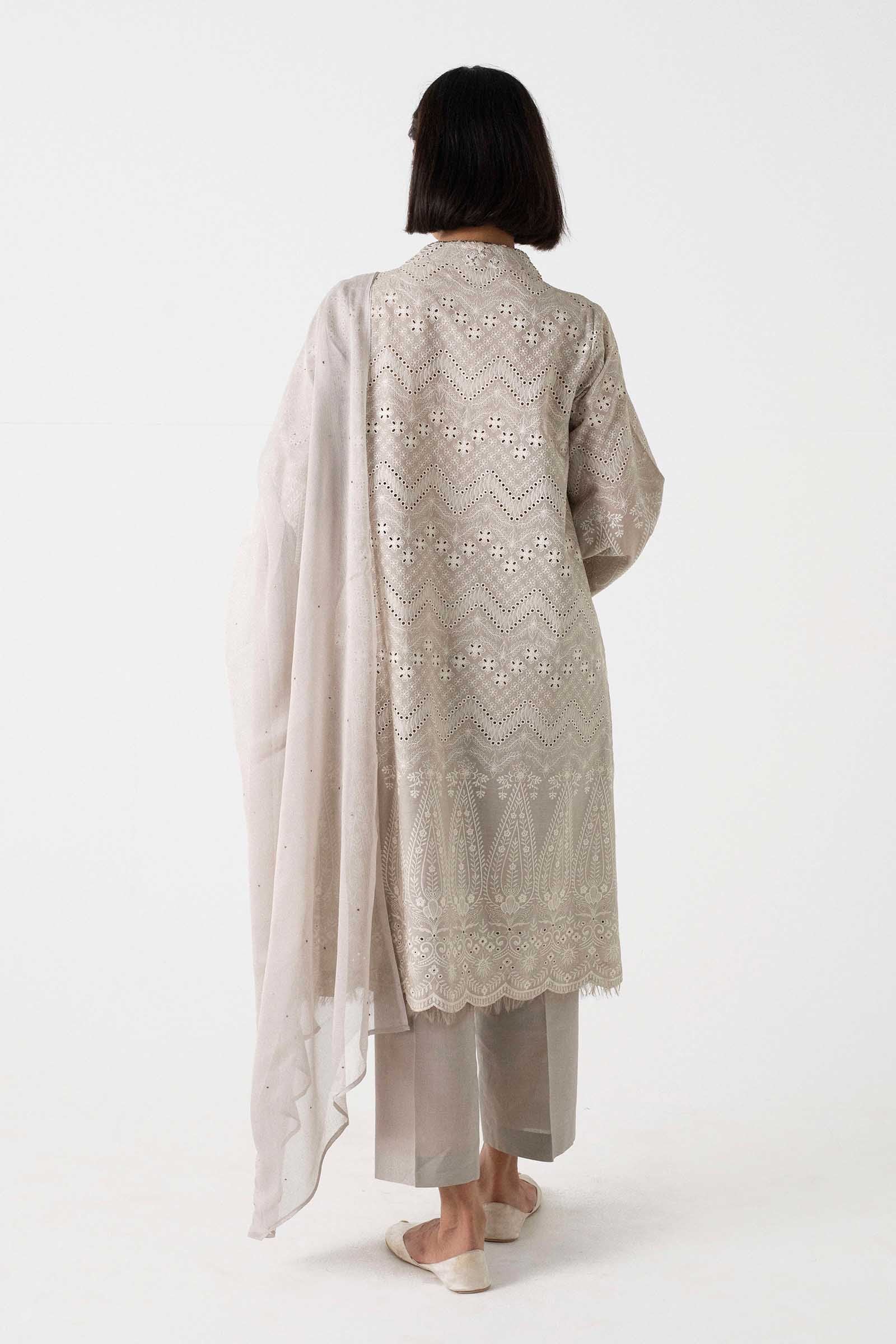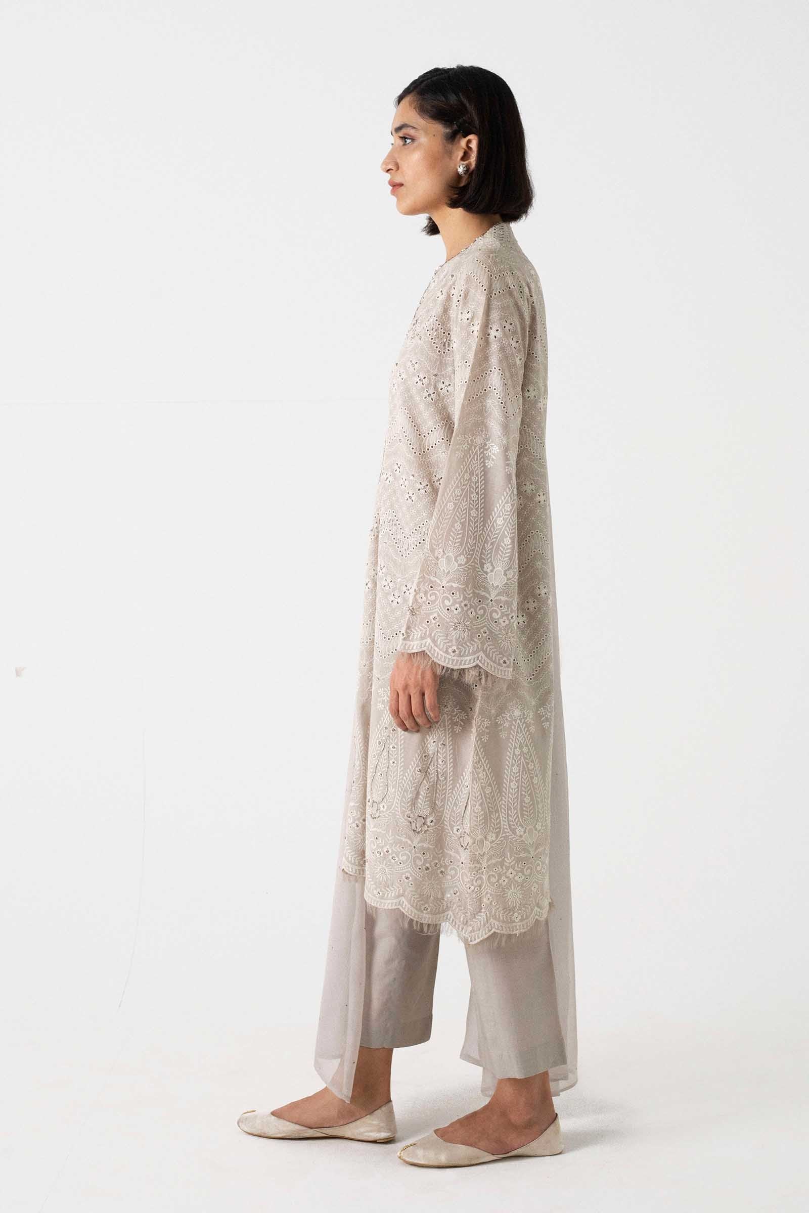 Smoke grey straight fit customized chikan embroidered kurta highlighted with Naqshi work all over, paired with a regular fit shalwar and a mukesh dupatta.
